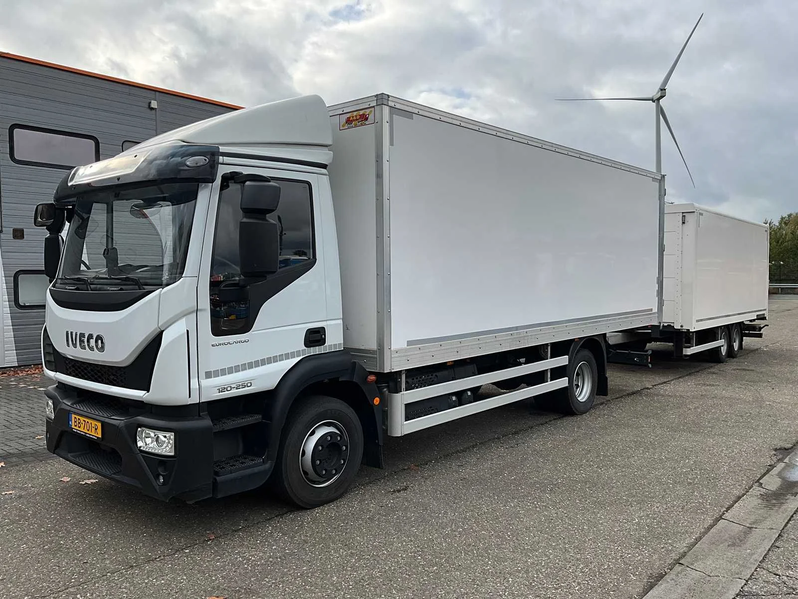 Slechts 8826 kilometer, 2024 Iveco Euro Cargo 120-250, Lesvoertuig met extra pedalen aan bijrijders kant, elektrische ramen en spiegels, airco, digitale tachograaf, 3 persoons zitting, leeggewicht 6125kg, laadvermogen 5872kg, Aluvan gesloten opbouw, binnen afmetingen laadruimte LxBxH 6300x2500x2000mm, rockinger vangmuil 2021 A&D ZA18 2-assige wipkar aanhanger, APK 2-10-2026, leeggewicht 3610kg, laadvermogen 7890kg, afmetingen laadruimte LxBxH 6000x2500x2000mm Nee Kenteken: BB-701-R Merk: Iveco Type: Euro Cargo 120-250 Bouwjaar: 2024 Chassisnummer VIN: ZCFAH1EJ402730219 Cilinderinhoud: 6728cc Kilometerstand bij opname: 9260km APK vervaldatum: 2026-10-01 Datum eerste toelating: 2024-02-26 Type transmissie: Handmatig Aantal assen: 2 Asconfiguratie: 4x2 Fuel Type: Diesel Laadvermogen: 5862kg Emissieklasse: 6 Nationaliteit documenten: Nederland Kentekenpapieren compleet?: true Aantal zitplaatsen: 3 Zelf rijdend exporteren: Mogelijk Handgeschakelde versnellingsbak: true