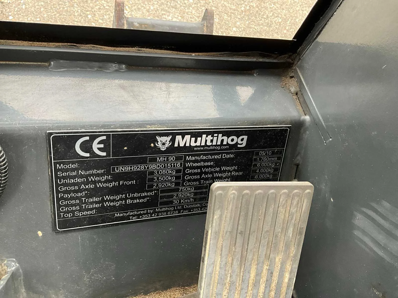 Hydrostatische aandrijving 30KM/H, knikbesturing, fronthef t.b.v. werktuigen, Yanmar 4-cilinder diesel motor, Sper, airconditioning, kachel, joystick bediening Nee Merk: Multihog Type: MH90 Bouwjaar: 2010 Serienummer: UN9H928Y9BD015116 Kenteken: T-03-DPH Afgelezen urenstand: 1024 Versnellingsbaktype: Hydrostatisch Aantal hydraulische ventielen voor: 4 Aantal hydraulische ventielen achter: 4 Bandenmaat voor: 315/55R16 Bandenmaat achter: 315/55R16 Fronthefinrichting: true Cabine: true Luchtgeveerde stoel: true Eigen gewicht: 3080kg Totale afmeting L: 3600mm Totale afmeting Breedte: 1700mm Totale afmeting Hoogte: 2400mm Kentekenpapieren compleet?: true Datum eerste toelating: 2012-02-14 Nationaliteit documenten: Nederland