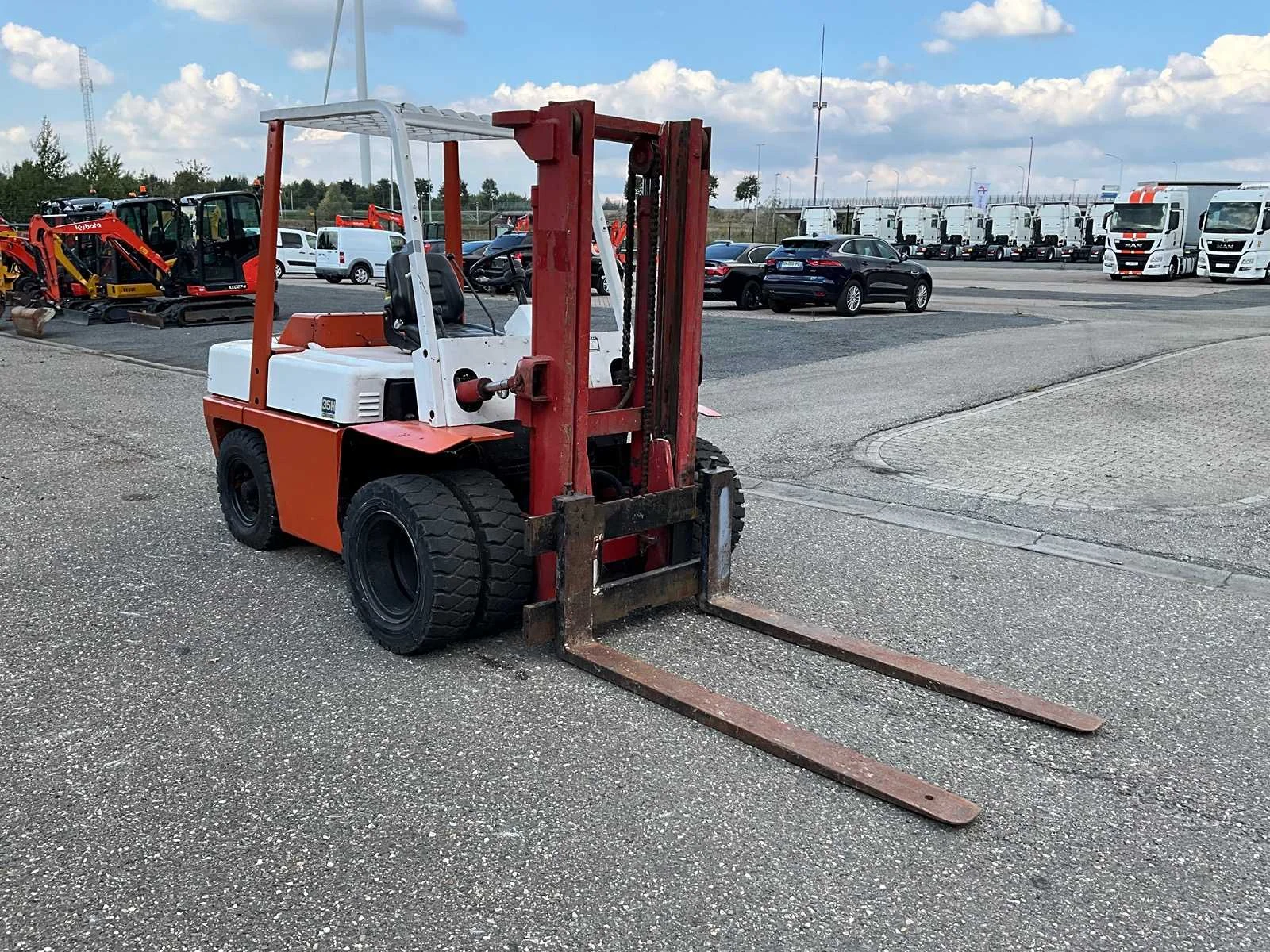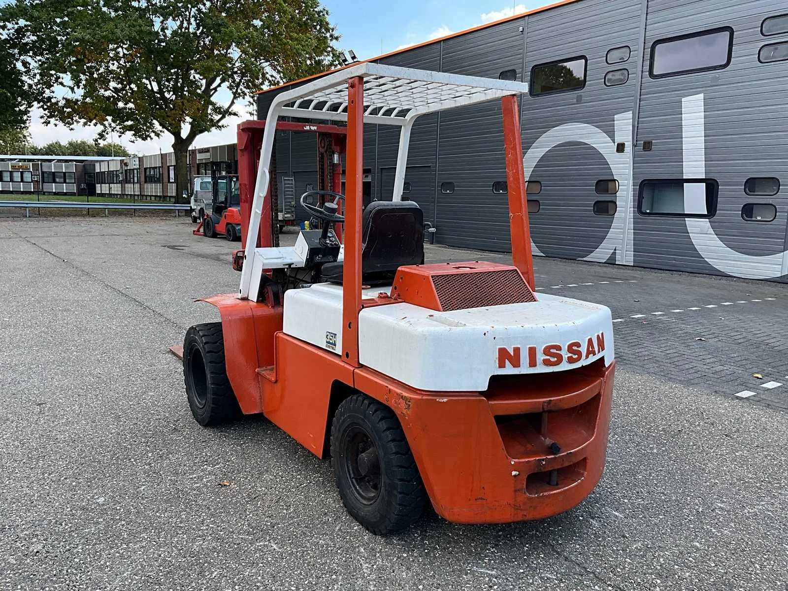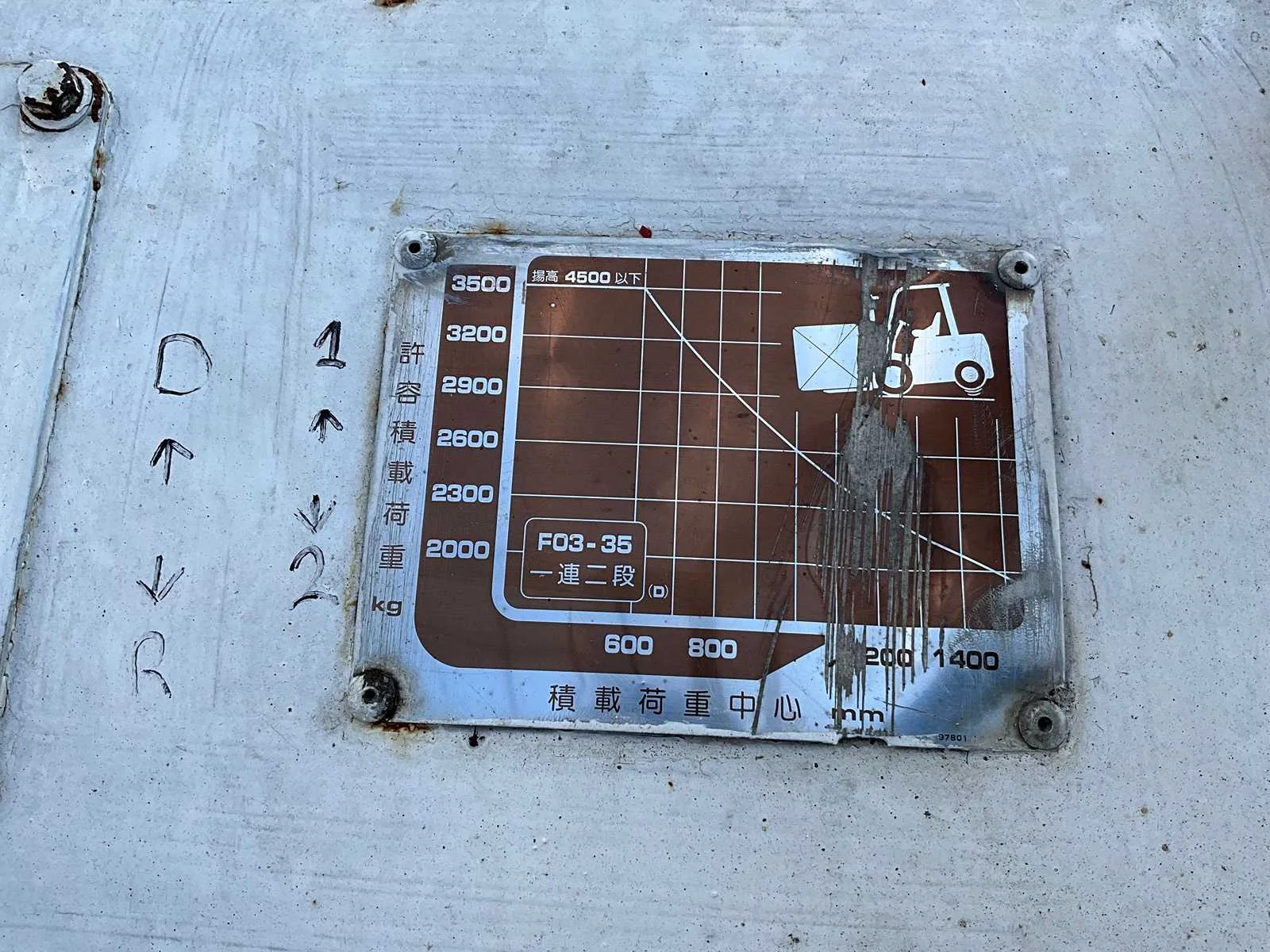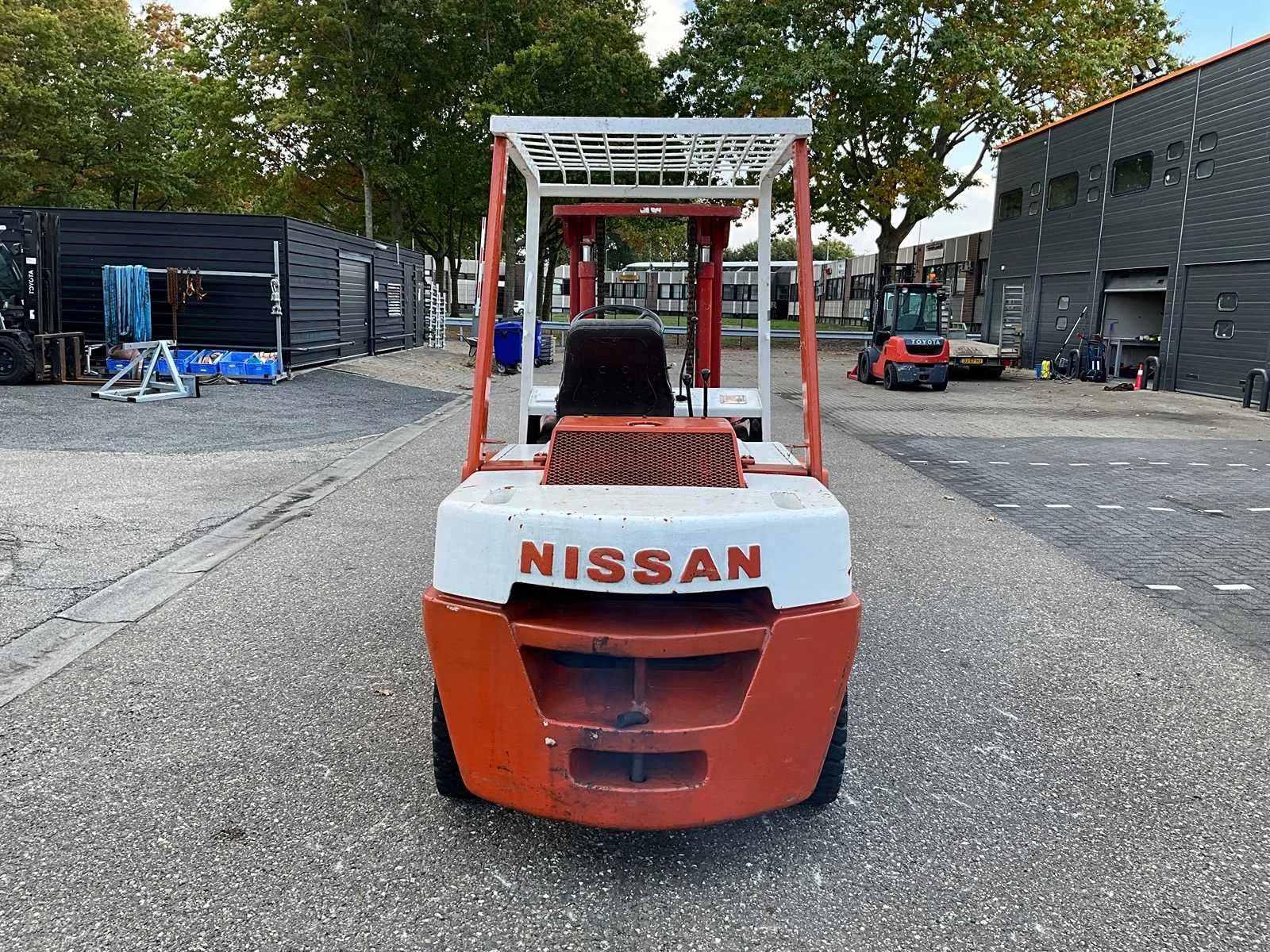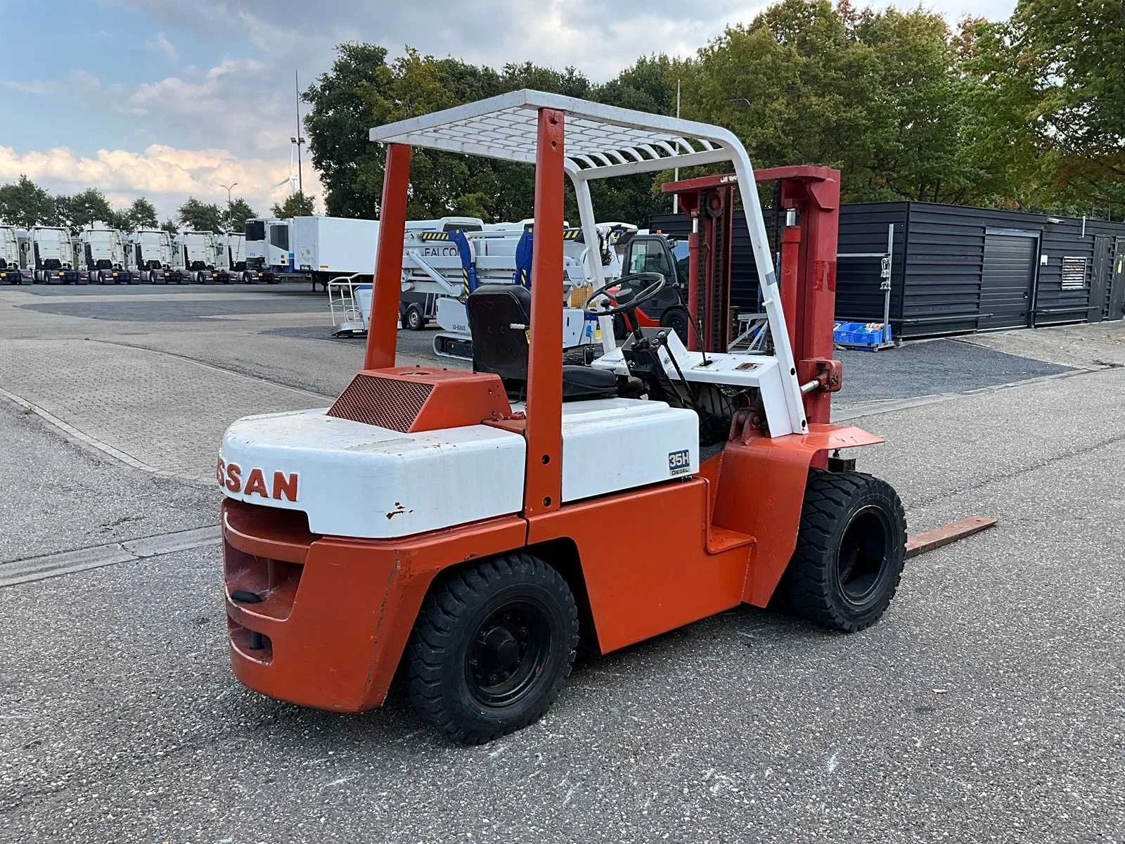 Breedte vorkenbord 1200mm, 2 rijsnelheden vooruit/achteruit, Nissan SD33 6-cilinder diesel motor Nee Merk: Nissan Type: 35H Serienummer: YF03-000288 Brandstof: Diesel Duplex mast: true Eigen gewicht: 5690kg Hefvermogen: 3500kg Lepellengte: 1650mm Hefhoogte: 2900mm Luchtbanden: true Minimale doorrijhoogte: 2250mm Diesel: true