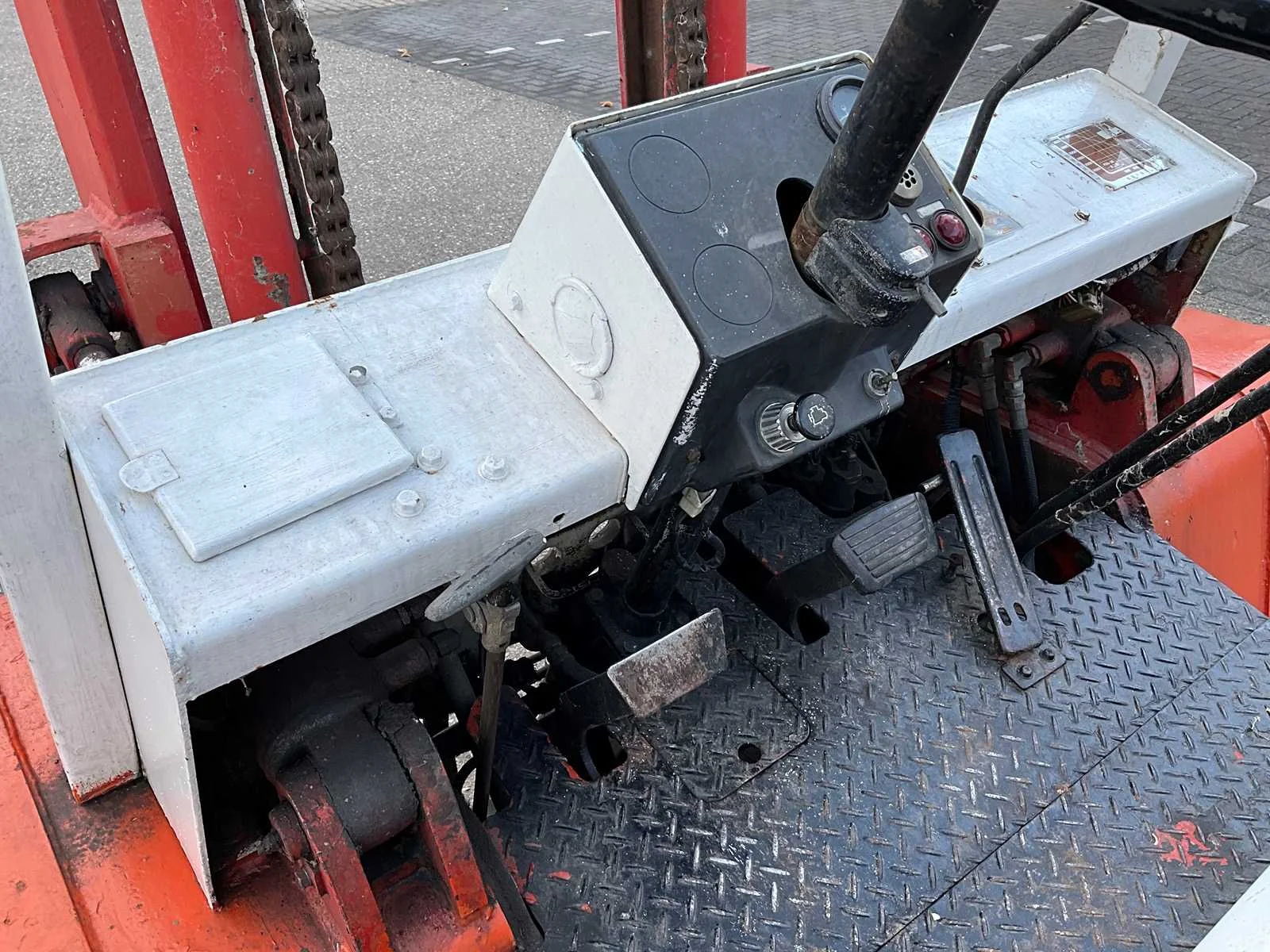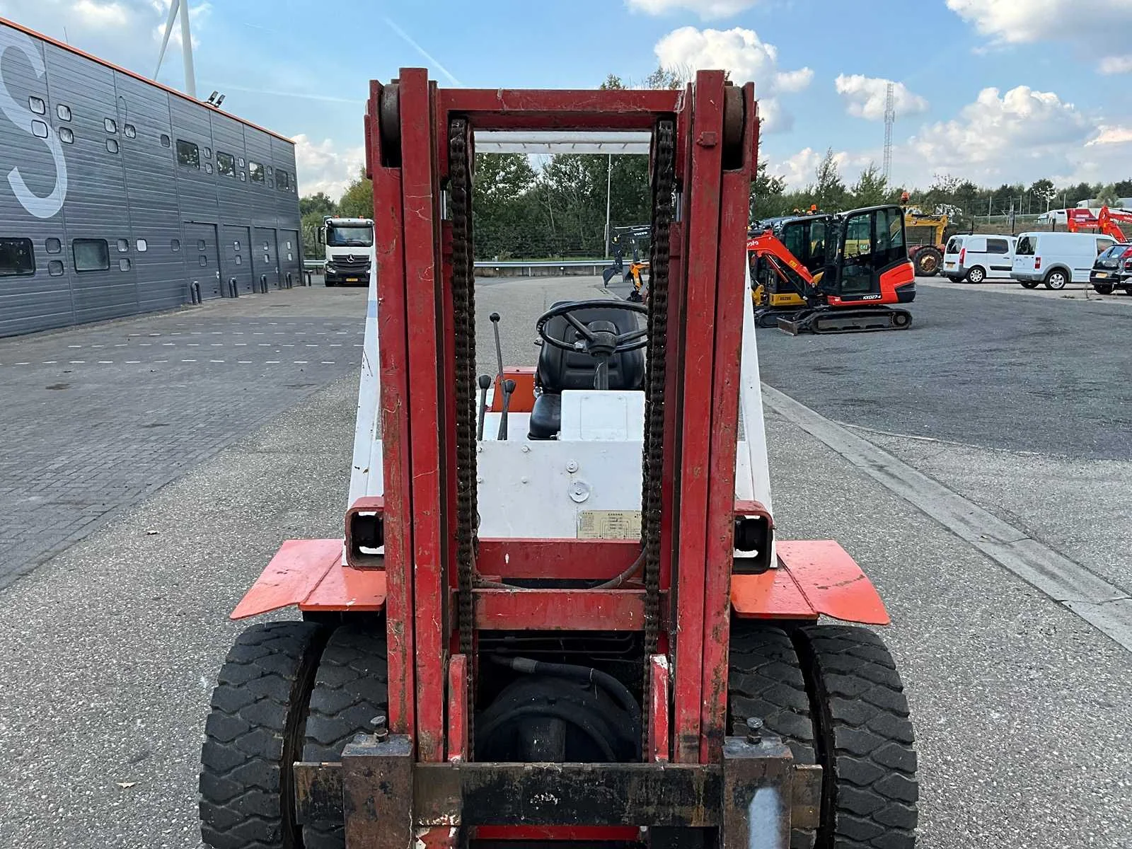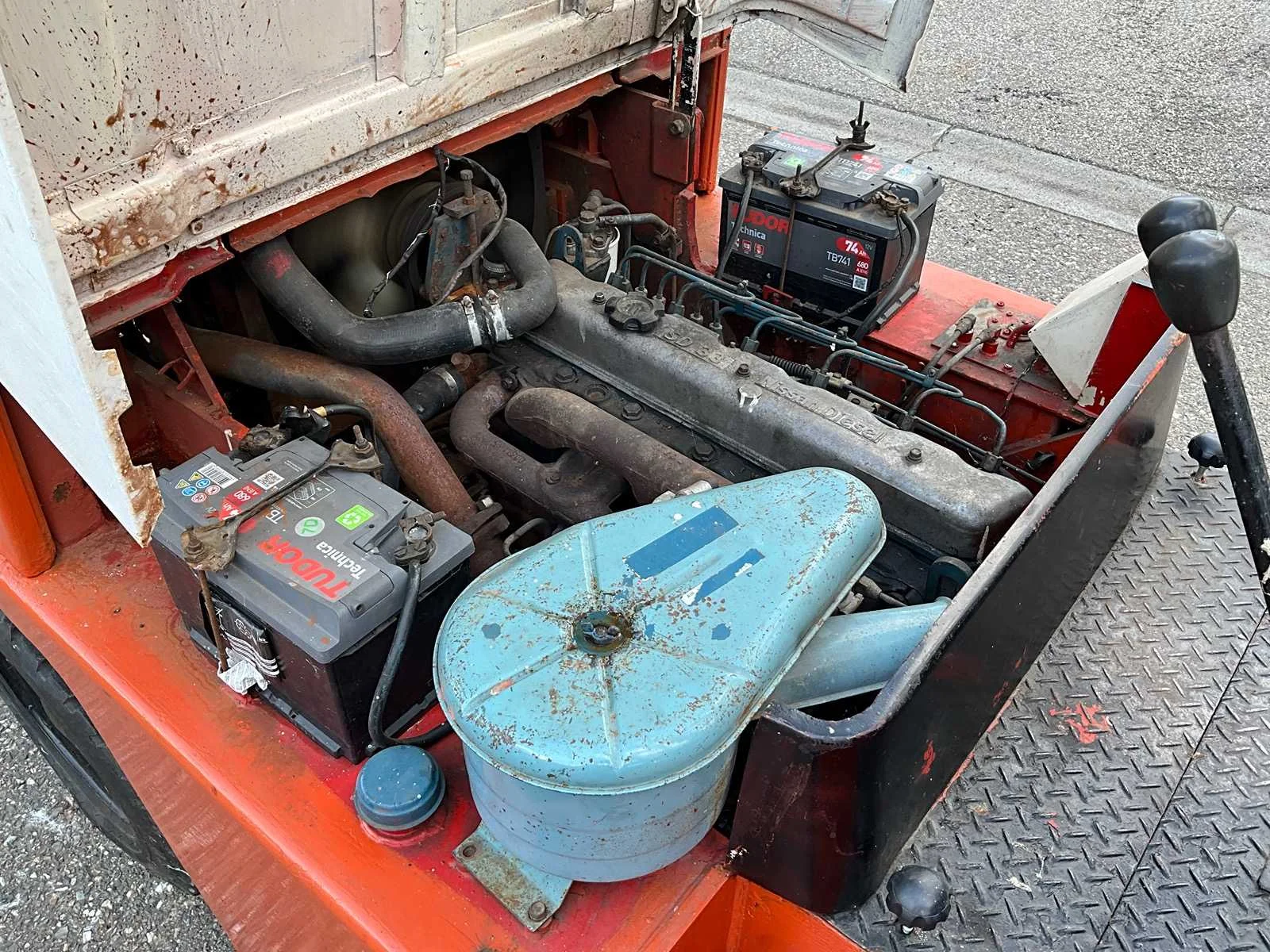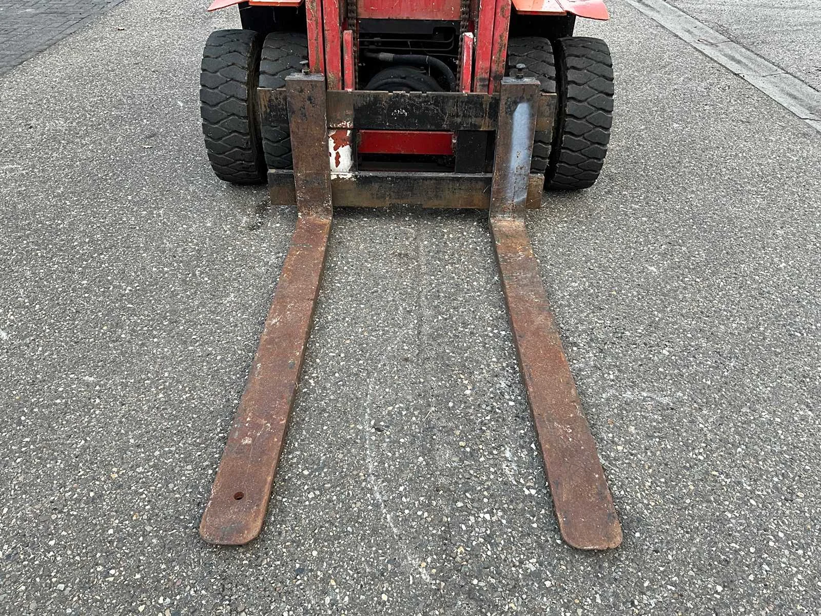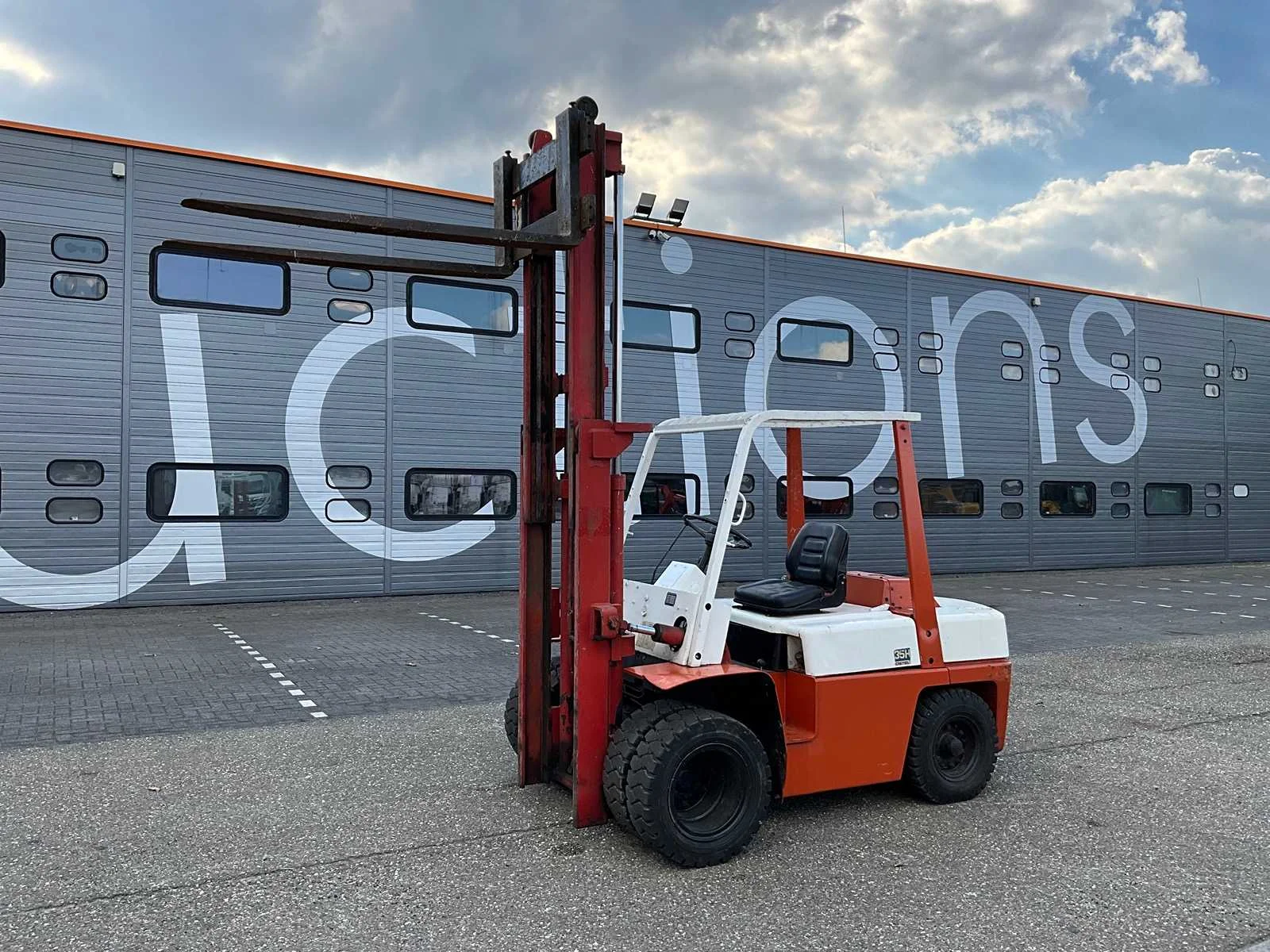 Breedte vorkenbord 1200mm, 2 rijsnelheden vooruit/achteruit, Nissan SD33 6-cilinder diesel motor Nee Merk: Nissan Type: 35H Serienummer: YF03-000288 Brandstof: Diesel Duplex mast: true Eigen gewicht: 5690kg Hefvermogen: 3500kg Lepellengte: 1650mm Hefhoogte: 2900mm Luchtbanden: true Minimale doorrijhoogte: 2250mm Diesel: true