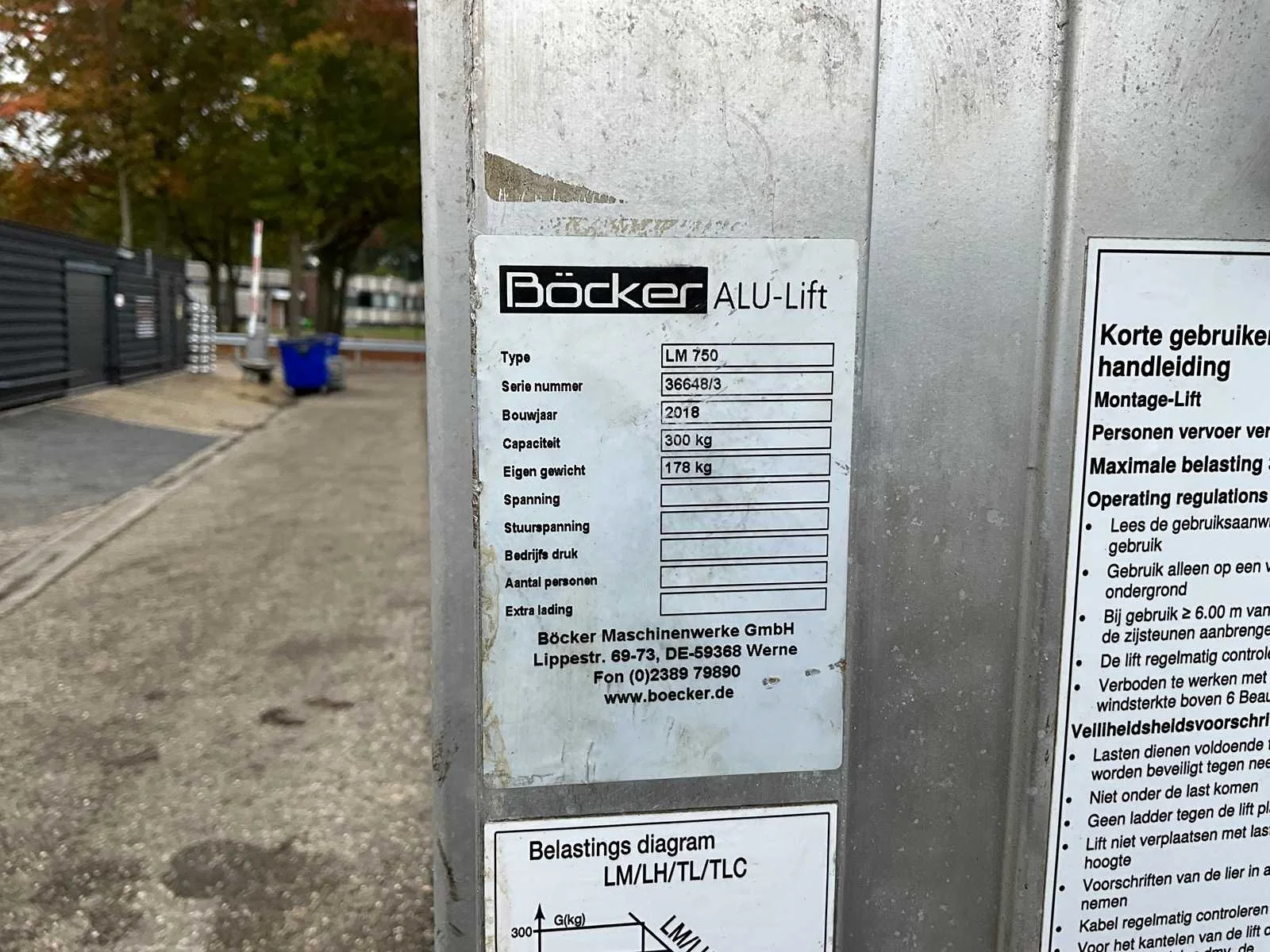 1x 2018 Alu-lift LM750, 1x 2015 Alu-lift LM575 Nee Merk: Bocker Alu-Lift Type: LM750-LM575 Hefvermogen: 300kg Totale afmeting L: 1800mm Totale afmeting Breedte: 1600mm Totale afmeting Hoogte: 2250mm