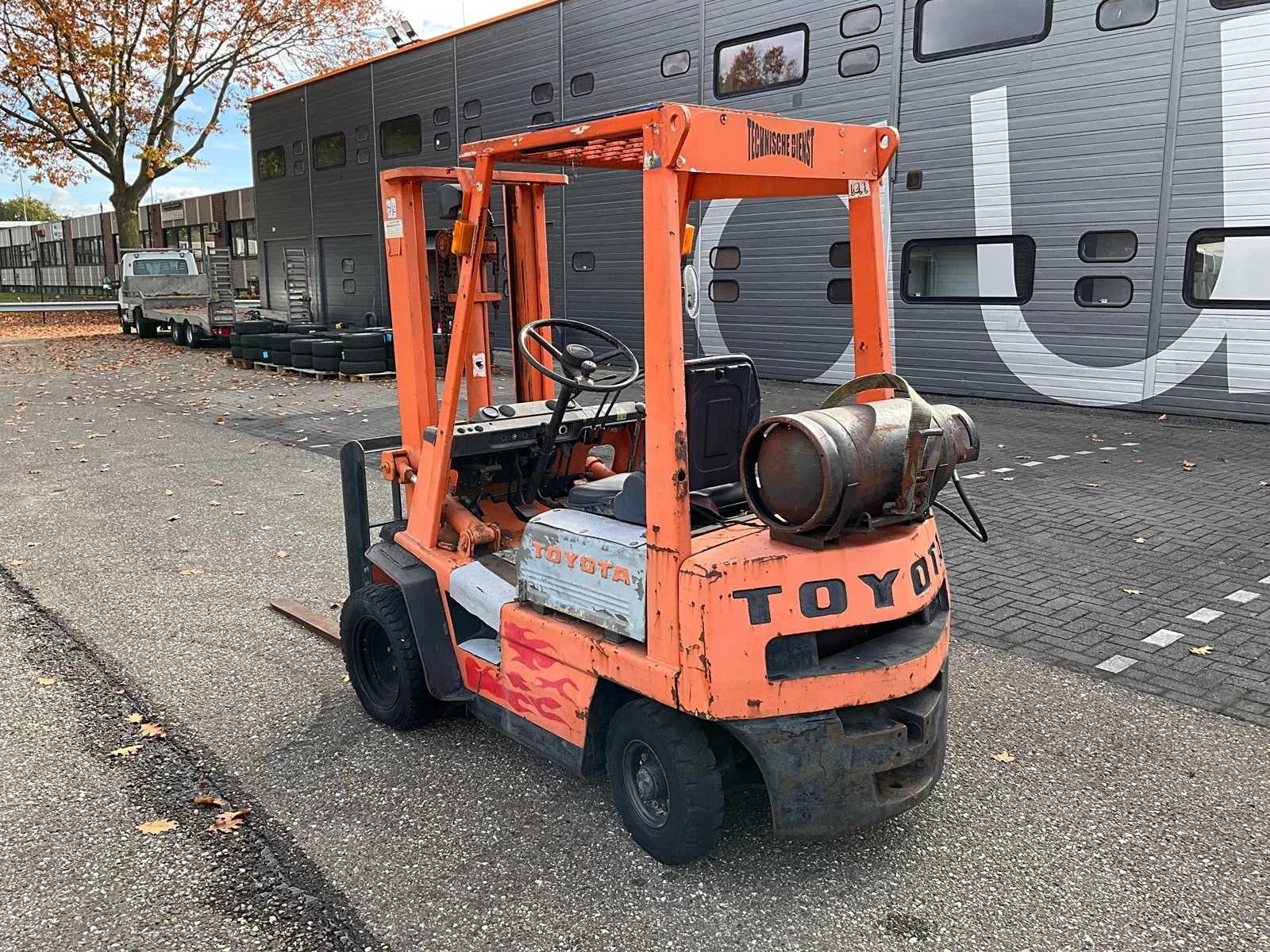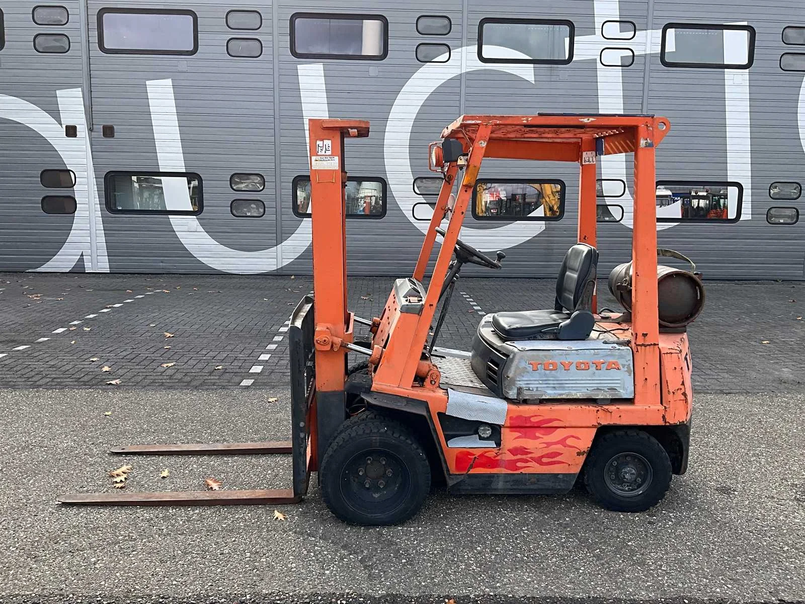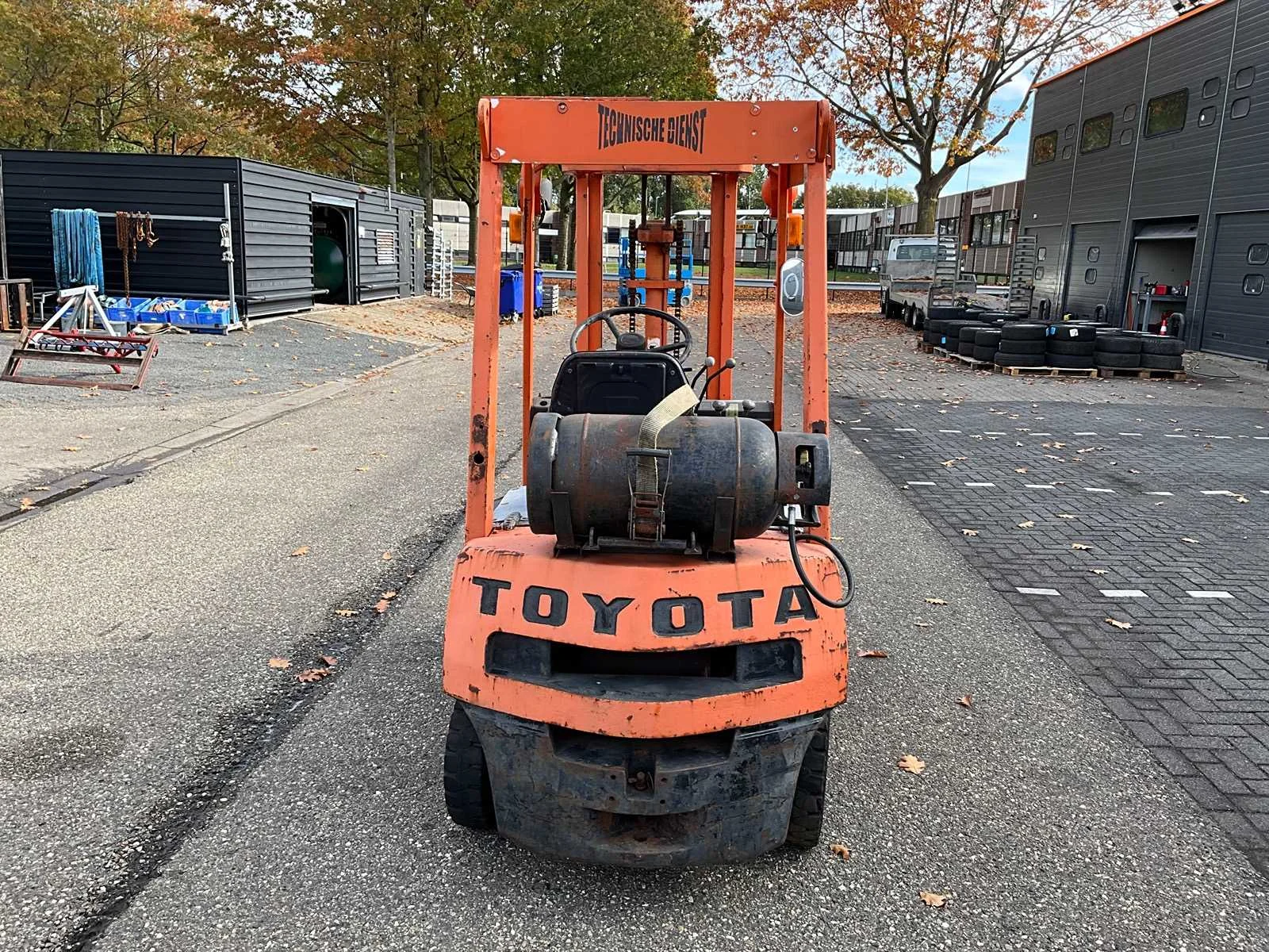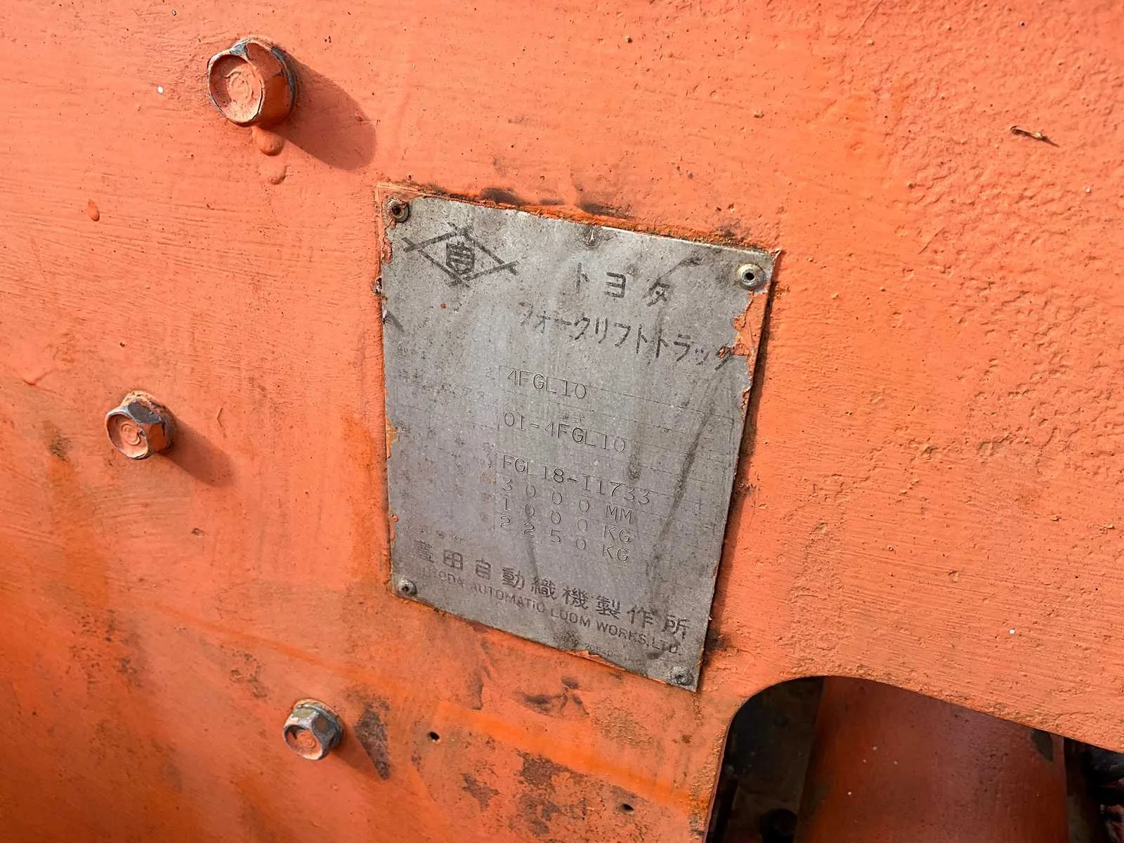 Let op: functioneert niet Nee Merk: Toyota Type: 4FGL10 Serienummer: 11733 Brandstof: LPG Aantal wielen: 4 Duplex mast: true Eigen gewicht: 2250kg Hefvermogen: 1000kg Lepellengte: 1200mm Luchtbanden: true Minimale doorrijhoogte: 2050mm Totale afmeting L: 3400mm Totale afmeting Breedte: 1300mm Totale afmeting Hoogte: 2050mm LPG: true