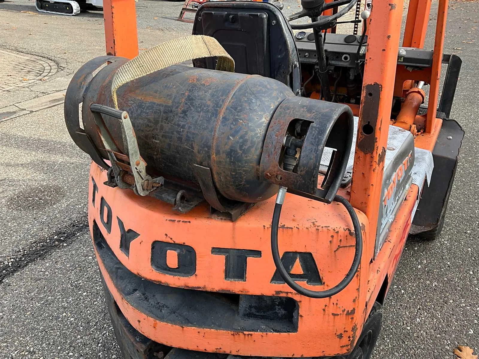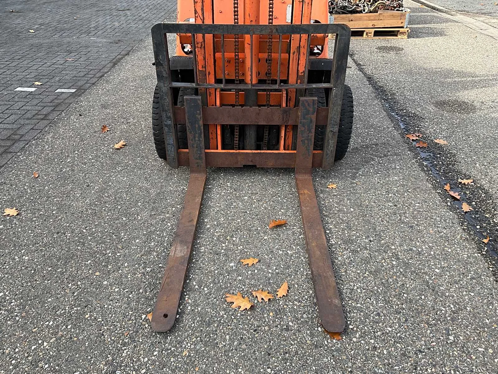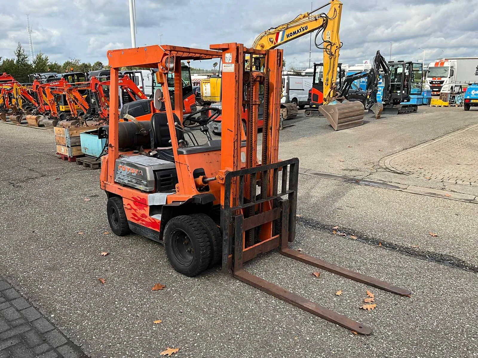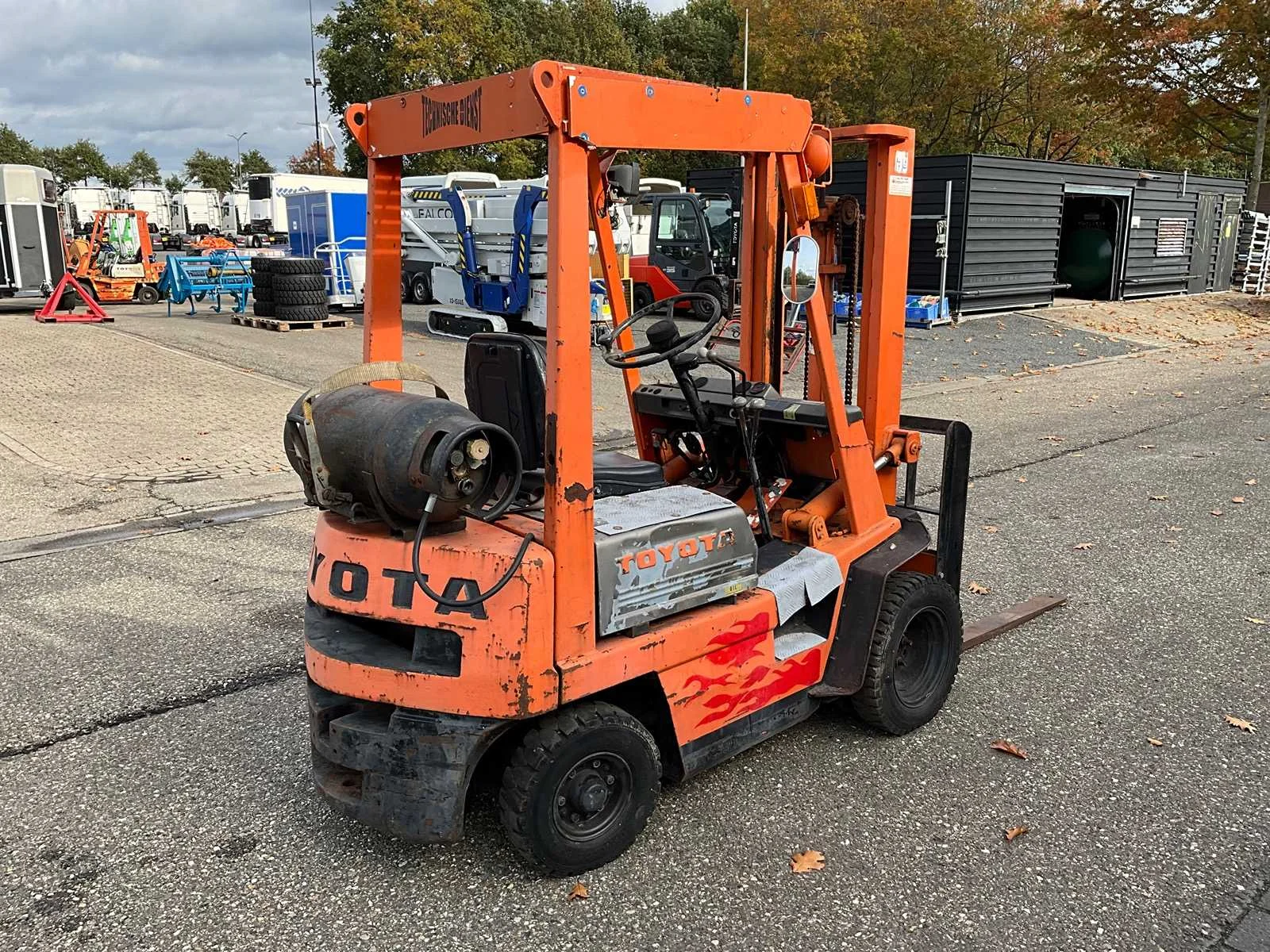 Let op: functioneert niet Nee Merk: Toyota Type: 4FGL10 Serienummer: 11733 Brandstof: LPG Aantal wielen: 4 Duplex mast: true Eigen gewicht: 2250kg Hefvermogen: 1000kg Lepellengte: 1200mm Luchtbanden: true Minimale doorrijhoogte: 2050mm Totale afmeting L: 3400mm Totale afmeting Breedte: 1300mm Totale afmeting Hoogte: 2050mm LPG: true