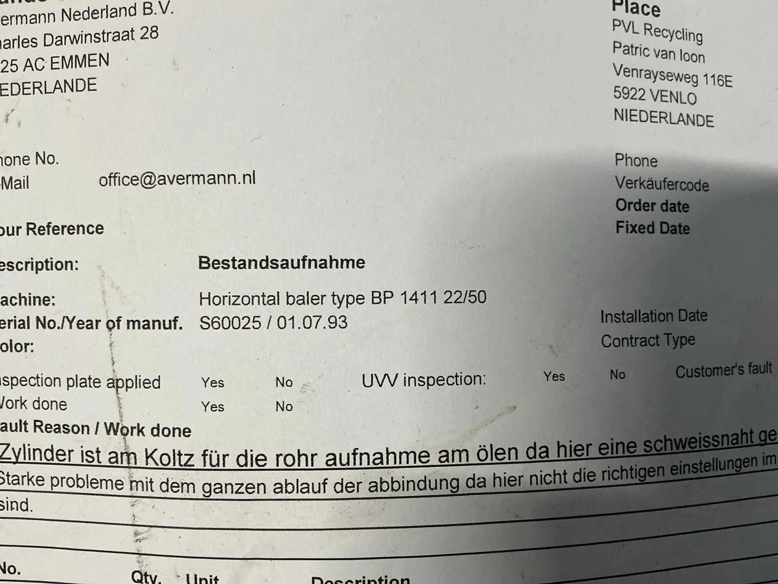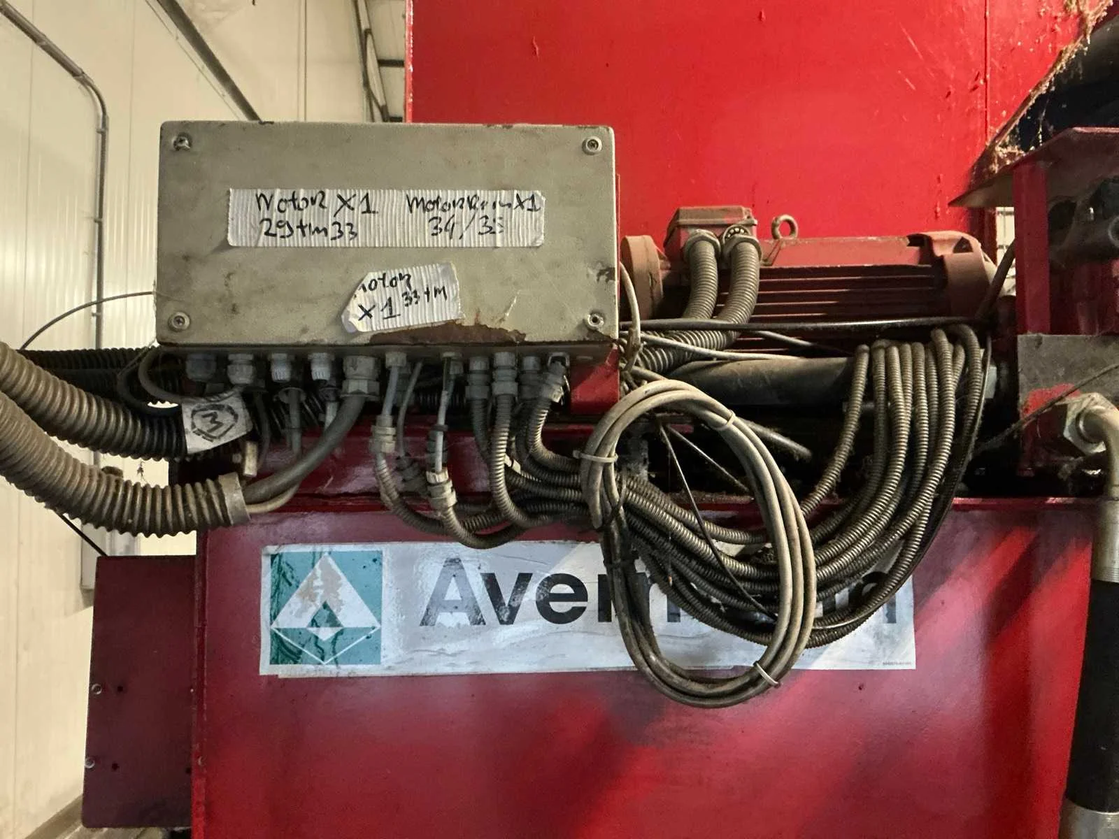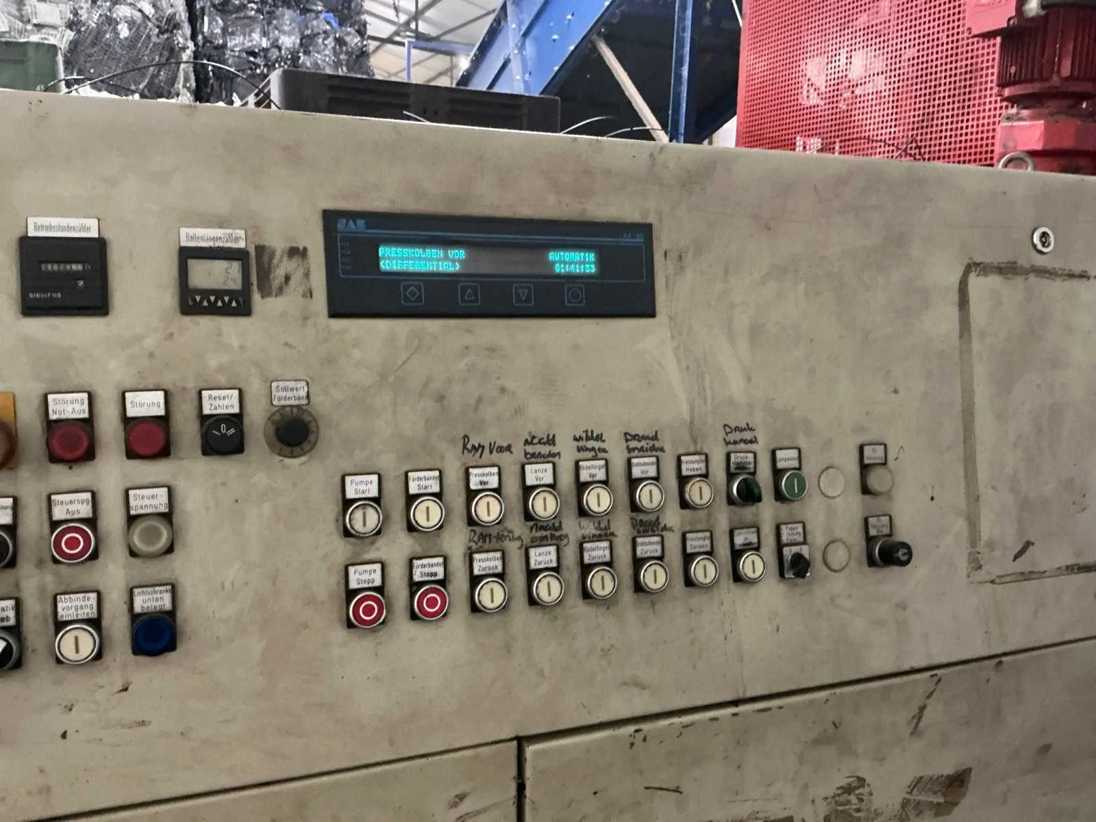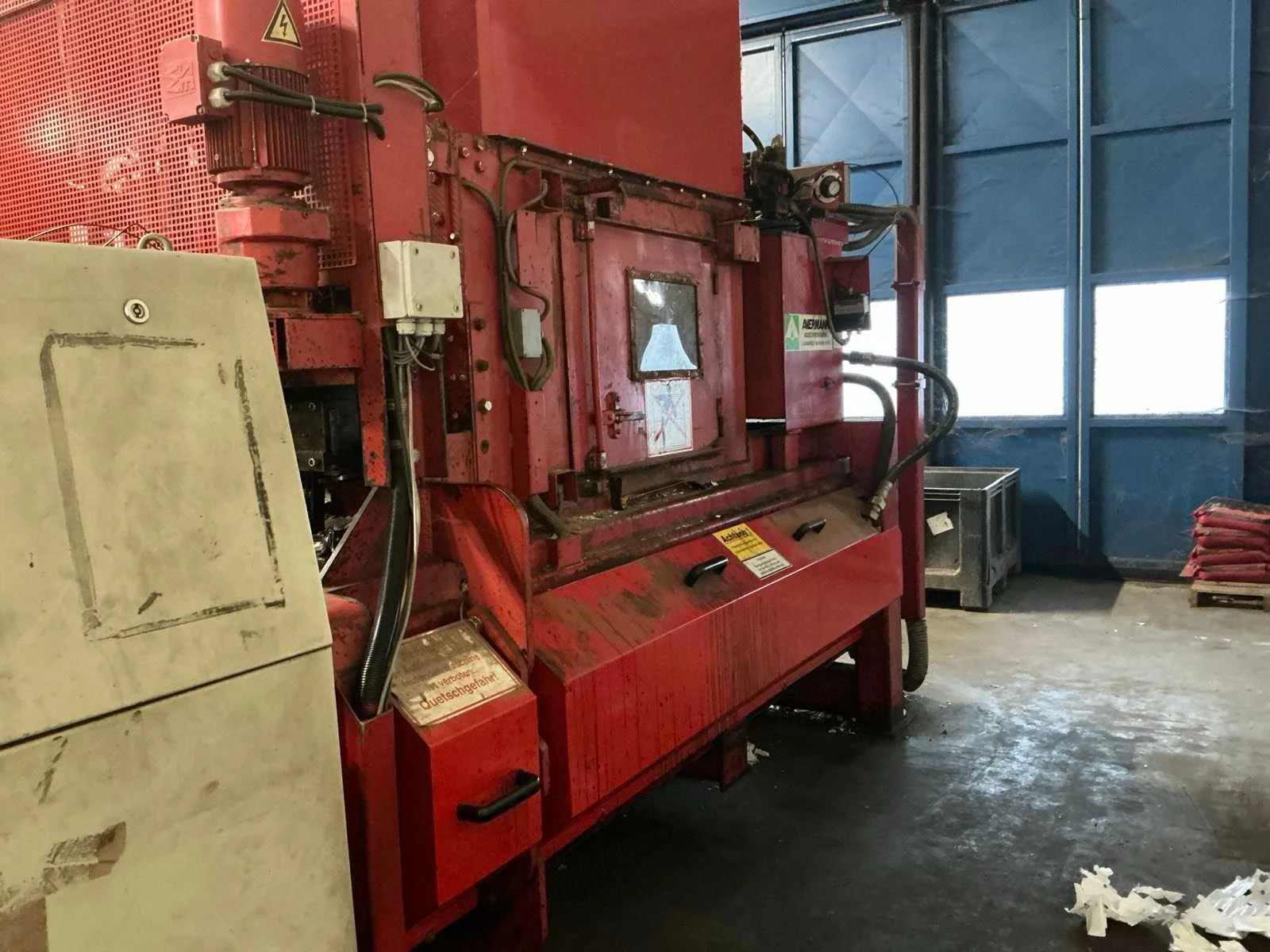 Voorzien van: breedte opvoerband 1600x lengte 12000. Hoog 1000mm. Pers 2000 breed, opgesteld 4000 hoog, opzet bunker 1900. Lengte machine pers: 6100mm,type: AVOS 1411 22/50 machinelengte (A) 7.600mm,machinebreedte (B)2.400 mm, machinehoogte (C) 3.850mm, breedte vulopening (zie PDF bijgevoegd bestand) (D)1.100 mm, diepte vulopening (E) 1.400,mm, bindsysteem 4-weg verticaal, leeggewicht ca. 16.000 kg, aandrijfvermogen enkele motor 45 kW, perskracht 800 kN, bedrijfsspanning 3x400/230 V, stuurspanning 24 V, Aansluiting: directe aansluiting, kanaalinstelling: volautomatisch, baalgrootte (B x H)(Lengte instelbaar)1.100 x 700 besturing: programmeerbaar, werkdruk: 200 bar, maximale druk: 150 kN, besturing: programmagestuurd, Automatische bindinrichting, 4-weg bindinrichting, gewicht ca. 1500 kg, aantal binddraden: 4, draaddiameter (conform DIN 177): 3,1 mm, elektrische aansluiting (lanseenheid): 400V/50Hz, vermogen lansmotor: 4 kW, vermogen bindmotor: 3 kW, werkdruk (snij-inrichting): 150 bar, besturing: programmagestuurd. Aanvoerband: nummer 4100657, transportbandlengte 11200mm, 32° helingshoek, bandbreedte 1400mm, motor aandrijving 3Kw. (zie technische tekening) Nee Merk: Avermann Type: Horizontal baler BP1411 22/50 Bouwjaar: 1993 Serienummer: S60025 Kunststof industrie: true Papierindustrie: true