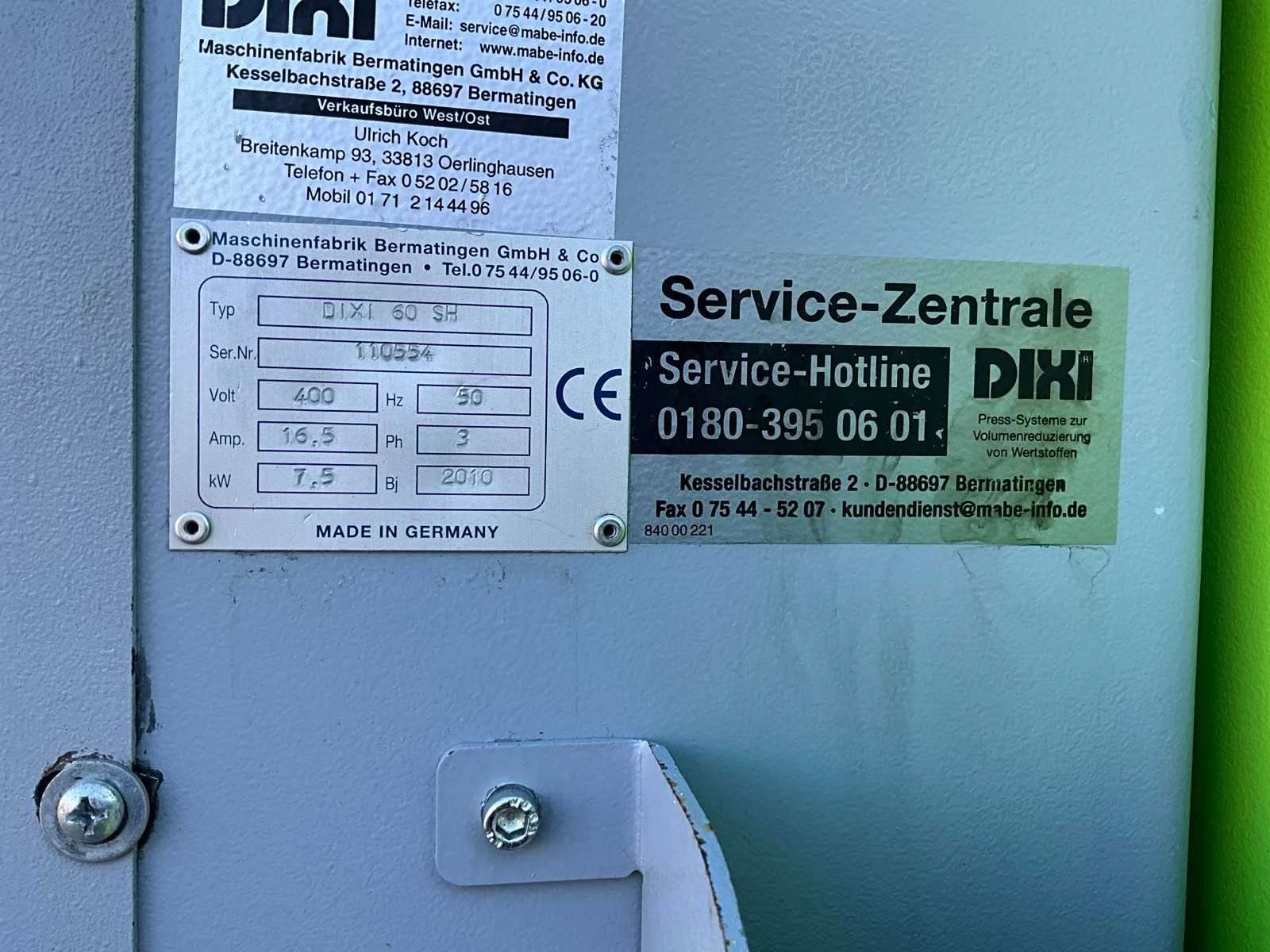 Max. Persdruk 60 ton; aansluiting voltage 400v; Baalafmeting: ca. 120x80x80-100 cm; Vulopening: 115x80x55 cm; Nee Merk: Dixi Type: 60SH Bouwjaar: 2010 Serienummer: 110554 Balenpers type: true Folie / kartonpers type: true Verticaal: true Capaciteit afm. l: 1200mm Capaciteit afm. b: 800mm Capaciteit afm. h: 100mm Machinegewicht: 2400kg Totale afmeting L: 1900mm Totale afmeting Breedte: 1400mm Totale afmeting Hoogte: 2300mm