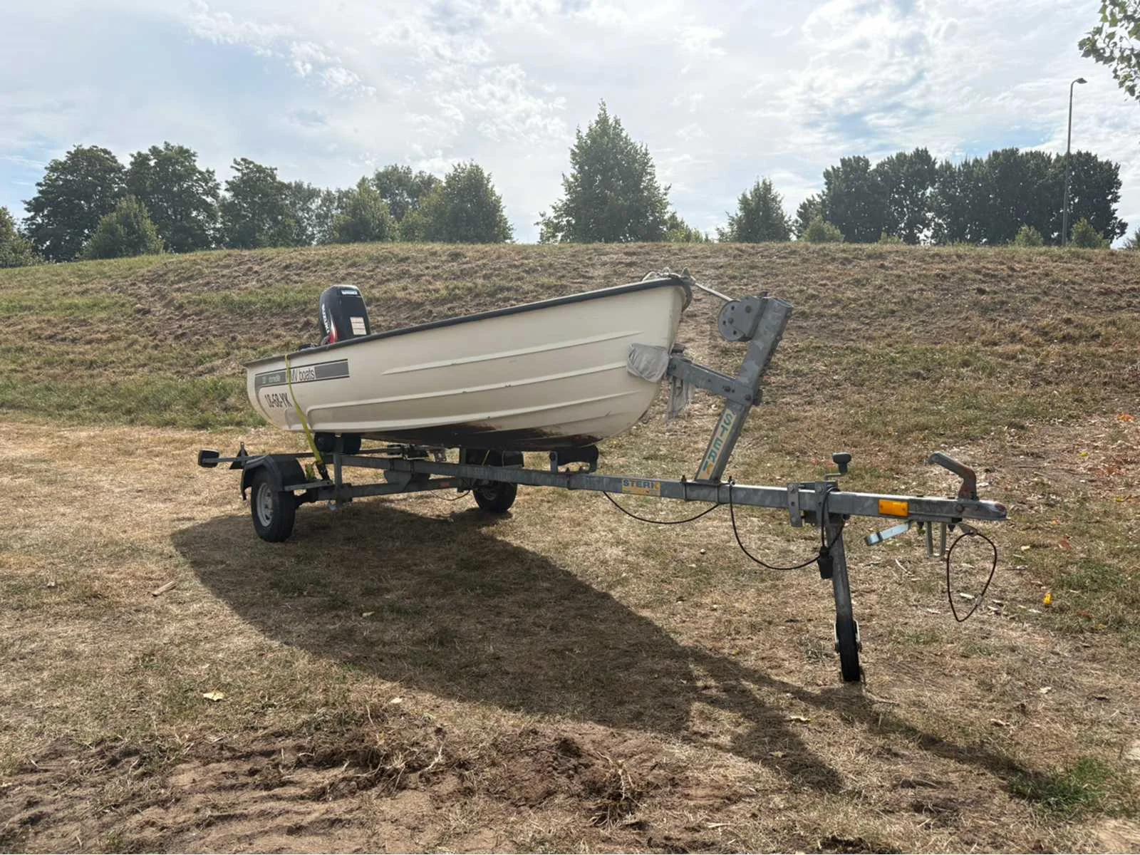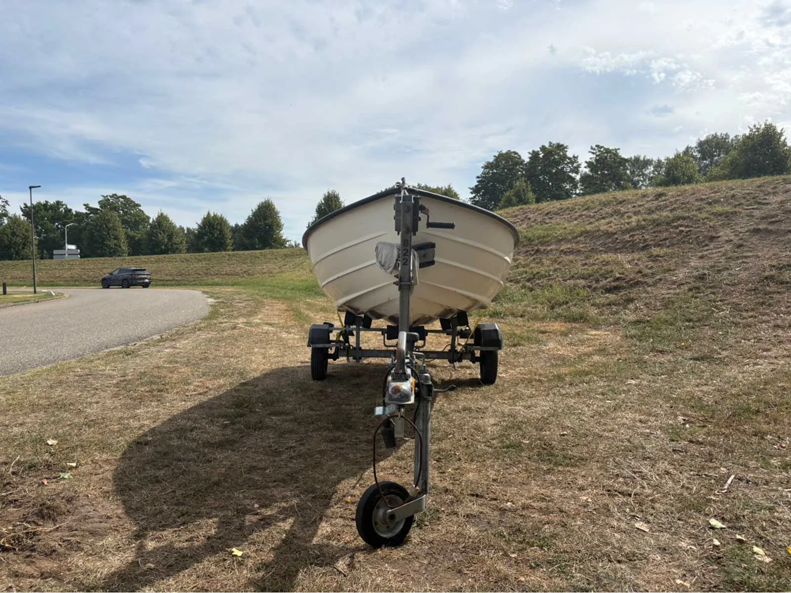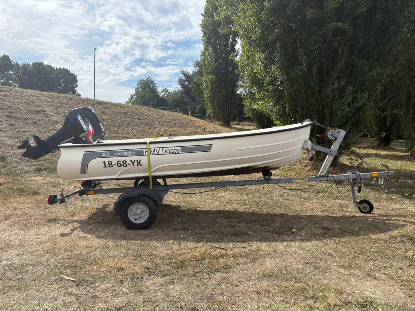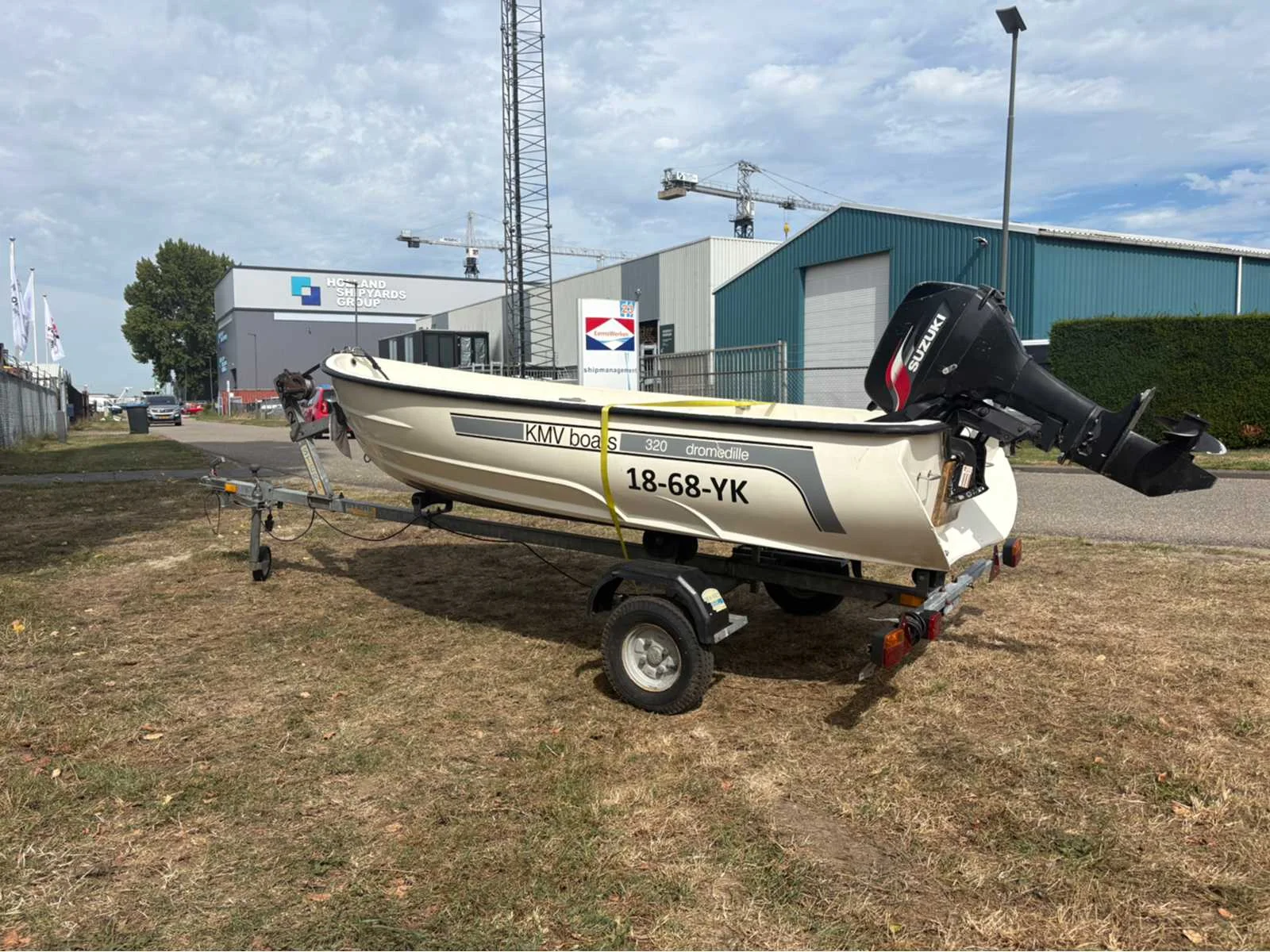 With 320 Dromedille boot, bouwjaar 2004, compleet met Suzuki 9.9 pk 2-takt buitenboordmotor en trailer. Originele uitvoering, voorzien van brandstoftank en afdekzeil. Links en rechts lichte schade aan de gelcoat aanwezig. De klep in de punt is beschadigd en dient vervangen te worden; scharnieren zijn nog aanwezig. Boot verkeert verder in nette staat (LET OP! dit voertuig heeft een kenteken registratie, bij afhalen dient u dit ter plaatste bij een derde partij te naam te stellen of te exporteren, hier zijn extra kosten aan verbonden) (Marge, geen BTW) Nee Merk: With Type: KMW Dromedille 320 Rompmateriaal: Polyester Brandstof: Benzine Bouwjaar: 2004 Serienummer: 347565 Vermogen: 7.3kW Trailer merk + type: Sterk Trailer Lengte over alles: 3.2m Breedte formaat: 1.4m Eigen gewicht: 35kg
