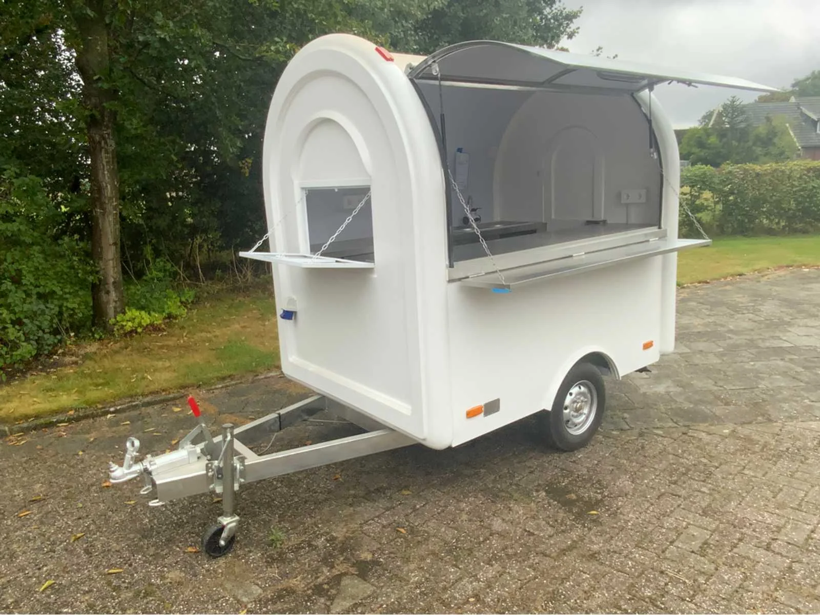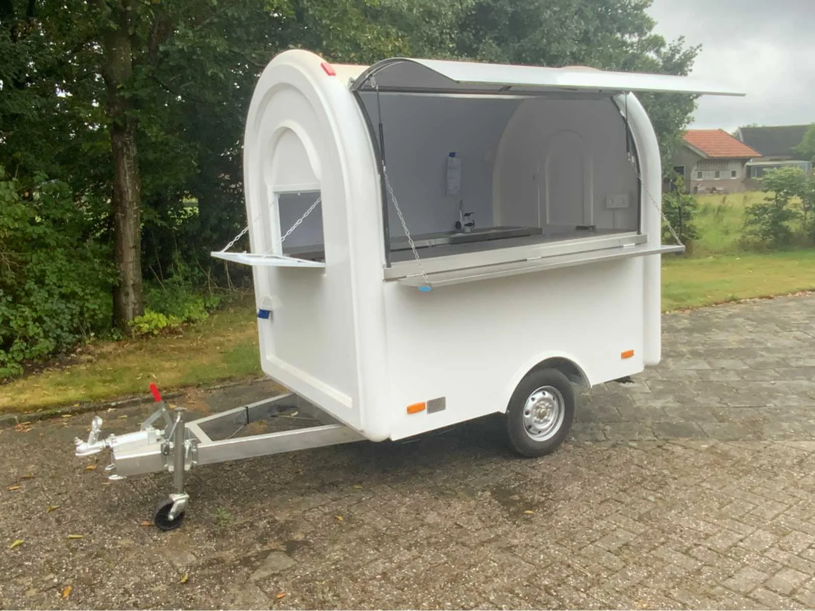 De foodtrailer is uitgerust met: Wasbak met kraan en watertank (warm en koud water) RVS werkbanken en opbergvakken, Aluminium antislip vloer, Krachtstroom- en 230V-aansluiting, 8 geaarde stopcontacten (230V), Zekeringkast (2 groepen van 3500 watt), Verlichting in de trailer, Deur met slot, 4 stabilisatiepoten, Nee Bouwjaar: 2025 Aantal assen: 1 Laadbak afmeting l: 220cm Laadbak afmeting b: 160cm Ledig gewicht: 550kg Gesloten opbouw: true Hoogte: 235cm Lengte: 335cm Breedte: 160cm