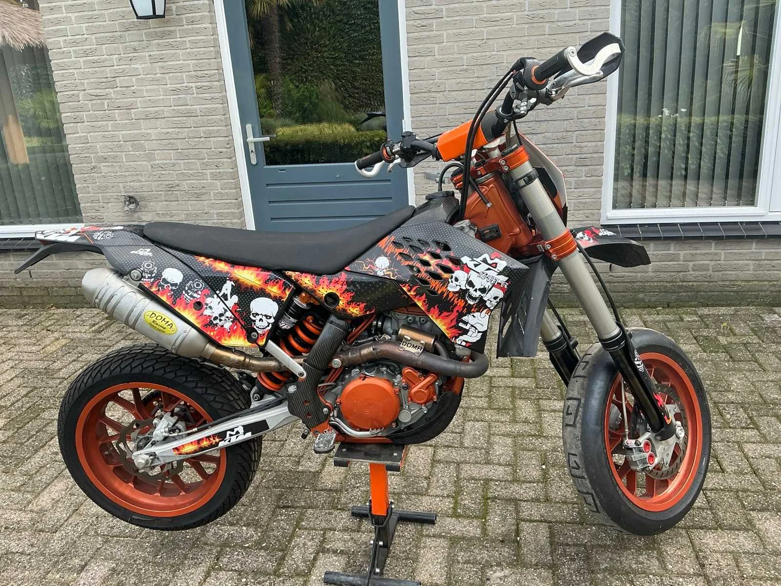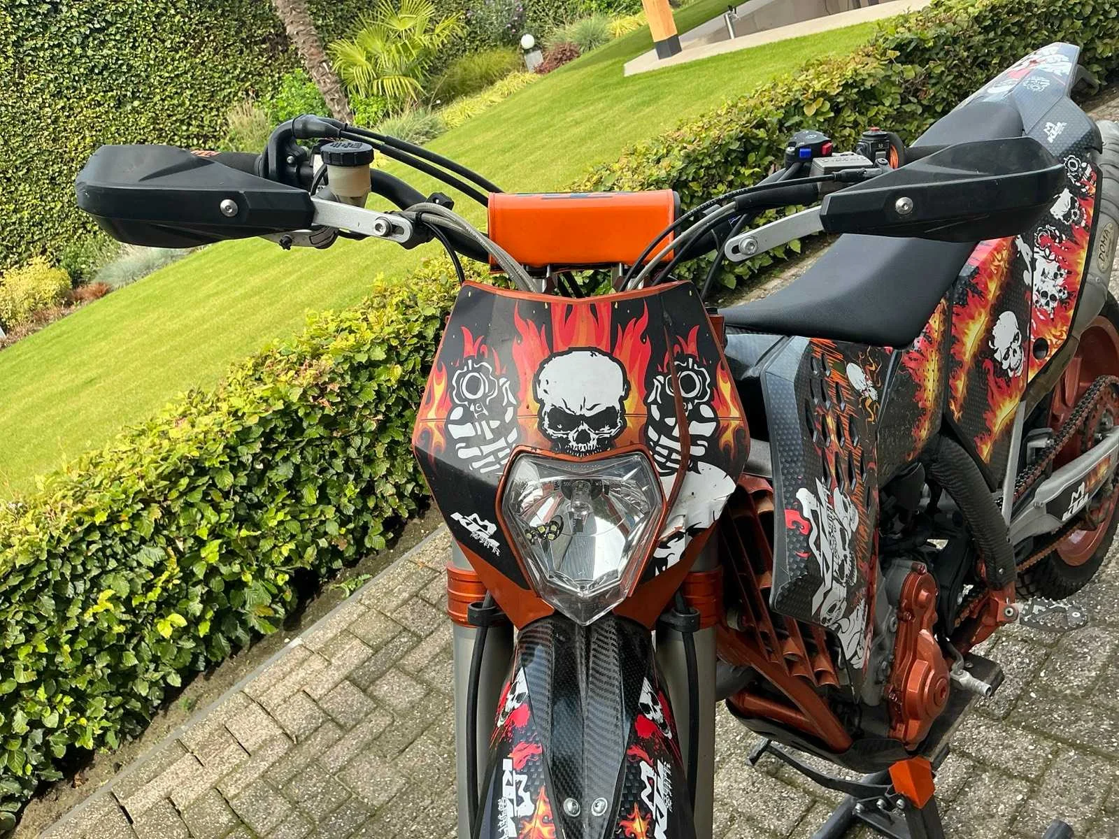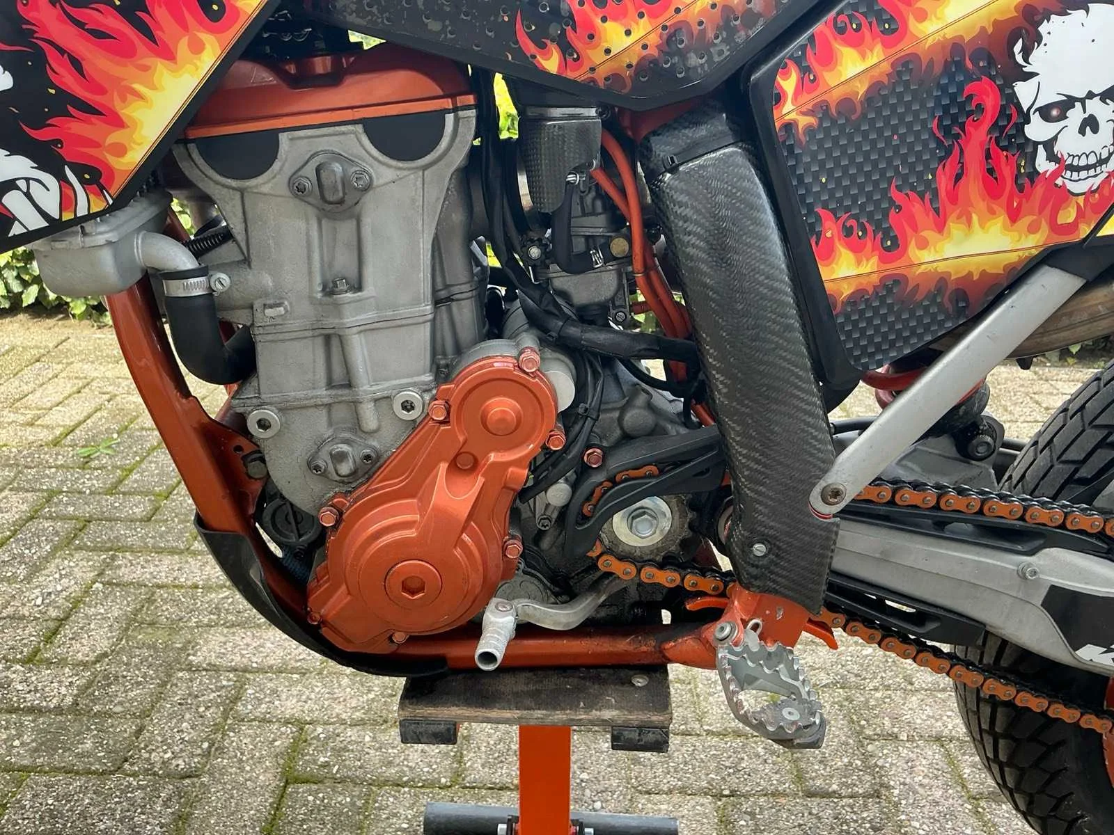 Speciaal gebouwde KTM voorzien van DOMA uitlaatsysteem en Supersprox ketting en tandwielen. Speciale voorvork en achterbrug. Met merken zoals WP en Brakemaster. Verschillende custom delen waaronder carbon afwerkingen. Nee Merk: KTM Model: SM450 Brandstof: Benzine Chassisnummer: VBKGSA20 5 YM414311 Cilinderinhoud: 450cc Transmissie: Schakel