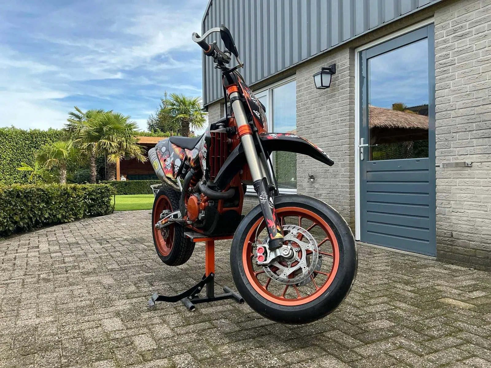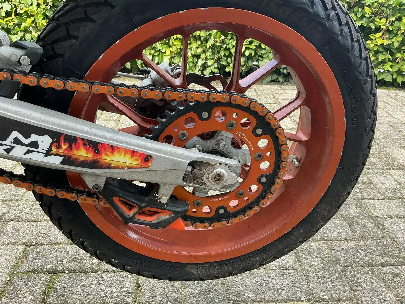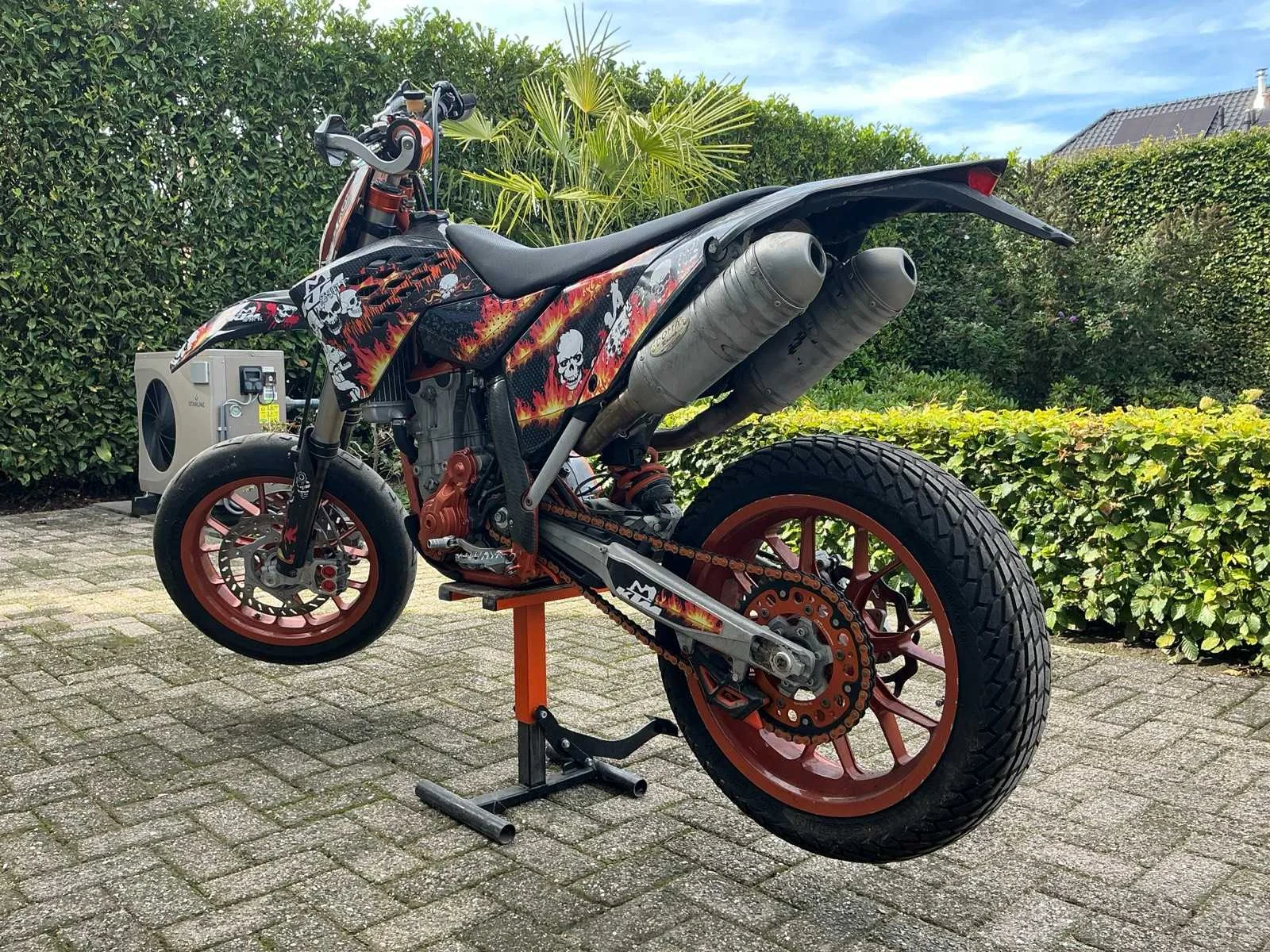 Speciaal gebouwde KTM voorzien van DOMA uitlaatsysteem en Supersprox ketting en tandwielen. Speciale voorvork en achterbrug. Met merken zoals WP en Brakemaster. Verschillende custom delen waaronder carbon afwerkingen. Nee Merk: KTM Model: SM450 Brandstof: Benzine Chassisnummer: VBKGSA20 5 YM414311 Cilinderinhoud: 450cc Transmissie: Schakel