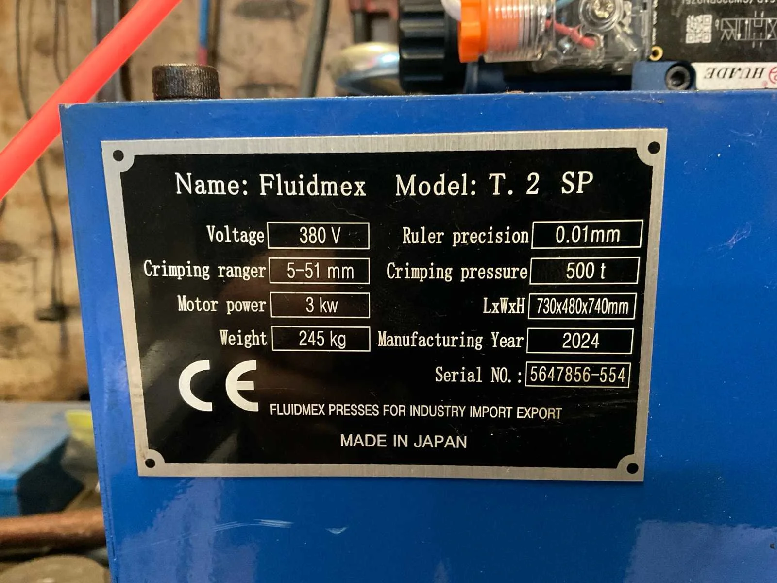 380V, 5-51mm perscapaciteit, No Merk: Fluidmex Product type: T.2 SP Gewicht: 245kg Lengte: 730cm Breedte: 480cm Hoogte: 740cm