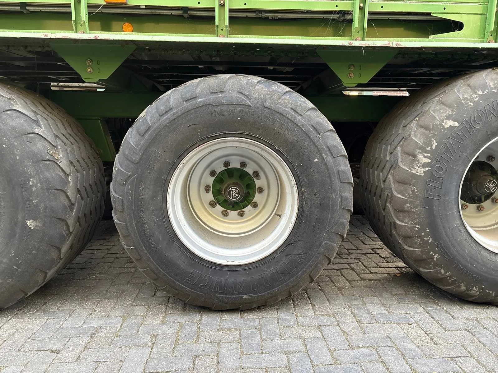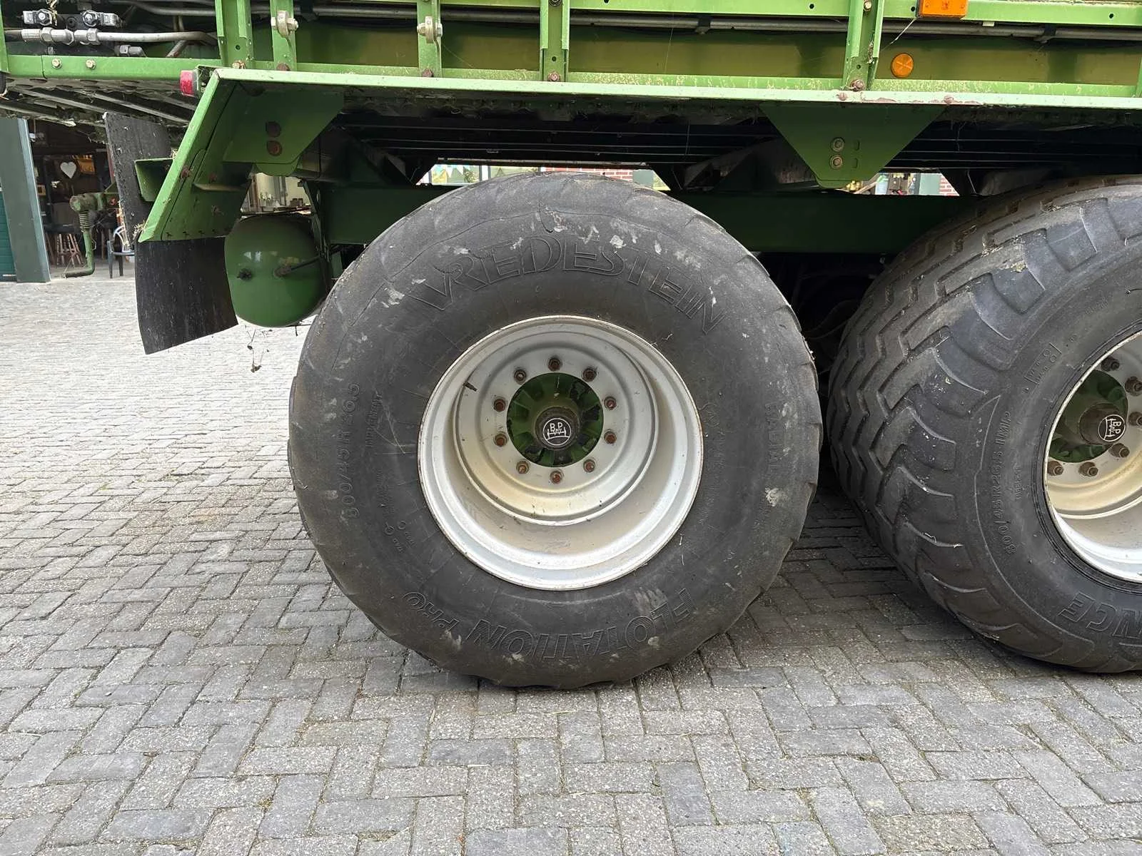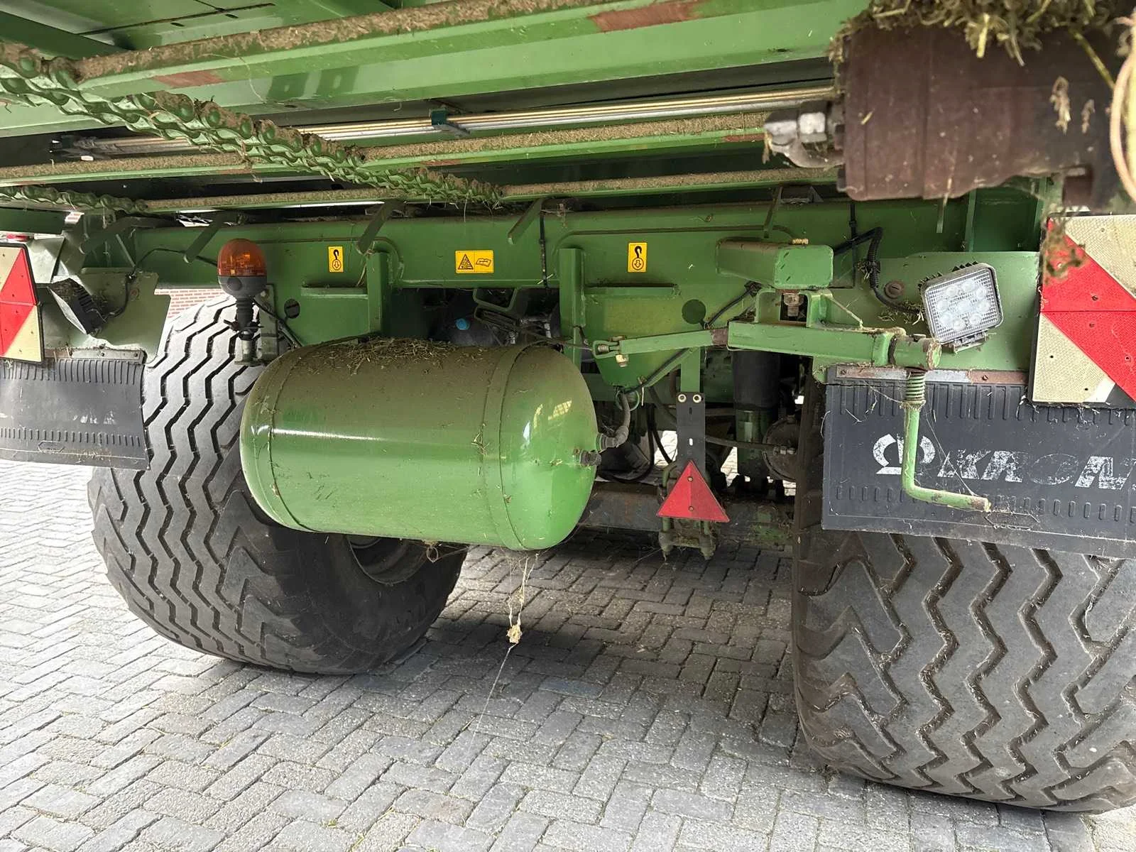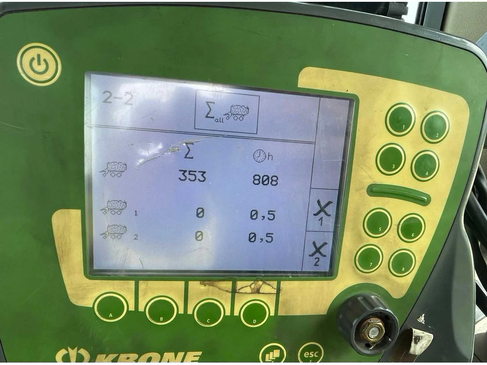 Deze Krone ZX 450 opraapwagen is uitgerust met een hydraulisch tridemstel (3-assig) met liftas en gedwongen besturing. De wagen staat op 800/45R26.5 banden en beschikt over een weeginrichting in combinatie met doseerwalsen. Verder is de machine voorzien van een Gamma bedienterminal, granulaat dosseerapparaat en wordt geleverd met Nederlands kenteken (LRS-95-B). De opraapwagen heeft een opslagcapaciteit van 27.000 liter en is voorzien van maximaal 46 messen. Het eigen gewicht bedraagt 28.500 kg. De totale afmetingen zijn 10.000 mm lengte, 3.000 mm breedte en 3.900 mm hoogte. Serienummer: ZX873071. Nee Merk: Krone Type: ZX 450 Bouwjaar: 2013 Serienummer: ZX873071 Kenteken: LRS-95-B Opslagcapaciteit: 27000 Met onderstel: true Bandenmaat: 800/45R26.5 Maximaal aantal messen: 46 Verdeelwals: true Doseerapparaat: true Afgelezen urenstand: 808 Eigen gewicht: 28500 Totale afmeting L: 10000 Totale afmeting Breedte: 3000 Totale afmeting Hoogte: 3900