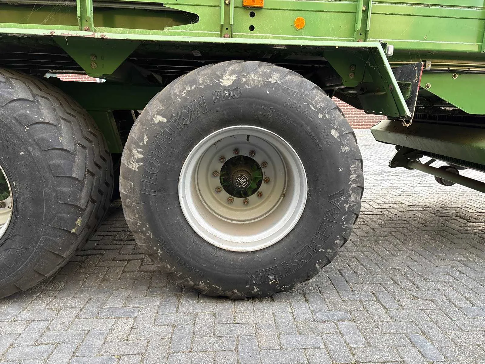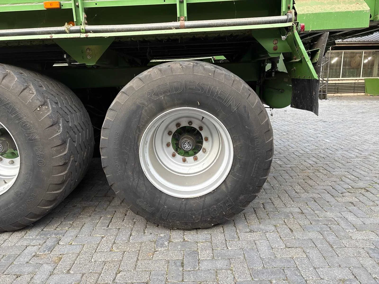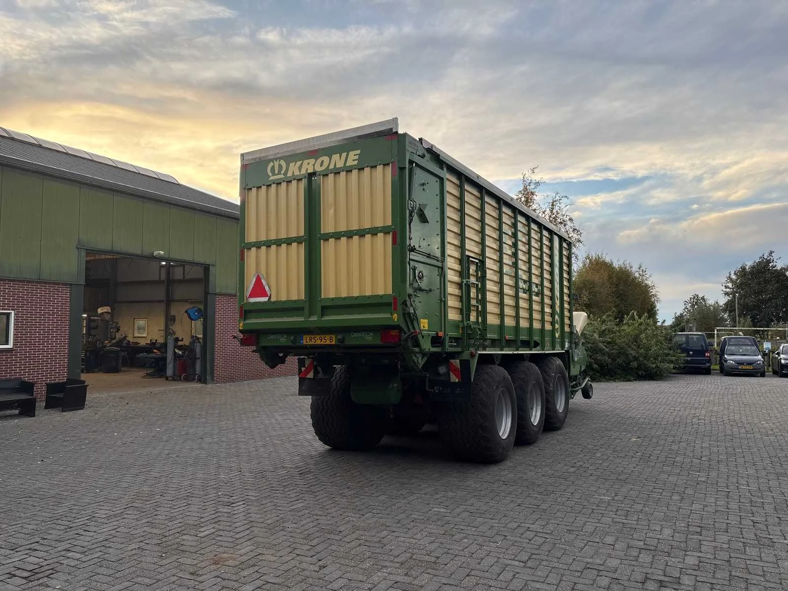 Deze Krone ZX 450 opraapwagen is uitgerust met een hydraulisch tridemstel (3-assig) met liftas en gedwongen besturing. De wagen staat op 800/45R26.5 banden en beschikt over een weeginrichting in combinatie met doseerwalsen. Verder is de machine voorzien van een Gamma bedienterminal, granulaat dosseerapparaat en wordt geleverd met Nederlands kenteken (LRS-95-B). De opraapwagen heeft een opslagcapaciteit van 27.000 liter en is voorzien van maximaal 46 messen. Het eigen gewicht bedraagt 28.500 kg. De totale afmetingen zijn 10.000 mm lengte, 3.000 mm breedte en 3.900 mm hoogte. Serienummer: ZX873071. Nee Merk: Krone Type: ZX 450 Bouwjaar: 2013 Serienummer: ZX873071 Kenteken: LRS-95-B Opslagcapaciteit: 27000 Met onderstel: true Bandenmaat: 800/45R26.5 Maximaal aantal messen: 46 Verdeelwals: true Doseerapparaat: true Afgelezen urenstand: 808 Eigen gewicht: 28500 Totale afmeting L: 10000 Totale afmeting Breedte: 3000 Totale afmeting Hoogte: 3900