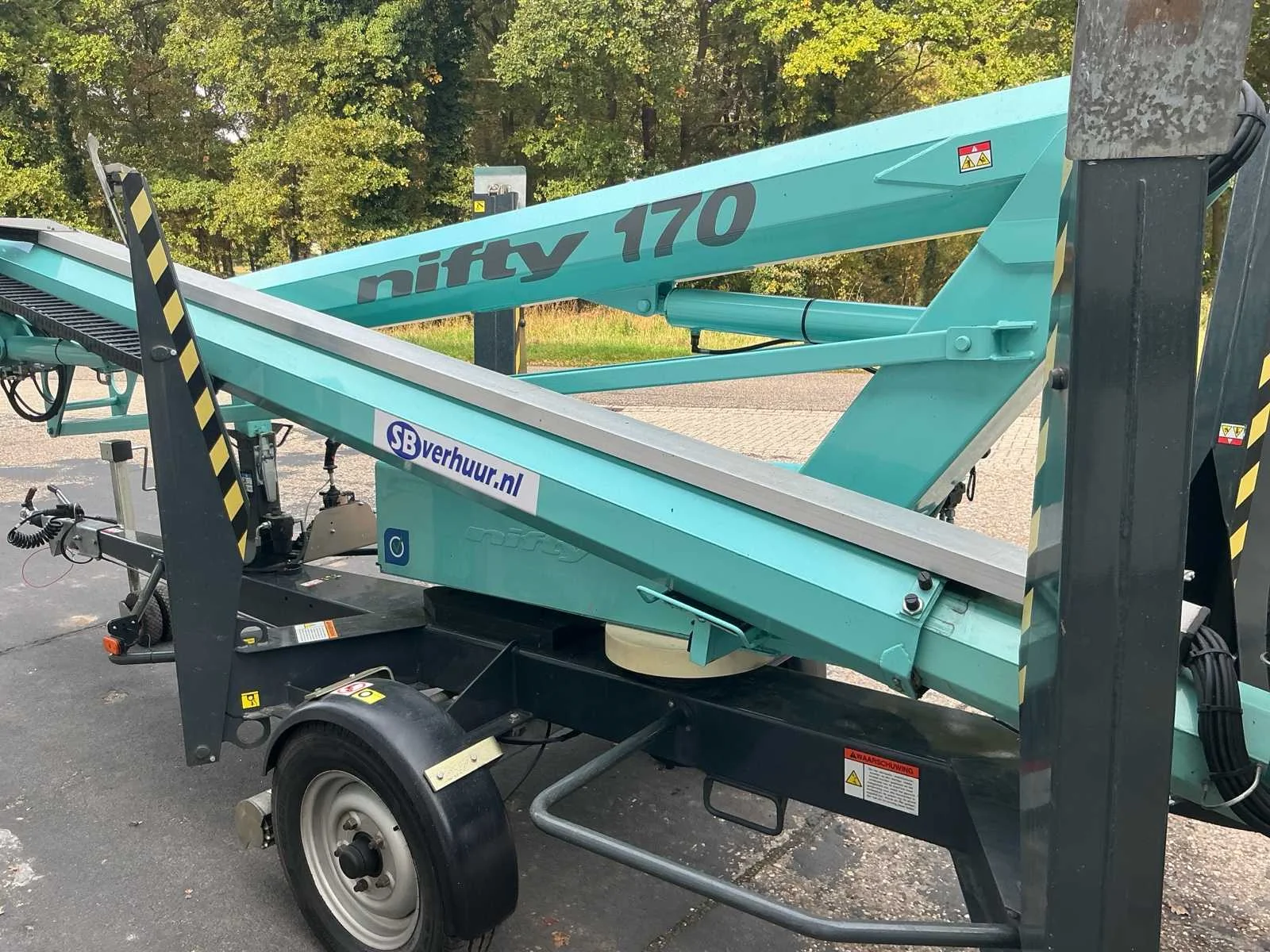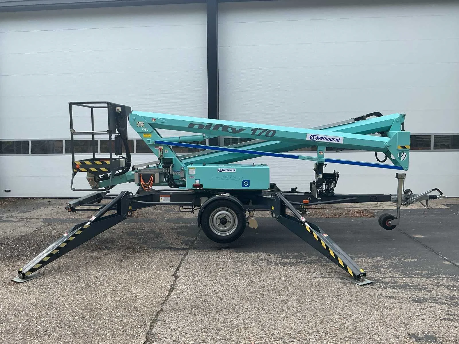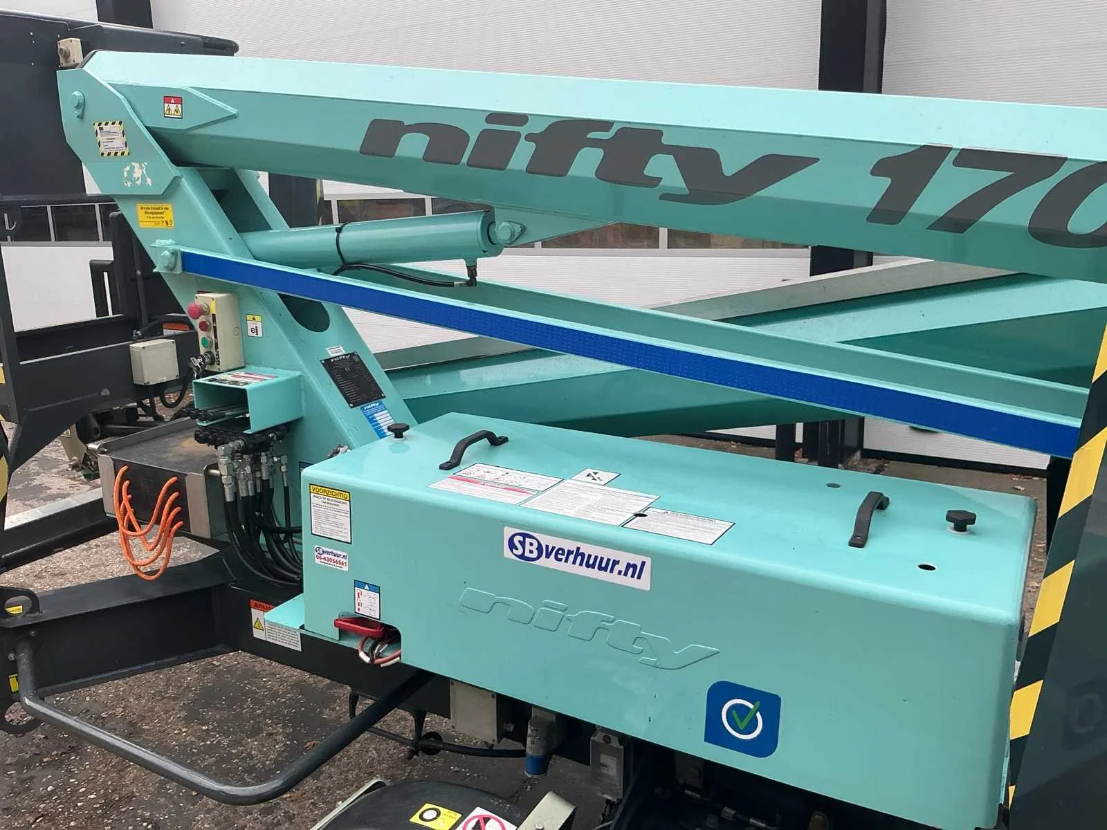 Voorzien van interne lader, nieuw accu pakket met loodzuur, September 2025 gekeurd, moovers, 24V DC (4x 6V deep cycle batterijen, totaal ± 340 Ah), Stempels (outriggers): 4 hydraulisch bedienbare stempels met waterpasindicator, Rotatie: 360° continu (niet-overlappend), Platformrotatie: 100° (handmatig of hydraulisch, afhankelijk van optie), Kenteken: 60-WT-KP, Veiligheidssystemen: Nooddaalsysteem, kantelbeveiliging, overbelastingbeveiliging. Nee Merk: Nifty Type: 170HET MK1B Bouwjaar: 2018 Serienummer: 17 41881 Elektrisch: true Knikarm hoogwerker: true Werkhoogte: 17100mm Horizontale rijkwijdte: 8700mm Plateau afm. l: 960mm Plateau afm. b: 670mm Platform capaciteit: 200kg Accu lader: true Eigen gewicht: 2170kg Totale afmeting L: 6200mm Totale afmeting Breedte: 1600mm Totale afmeting Hoogte: 2150mm