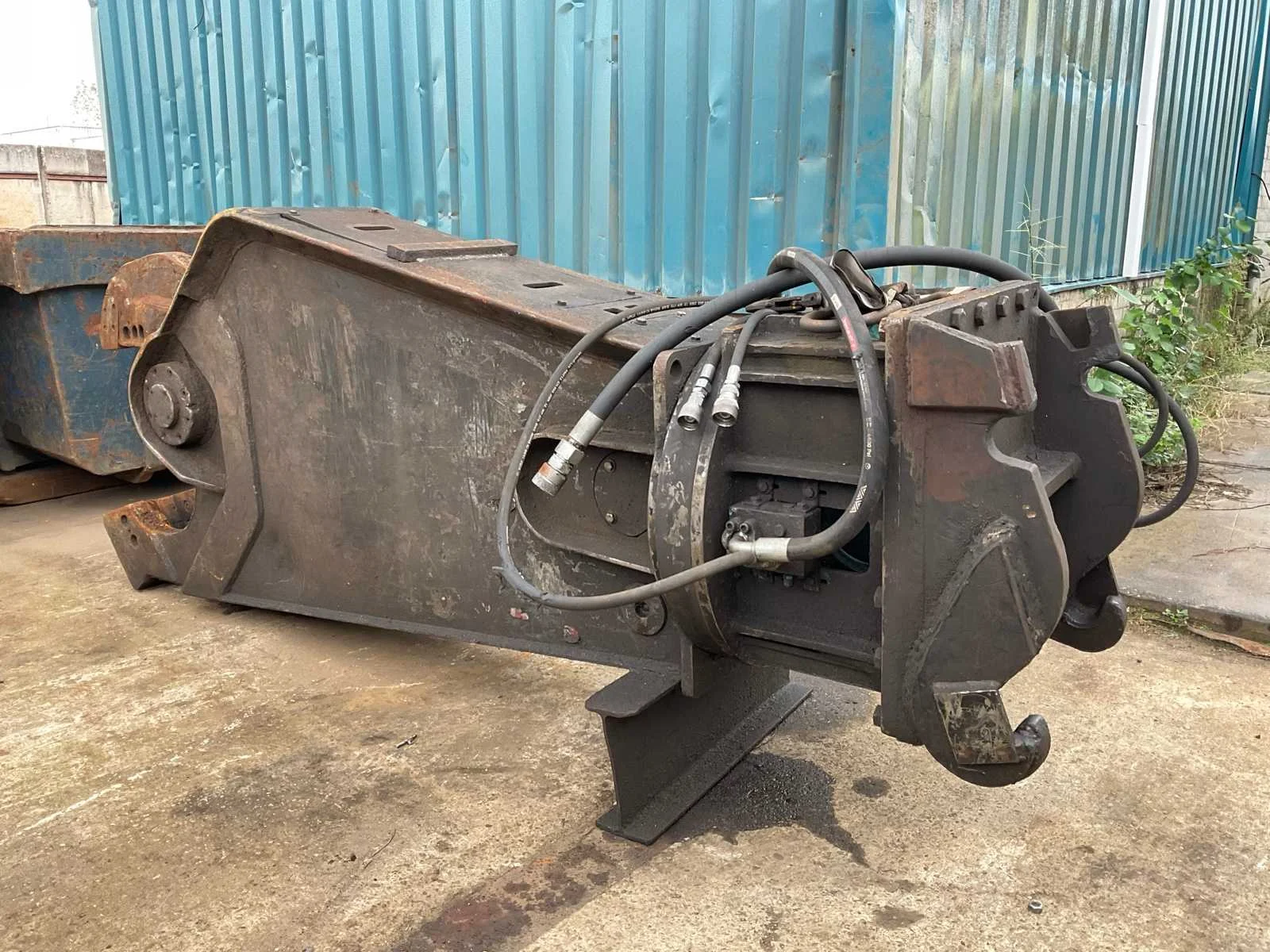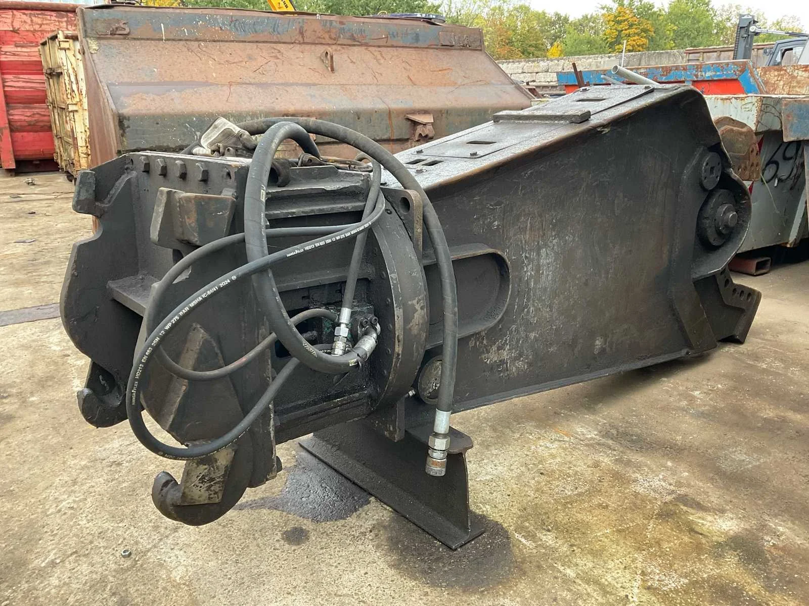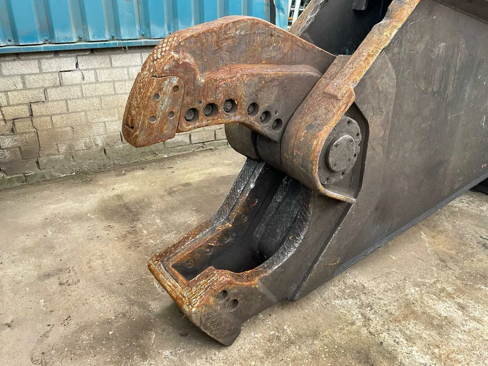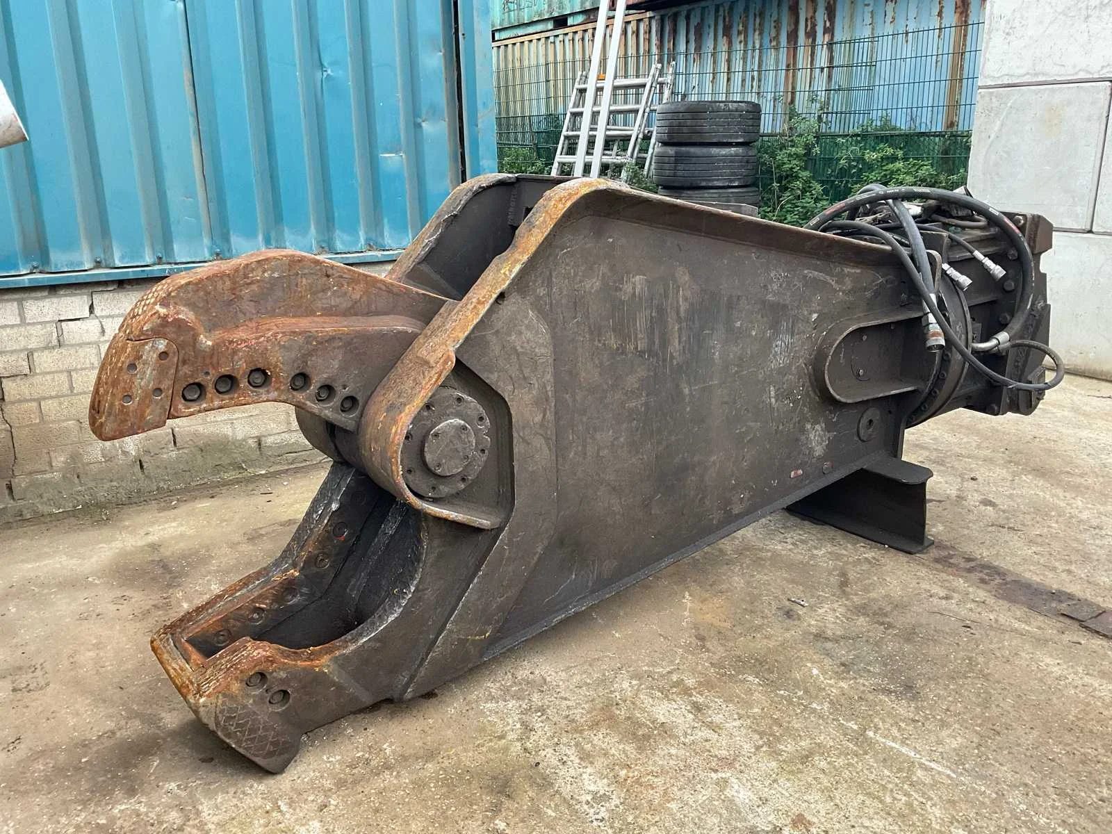 Hydraulisch aangedreven, lengte schaar: 600mm, voorzien van: CW30 aansluiting, verdraaibare messen (1 kant gebruikt, nog 3 kanten te gebruiken), Nee Merk: Eagleshears Type: MBI Totale afmeting L: 3200mm Totale afmeting Breedte: 720mm Totale afmeting Hoogte: 1280mm