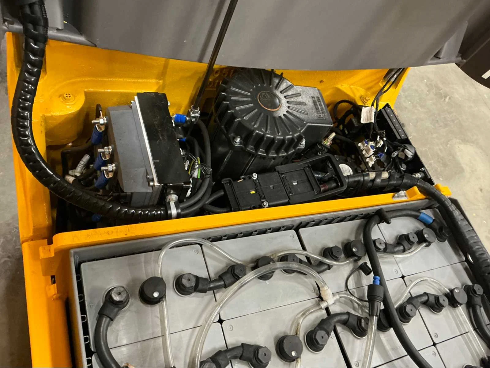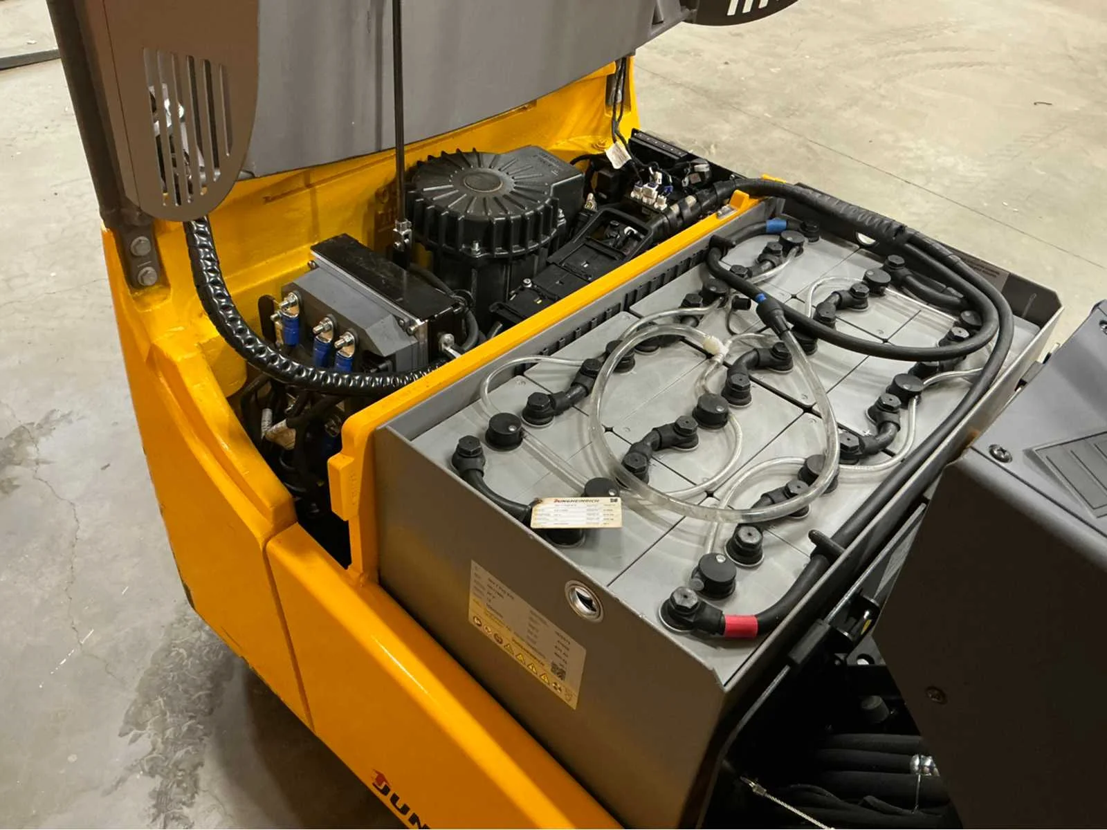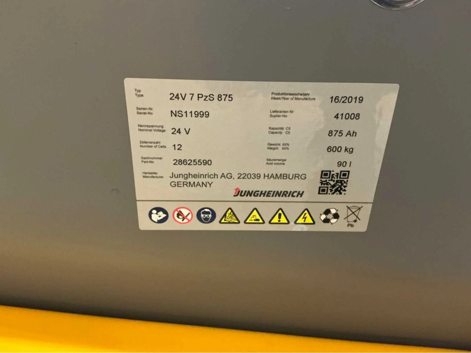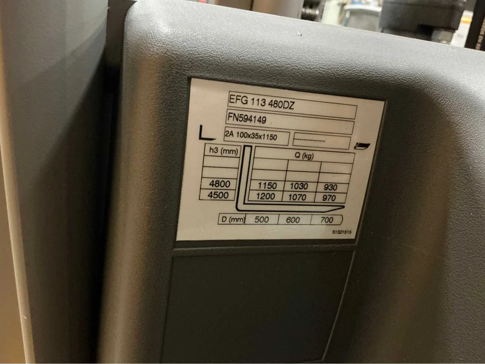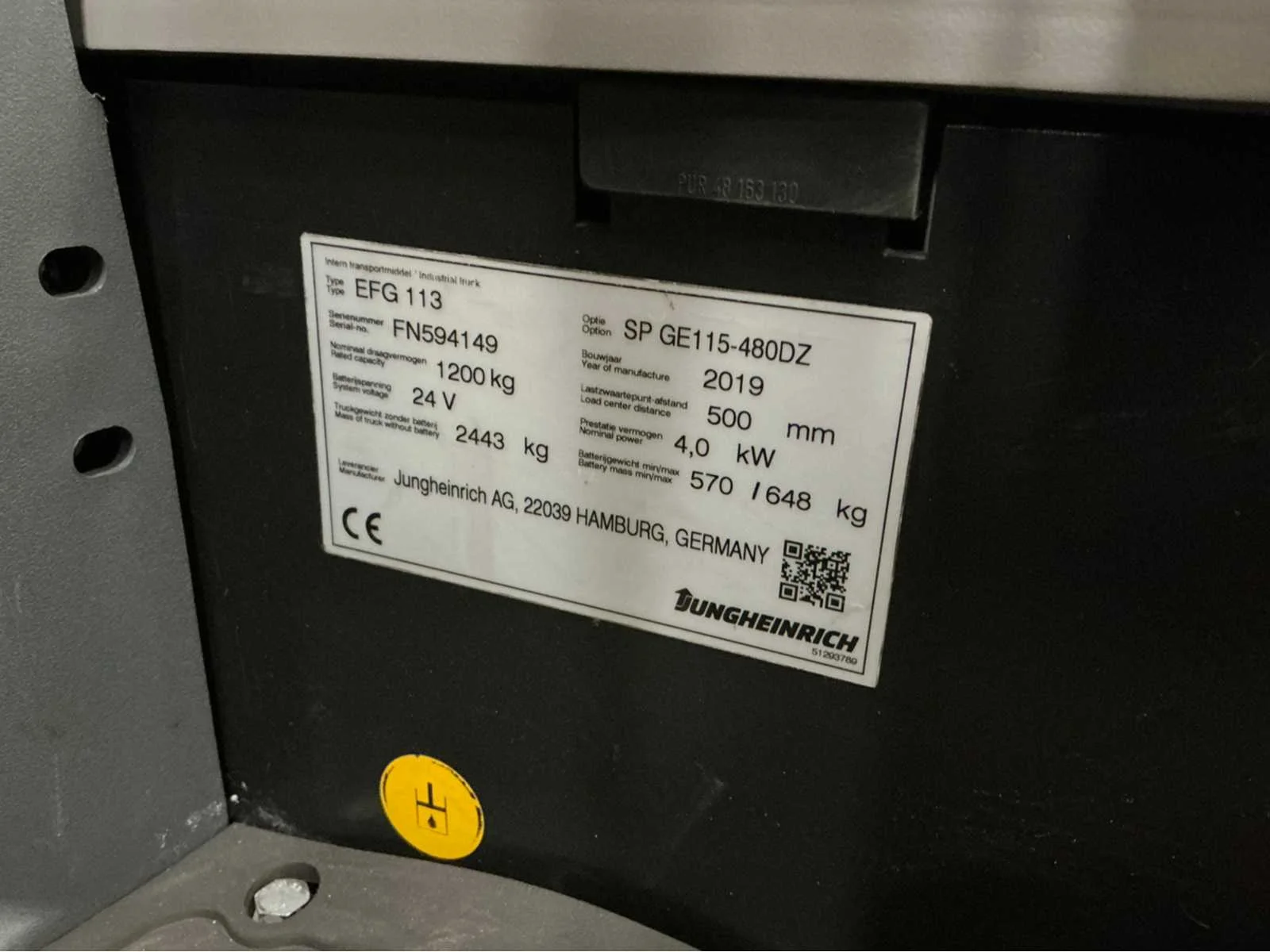 Vermogen: 4Kw. Voorzien van verstelbare stoel, werkverlichting en bluespot. Heftruck aanwezig om te laden. Nee Merk: Jungheinrich Type: EFG 113 Bouwjaar: 2019 Brandstof: Elektrisch Aantal wielen: 3 Afgelezen urenstand: 8050 Accu lader: true Free-lift: true Side-shift: true Triple mast: true Eigen gewicht: 3043kg Hefvermogen: 1200kg Lepellengte: 1150mm Min. hefhoogte: 0mm Max. hefhoogte: 4800mm Minimale doorrijhoogte: 2100mm Totale afmeting L: 1800mm Totale afmeting Breedte: 1060mm Totale afmeting Hoogte: 2100mm Vol rubber banden: true