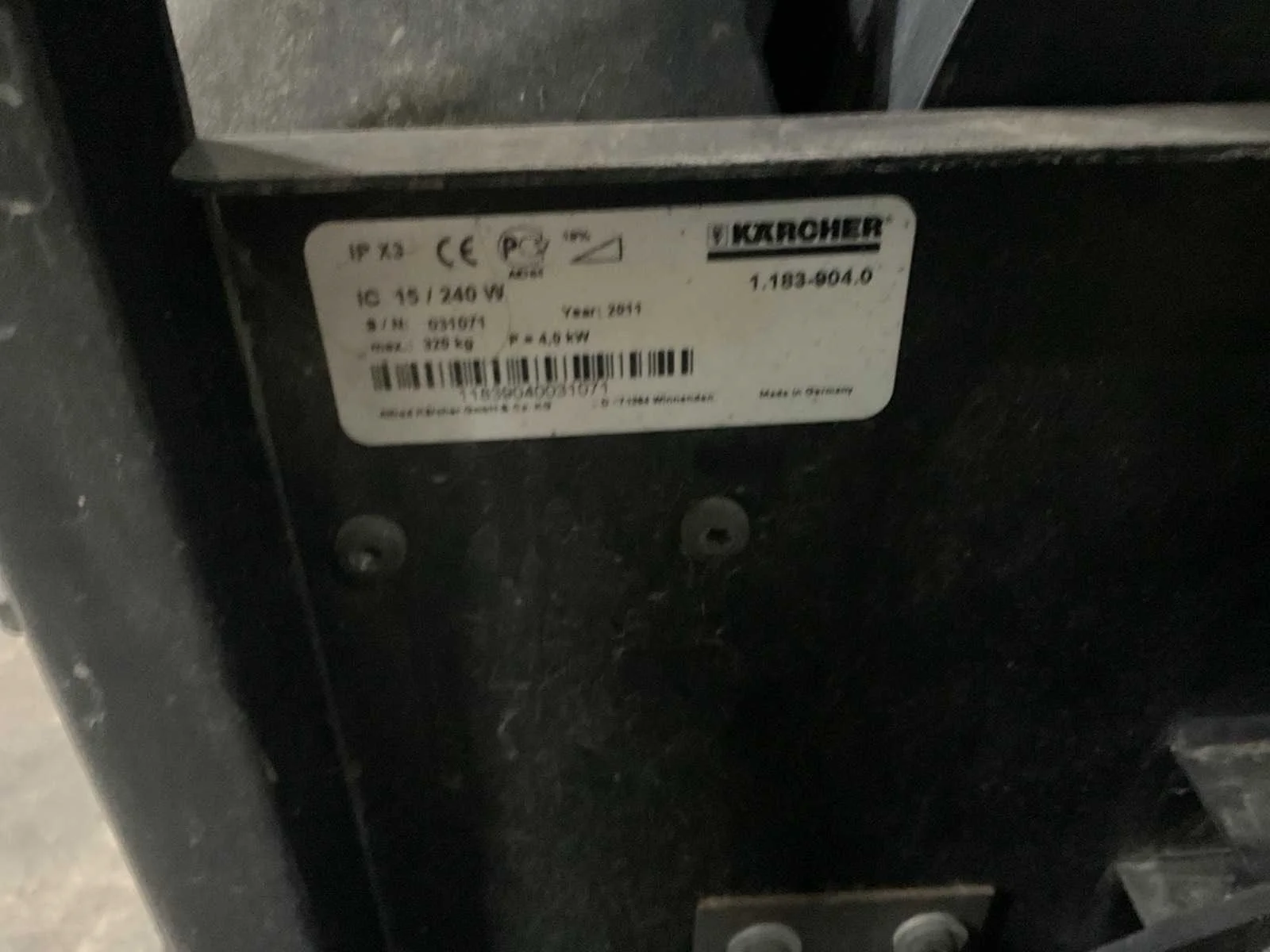 Nee Merk: Karcher Type: Ic 15/240 Bouwjaar: 2011 Brandstofmotor aangedreven: true Brandstof: Bezine Zuigfunctie: true Opvang container: true Eigen gewicht: 320kg Totale afmeting L: 1900mm Totale afmeting Breedte: 1000mm Totale afmeting Hoogte: 1500mm