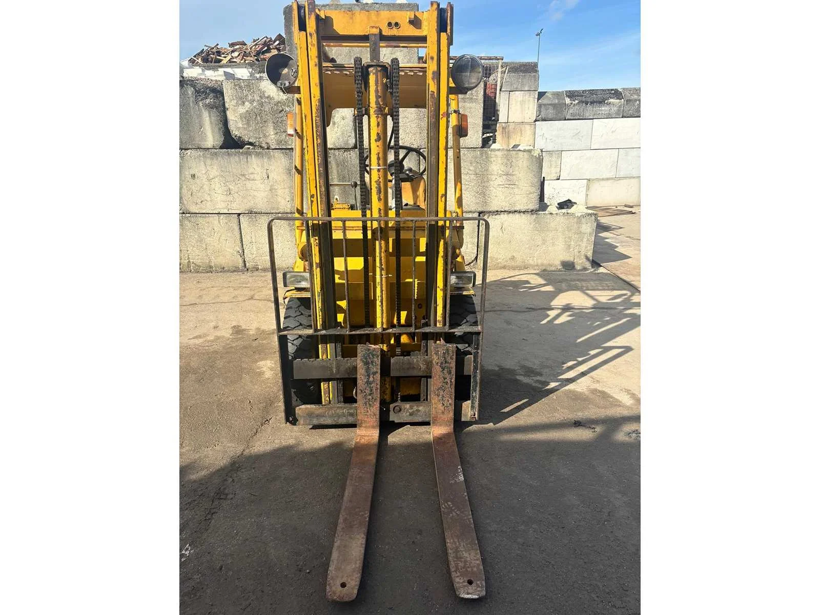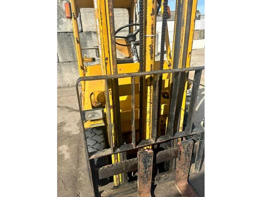 Voorzien van: trekhaak K50, vangmuil, 7 polige stekker, mechanisch geveerde stoel, vol rubber banden, werklampen, Nee Merk: Hyster Type: H40 Serienummer: B3E 3502 P Brandstof: Diesel Soort band: Volrubber banden Aantal wielen: 4 Afgelezen urenstand: 9606 Duplex mast: true Eigen gewicht: 3500kg Hefvermogen: 2300kg Lepellengte: 1200mm Max. hefhoogte: 3300mm Vol rubber banden: true Minimale doorrijhoogte: 2500mm Totale afmeting L: 3400mm Totale afmeting Breedte: 1200mm Totale afmeting Hoogte: 2500mm Diesel: true