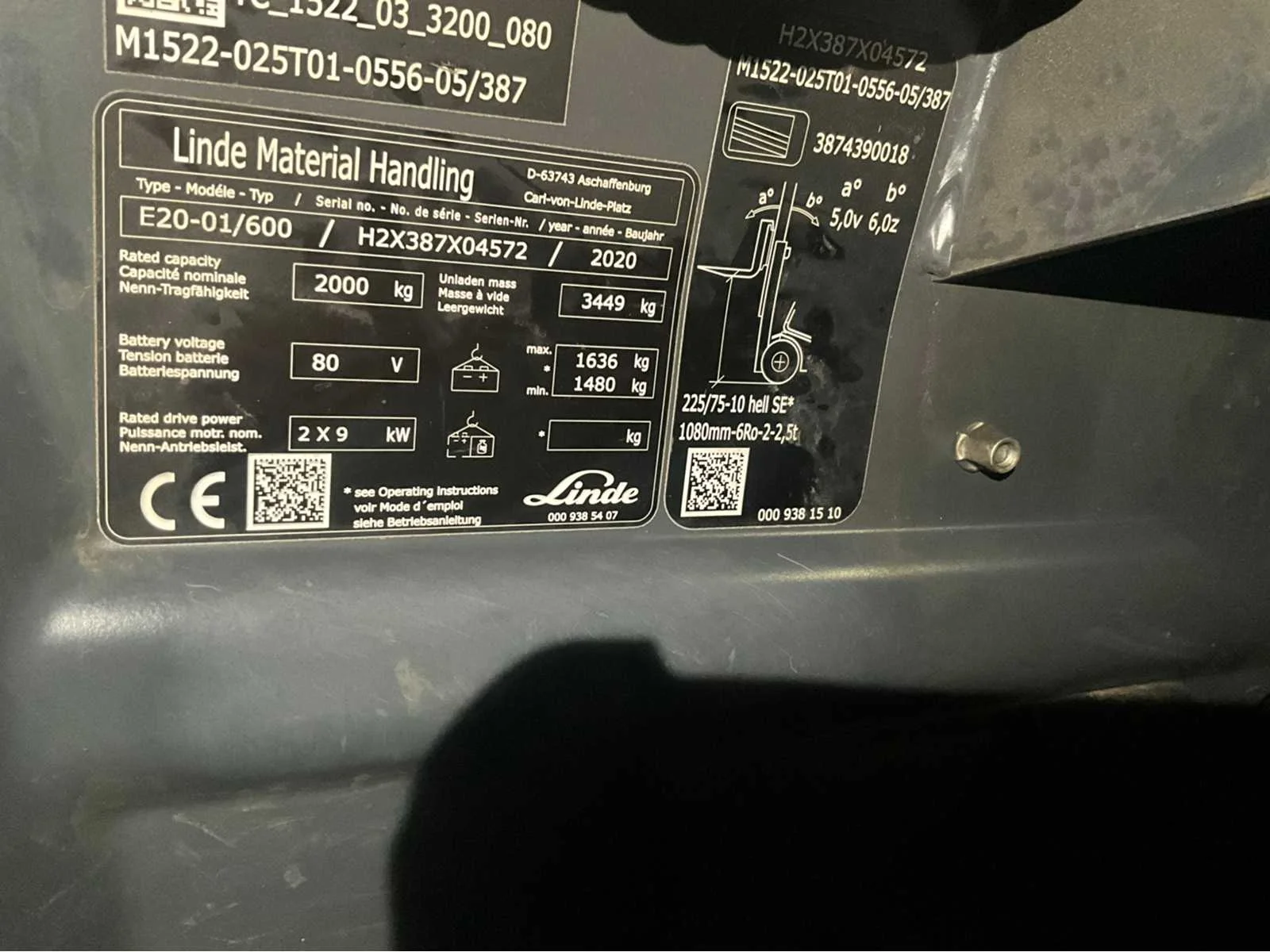 Extra opties : Linde weeg / hoogte meter / graden systeem , Lepelversteller , Non-marking banden , Led dagrij verlichting , Led dagrij strip verlichting , verlichting 3 standen instelbaar , blue spot voor en achter , radio , verwarming , stoel verwarming , zwaailamp , joy stick , ventilator Nee Merk: Linde Type: E20-01/600 Bouwjaar: 2020 Serienummer: H2X387X04572 Mast: Triple Soort band: Volrubber banden Aantal wielen: 4 Free-lift: true Triple mast: true Eigen gewicht: 5085kg Hefvermogen: 2000kg Hefhoogte: 5560mm Vol rubber banden: true Totale afmeting L: 3710mm Totale afmeting Breedte: 1140mm Totale afmeting Hoogte: 2470mm