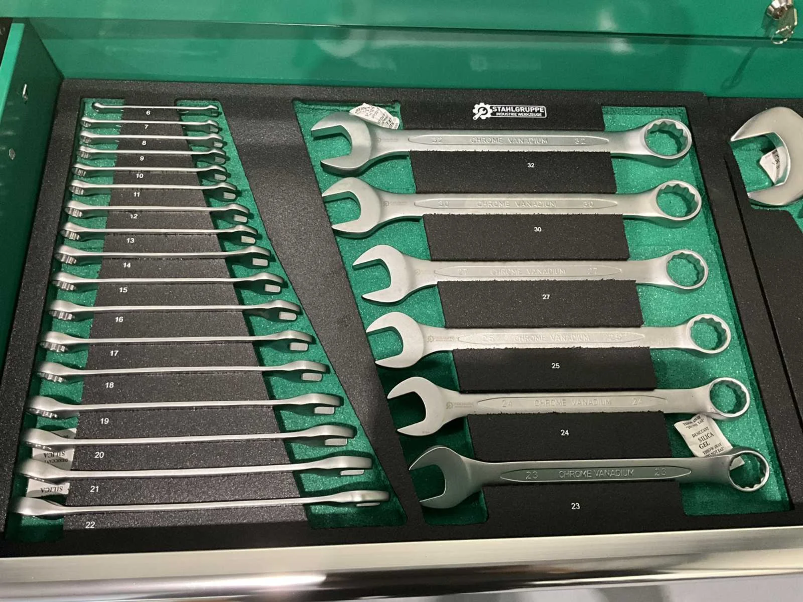 Ongebruikt 4 zwenkwielen rattelset en doppenset tot en met maat 50 386 st Heavy Duty gereedschapswagen gebruik: voor professionals aantal laden: 11 laden aantal gevulde laden: 9 gevulde laden gereedschap: chroom-vanadium gereedschap inhoud: 29-delige ring-steeksleutel set (6 mm - 50 mm) 3 ratelsleutel sets met doppen & bitsen (1/4”, 3/8” & 1/2”) 11-delige ring-ringsleutel set (6*7 mm - 30*32 mm) verstelbanre moersleutel 12-delige tangen set 2 hamers & 4 vijlen puntslag en beitel set 12 schroevendraaiers inbussleutels, Torxsleutels, precisiegereedschap 21-delige T-sleutelset 34-delige krachtdoppen set (12 mm - 50 mm) + Torx & inbus doppen & ratelsleutel 3/4,” LED-lamp, zaag, schaar, mes, meetgereedschappen enzovoort... in de originele verpakking Nee Merk: Jumbo Type: SG56 Pro Bouwjaar: 2025 Aantal laden: 11 Met inhoud: true Eigen gewicht: 201kg Totale afmeting L: 1480mm Totale afmeting Breedte: 520mm Totale afmeting Hoogte: 1110mm