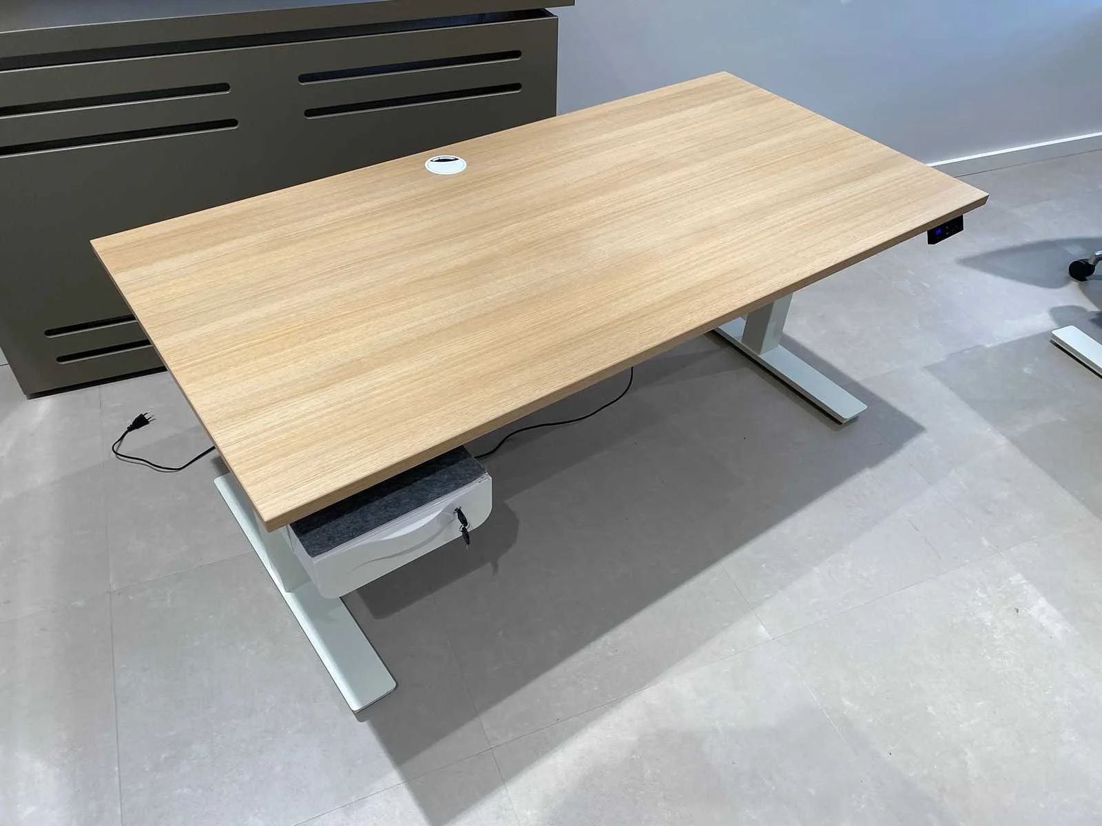 Hoogte ca. 65 - 130 cm. --- v.v. kabeldoorvoer, DUAL motor, bureaulade met sleutel, elektrische bediening met USB aansluiting. Nee Zit-sta: true Elektrisch verstelbaar: true Kleur: wit, hout Breedte: 160cm Hoogte: 130cm Materiaal: metaal, melamine Diepte: 80cm