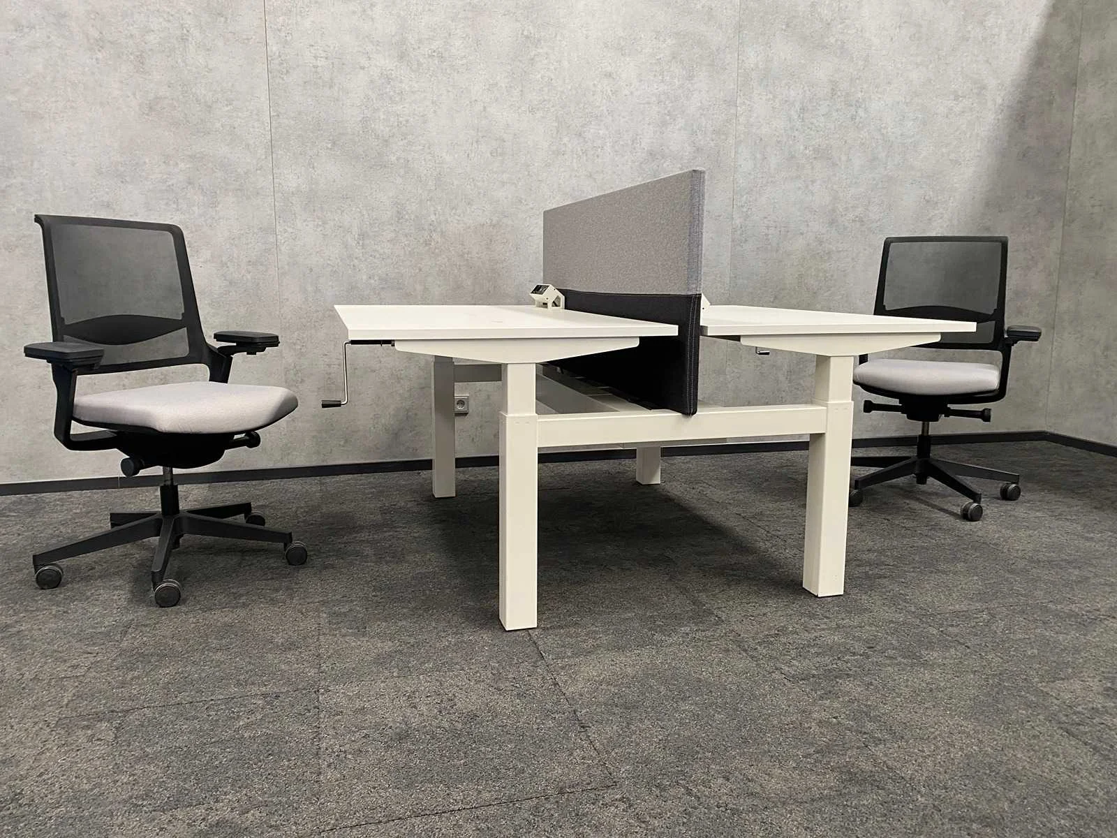 Kavel bestaande uit 2x Interstuhl Movy ergonomische bureaustoel v.v. 4D armleggers, zithoogte en zitdiepte instelbaar, kantelmechanisme rugleuning, verstelbare lendensteun. ----- 2x Bachman opbouwstekkerblok (2x230V + 2x USB) ----- 1x in hoogte verstelbaar duo bureau v.v. handslinger, grijs/ antraciet akoestische scheidingswand, draadgoot. Afm. ca. hoogte 64.5 tot 92.5 cm. bxd 140x80 cm. - LET OP transportafmetingen bureau ca. hxbxd 65x140x170 cm. Nee Slingerbureau: true