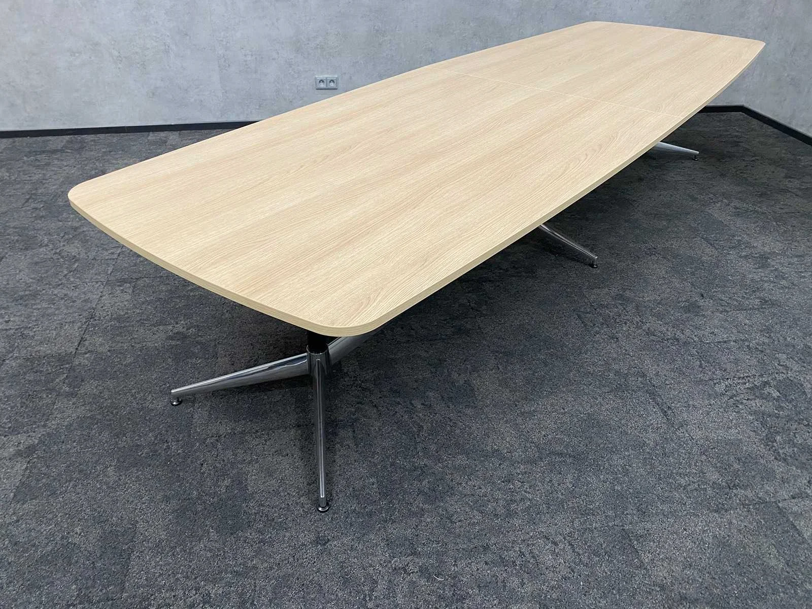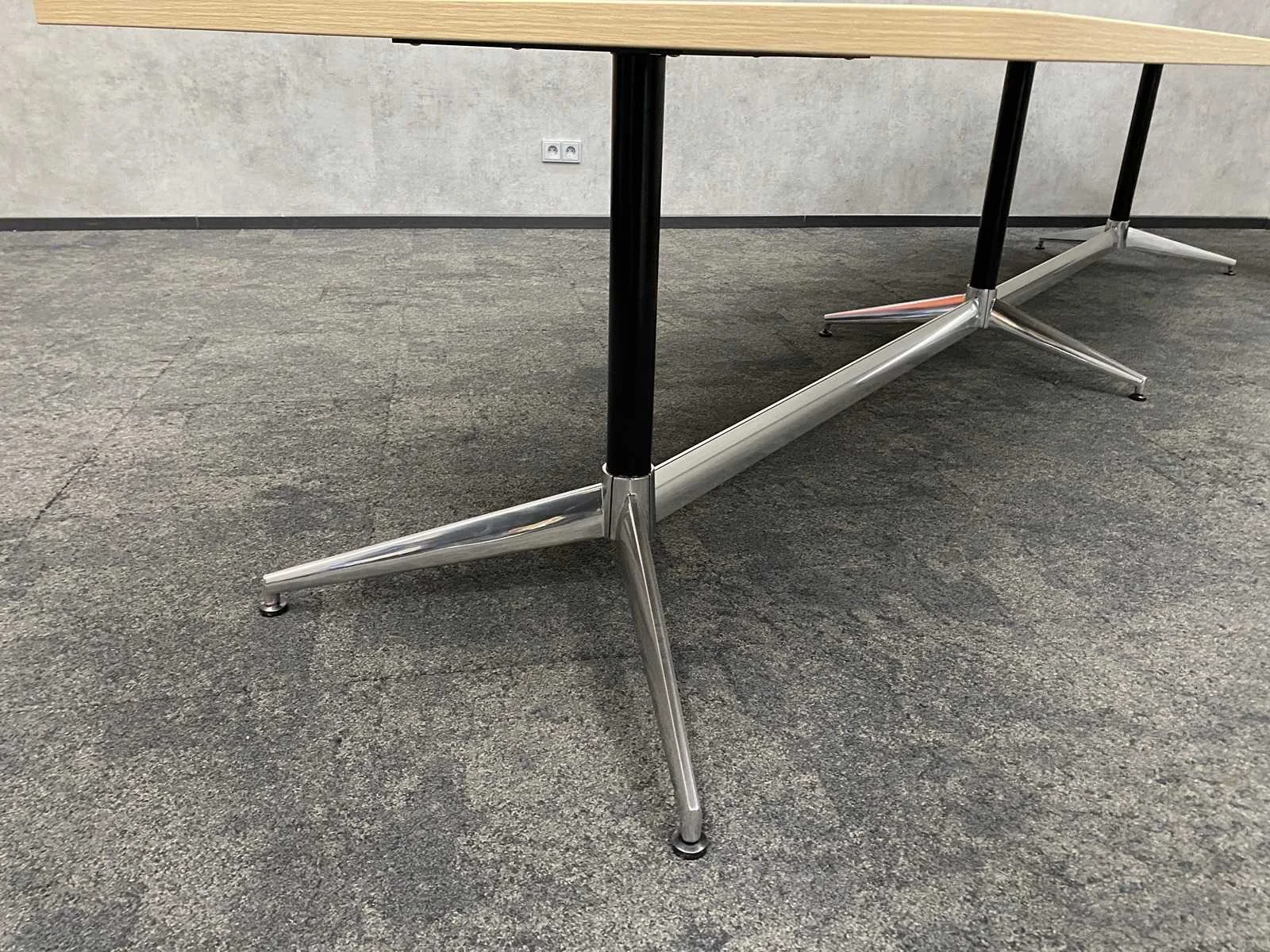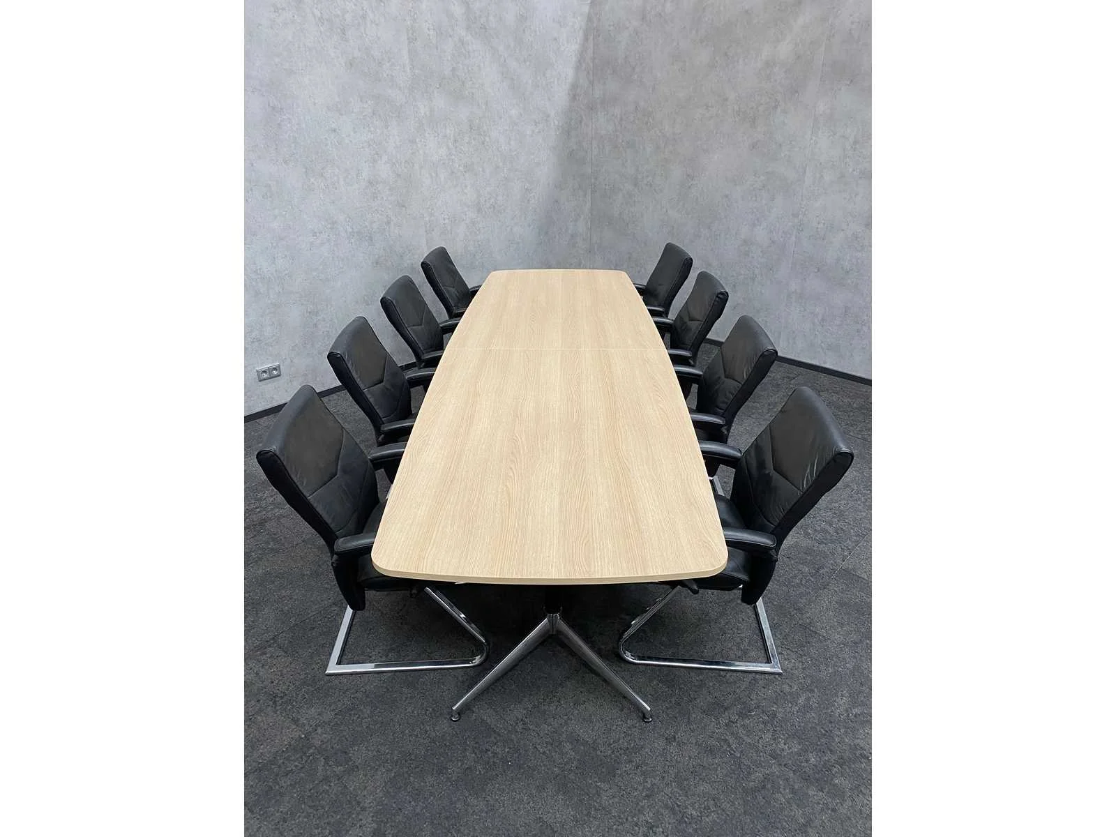 - 1x NIEUWE tafel v.v. nieuw zwart/chroom stalen design frame en nieuw 2-delig eiken melamine tafelblad met meubelspanners. afm. ca. hxbxd 73x370x120 cm. Tafel is reeds gedemonteerd (blad in 2 delen, frame in 4 dozen) ----- 8x zwart lederen conferentiestoel met chroom sledeframe en zwart lederen armleggers. Nee Kleur: chroom, eiken, zwart Lengte: 370cm Breedte: 120cm Hoogte: 73cm