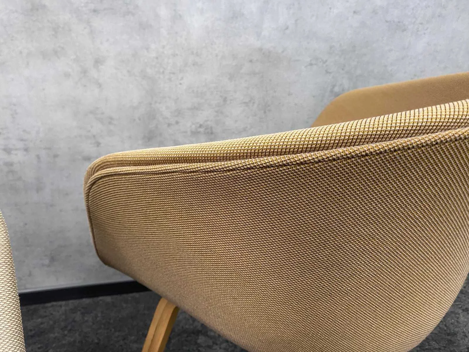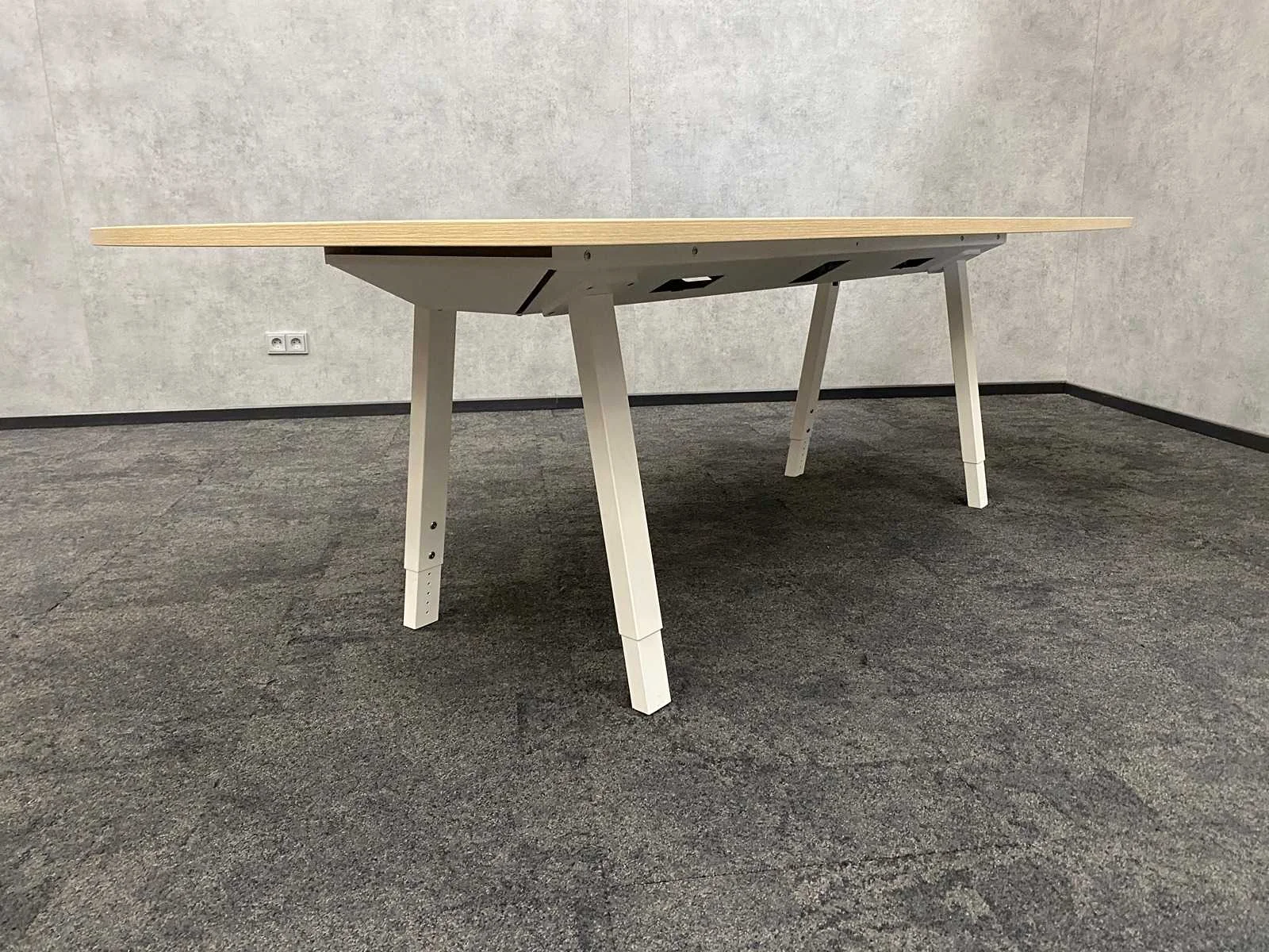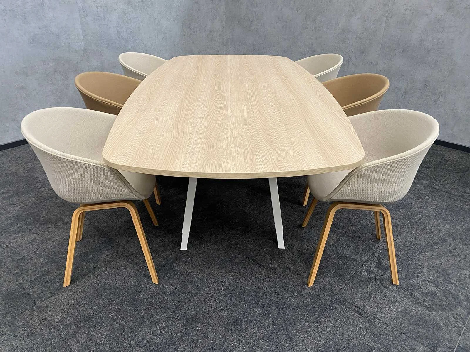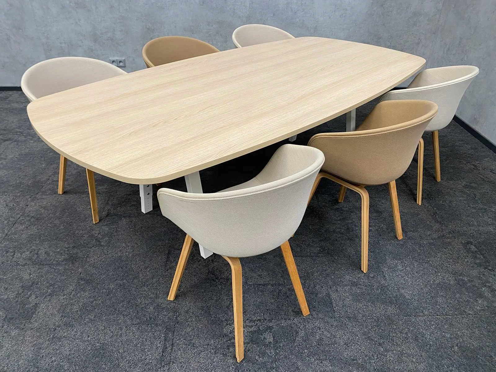 Kavel bestaande uit 1x Vitra Joyn conferentie tafel. tafel v.v. nieuw melamine eiken kleur tafelblad en wit metalen in hoogte instelbaar Vitra Joyn frame. ---- 6x HAY design kuip stoel v.v. beige stoffering en houten onderstel. No Merk: Vitra Joyn/ HAY Kleur: wit, eiken, beige, hout Lengte: 240cm Breedte: 120cm