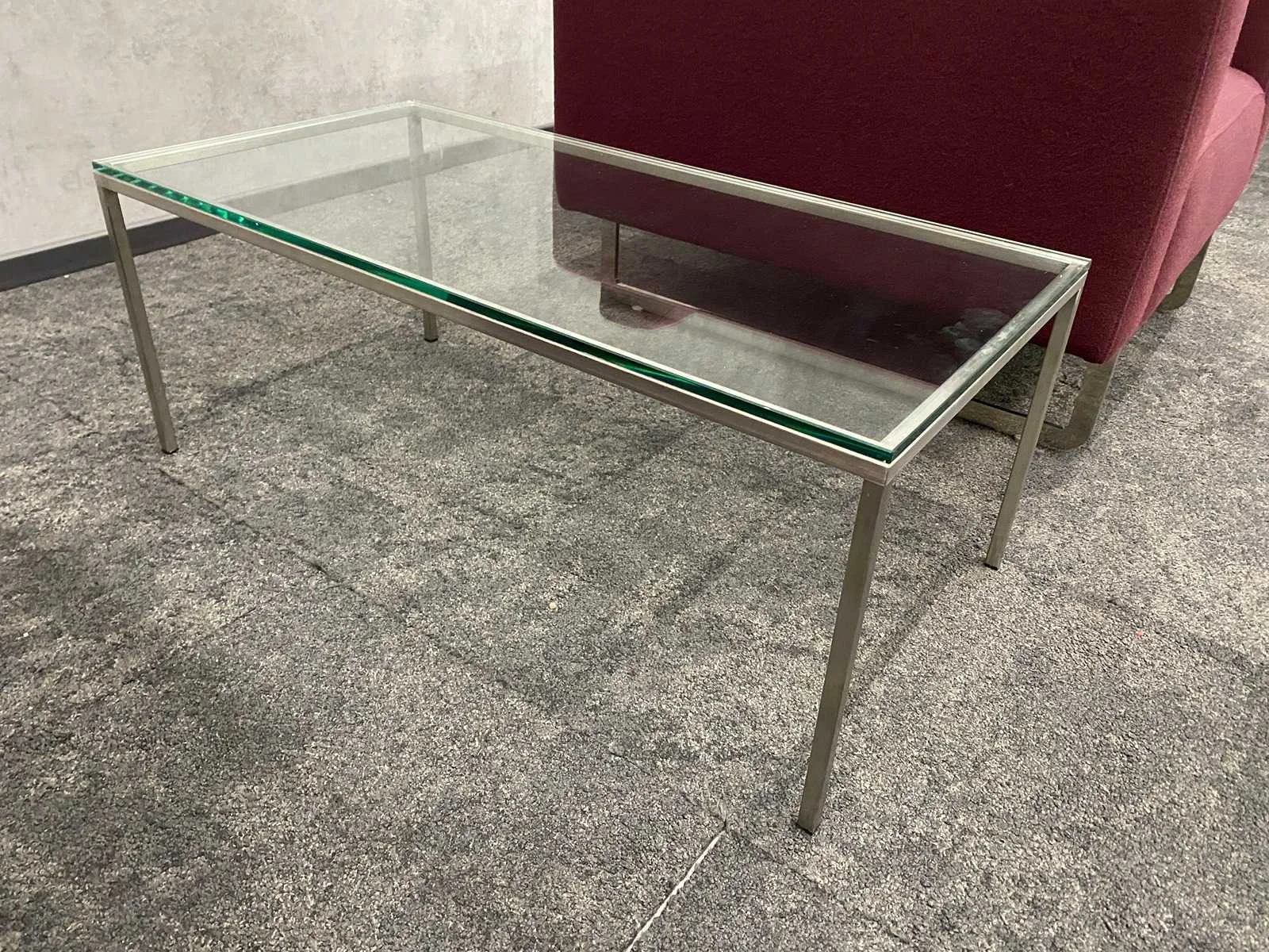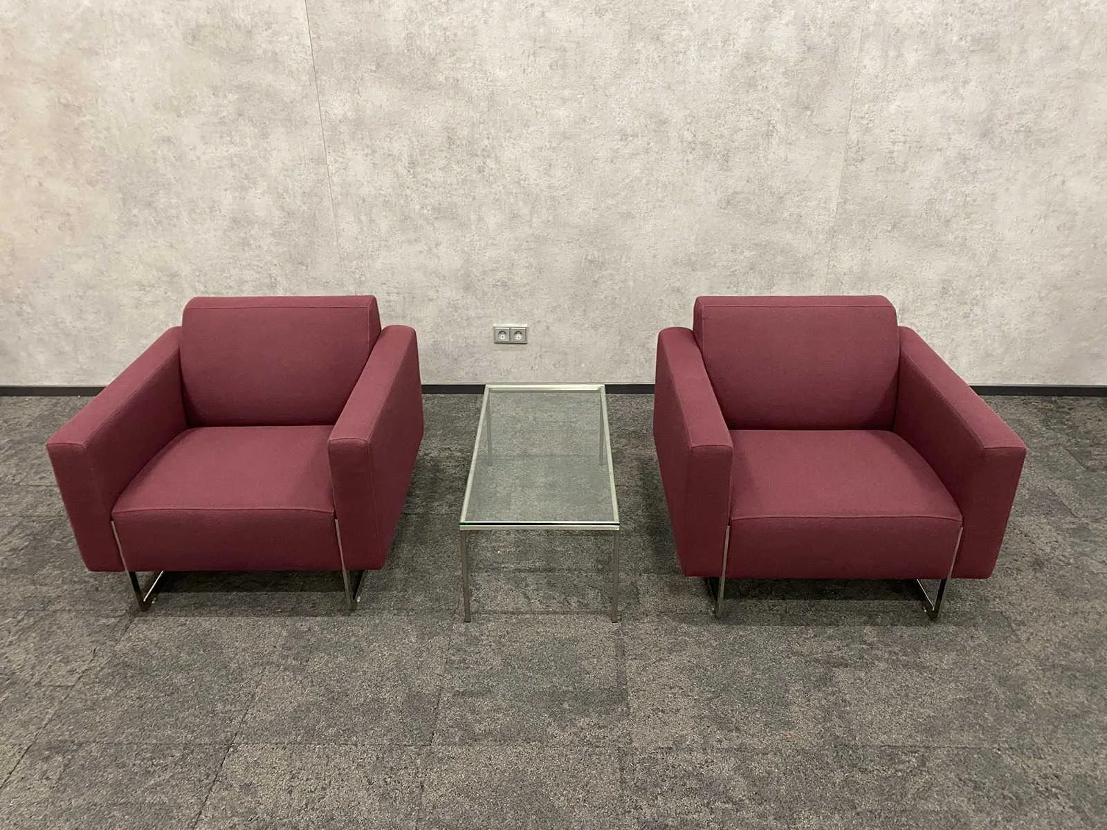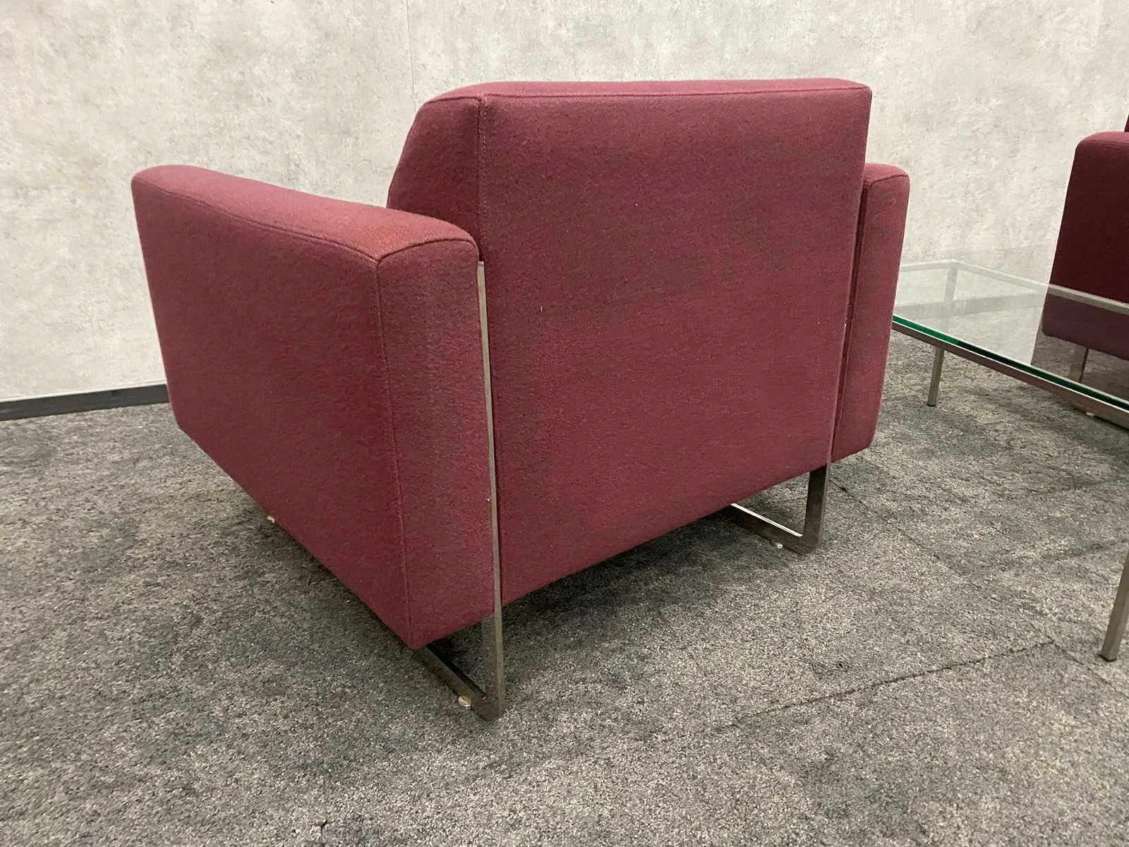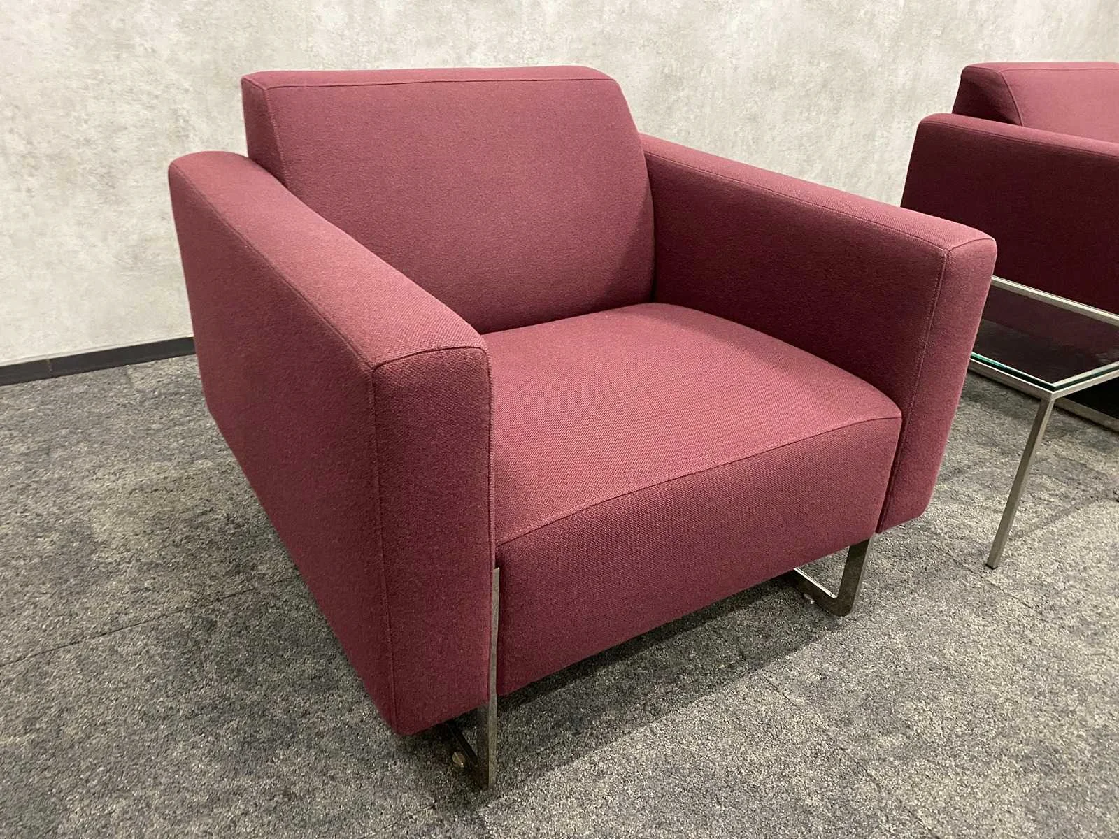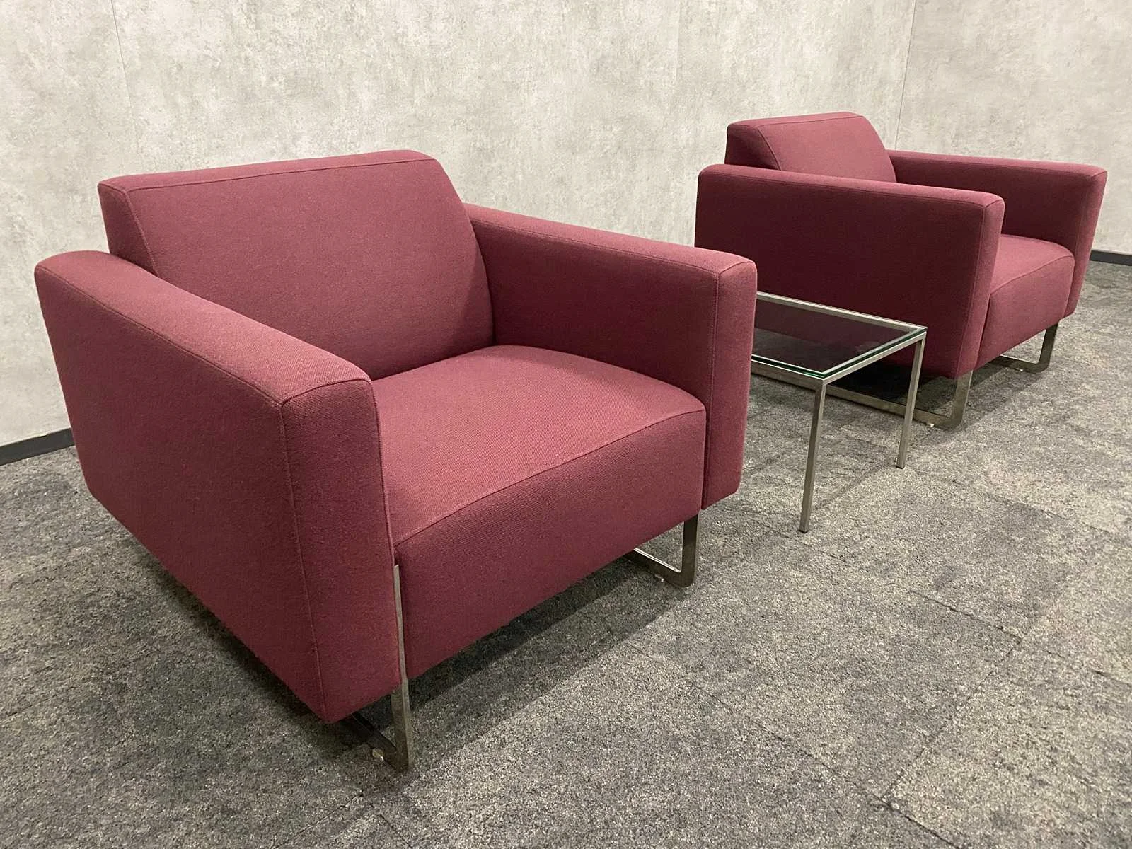 Designer René Holten -- kavel bestaande uit 2x Artifort Mare design fauteuil. Afm. ca. hxbxd 74x87x84 cm. zithoogte ca. 40 cm. ---- 1x RVS/ glazen salontafel. Afm. ca. hxbxd 35.5x40x90 cm. Nee Merk: 2x Artifort Mare