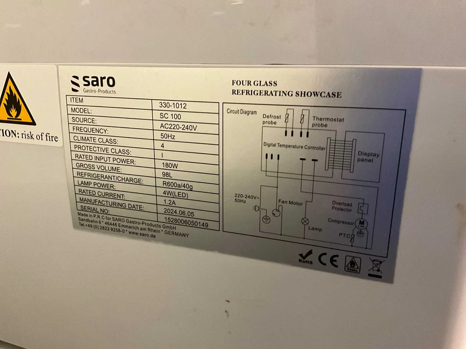 Ongebruikt ; 180 watt. Nee Merk: Saro Type: SC 100 Bouwjaar: 2024 Ingebouwde koelcompressor: true Aansluiting: 230V Totale afmeting L: 430mm Totale afmeting Breedte: 390mm Totale afmeting Hoogte: 110mm Capaciteit.: 98l