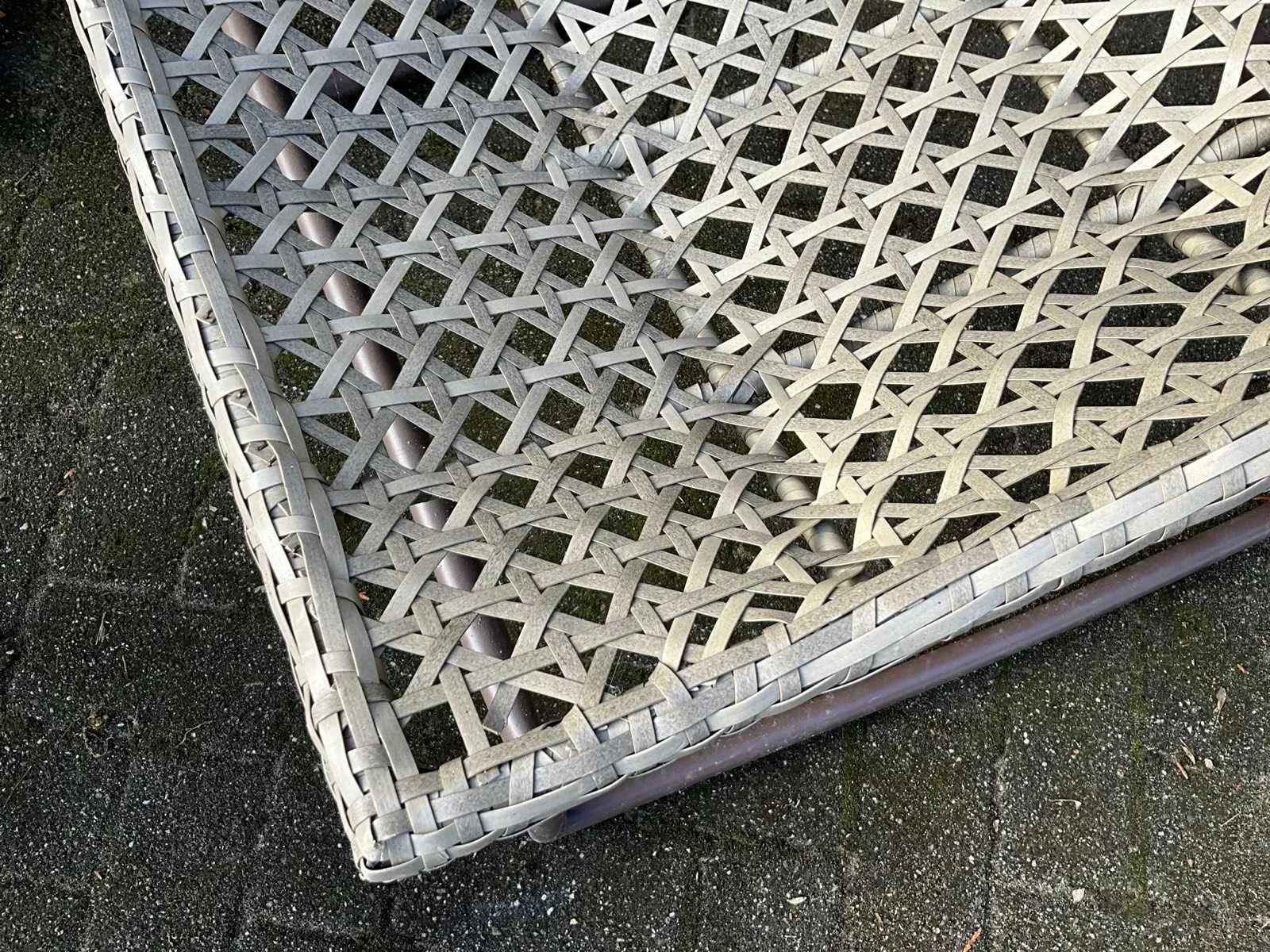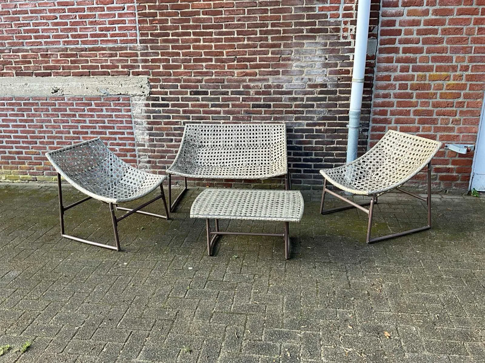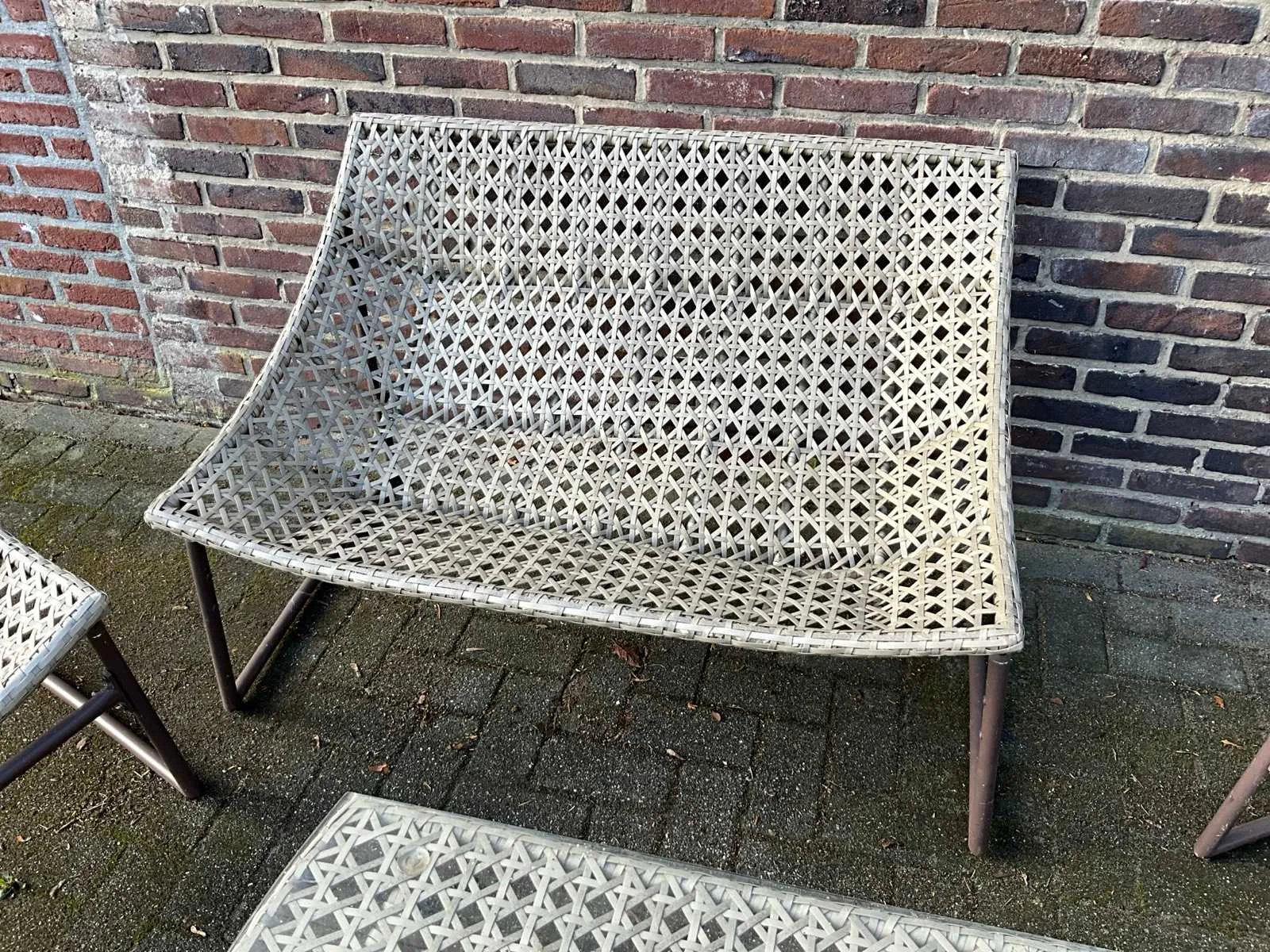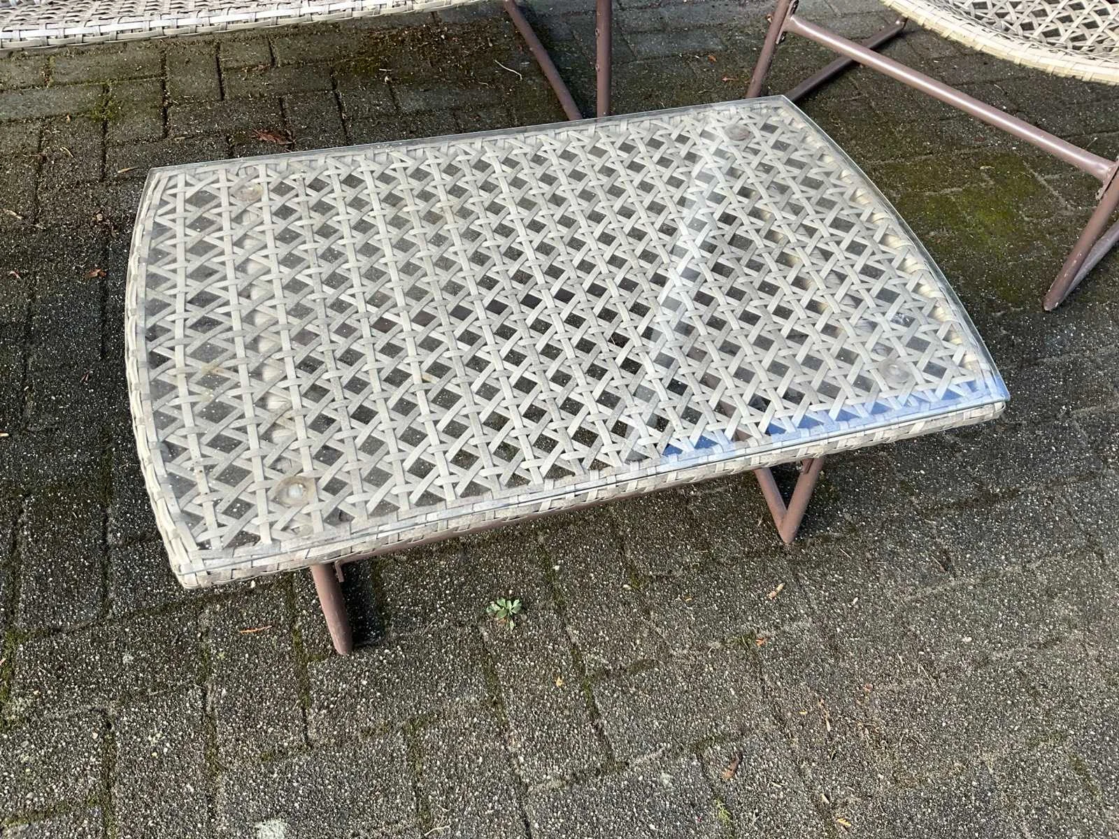 Bestaande uit 1 bank, 2 stoelen, tafel met glasplaat en kussens Nee Kussens: true Lengte: 130cm Breedte: 70cm Hoogte: 85cm Zithoogte: 45
