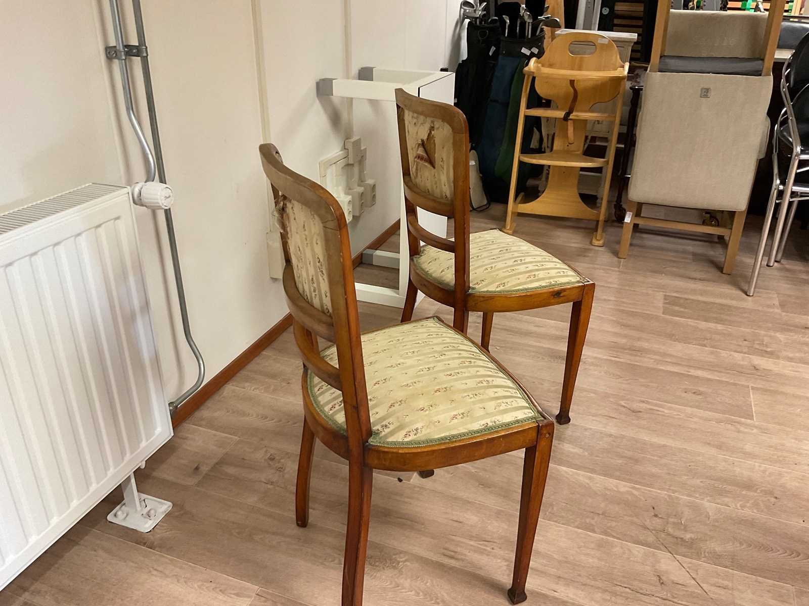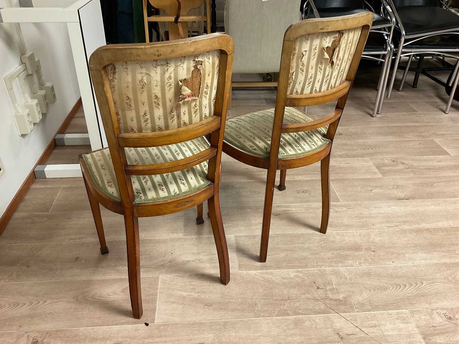 Elegante antieke stoeltjes, hout met stof, gebruikssporen en achterkant beschadigde stof Nee