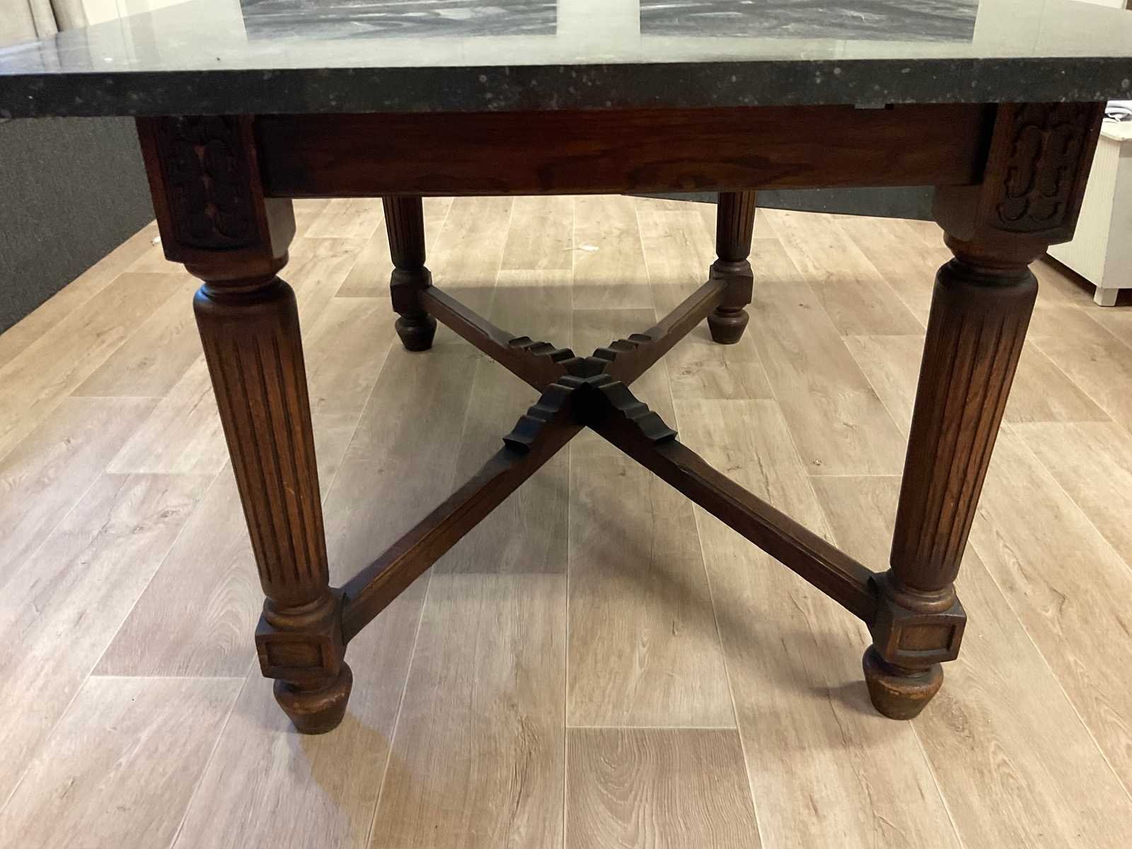 Tafel met houtsnijwerk en blad van blauwe hardsteen Nee Vorm: Rechthoekig Lengte: 150cm Breedte: 101cm Hoogte: 75cm