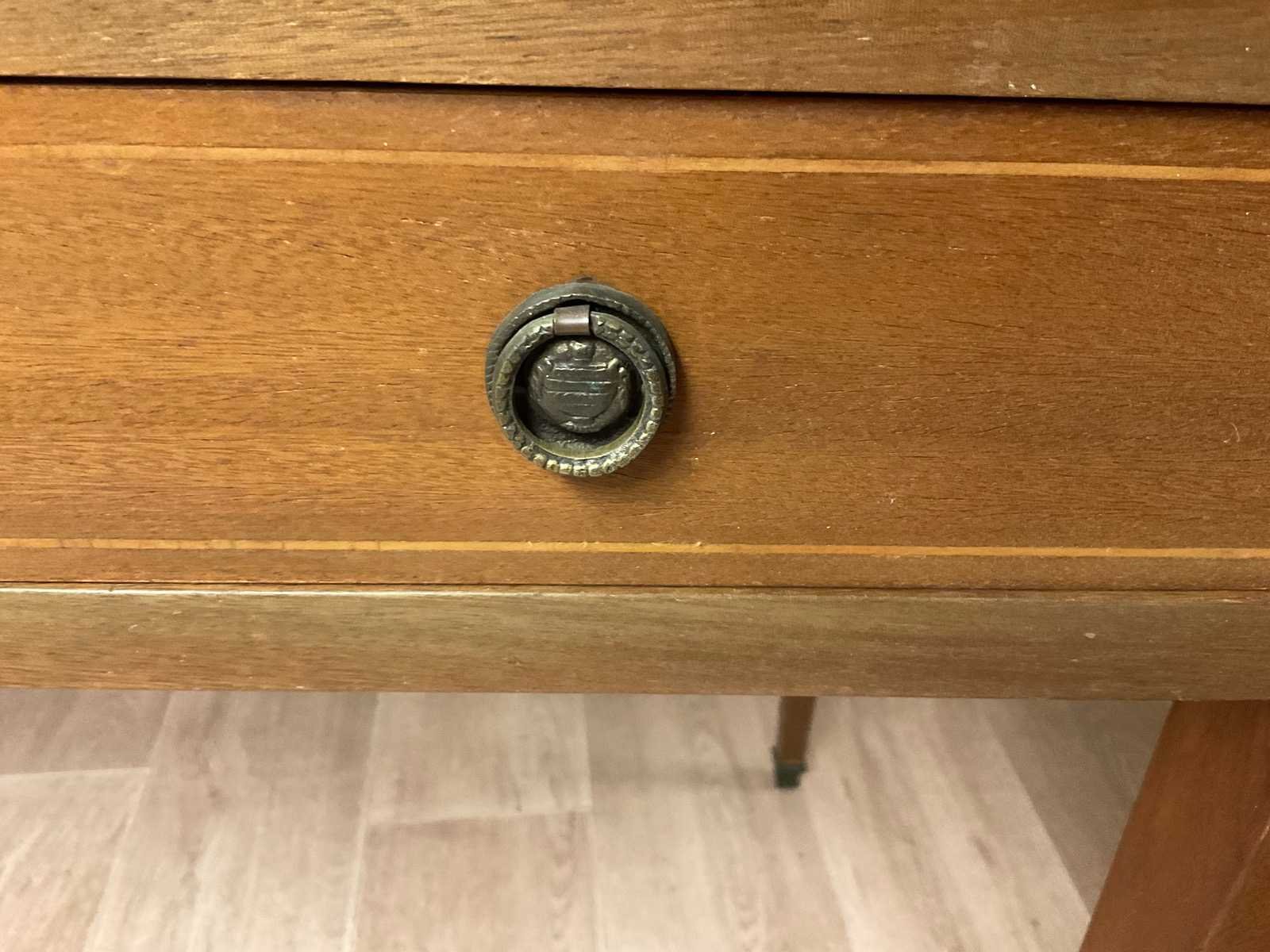 Elegante side table met rood lederen blad ( blad ligt los) Nee Lengte: 60cm Breedte: 110cm Hoogte: 78cm