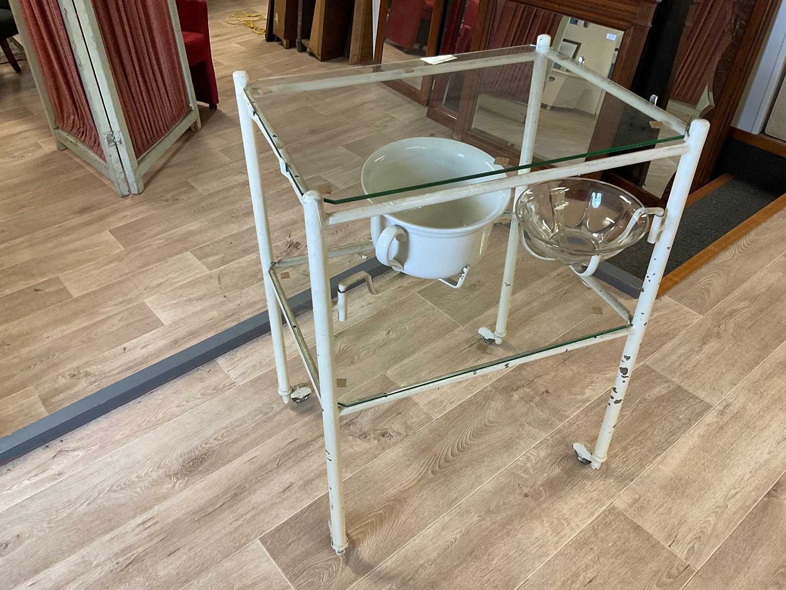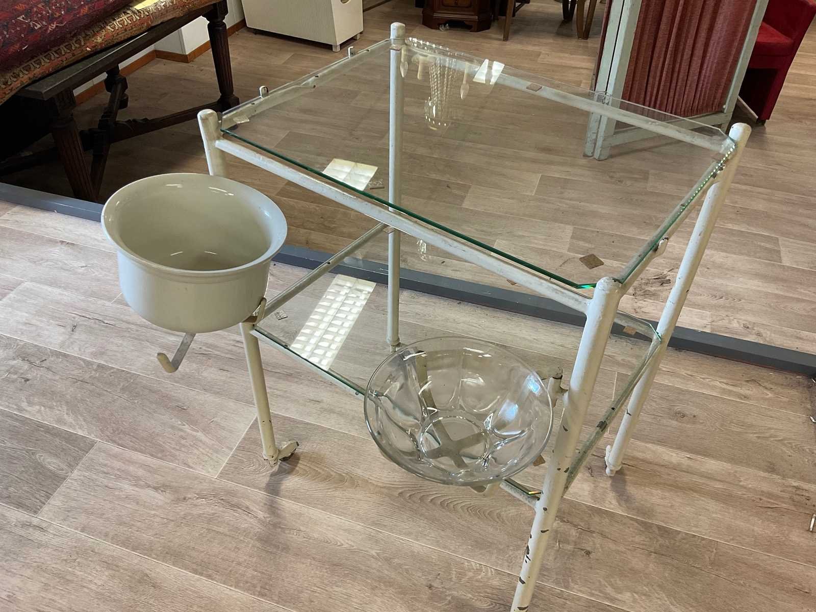 Antiek ziekenhuis tafeltje met twee glazen bladen en uitdraaibare armen, metaal