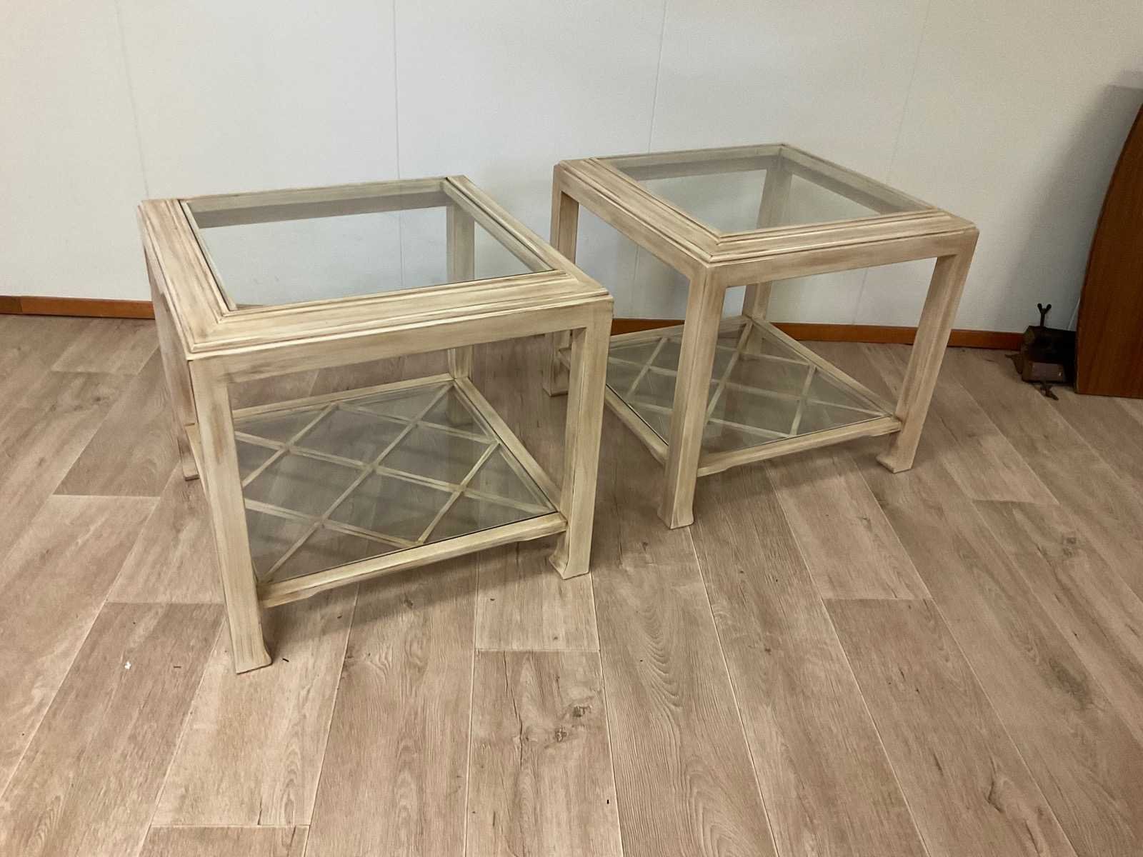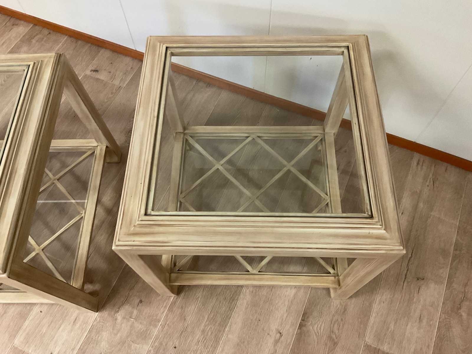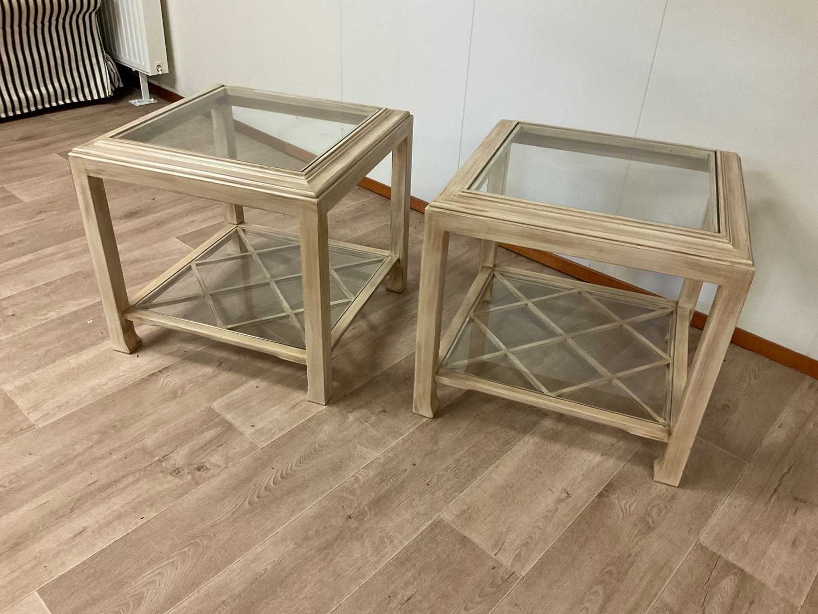 Twee identieke bijzettafeltjes met glas Nee Lengte: 60cm Breedte: 60cm Hoogte: 60cm