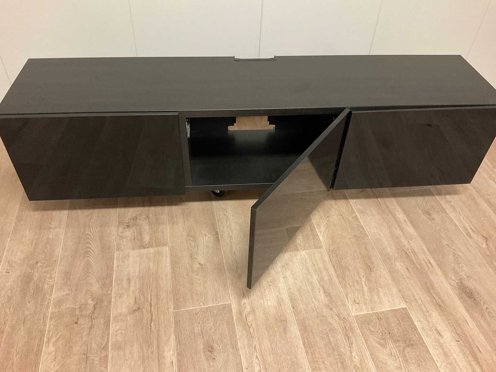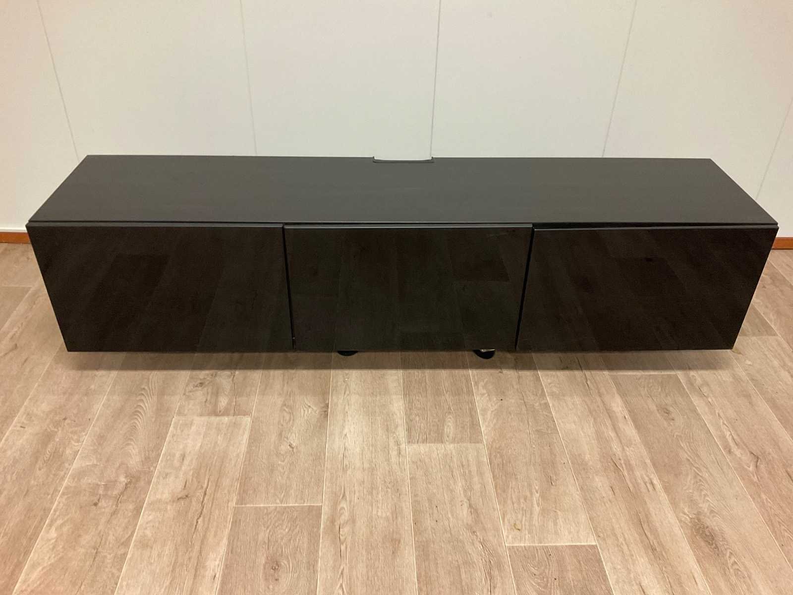 Lage kast, TV meubel (staat op trolley, niet inbegrepen) Kan ook hangen, opent via druk Nee Lengte: 180cm Breedte: 41cm Hoogte: 38cm