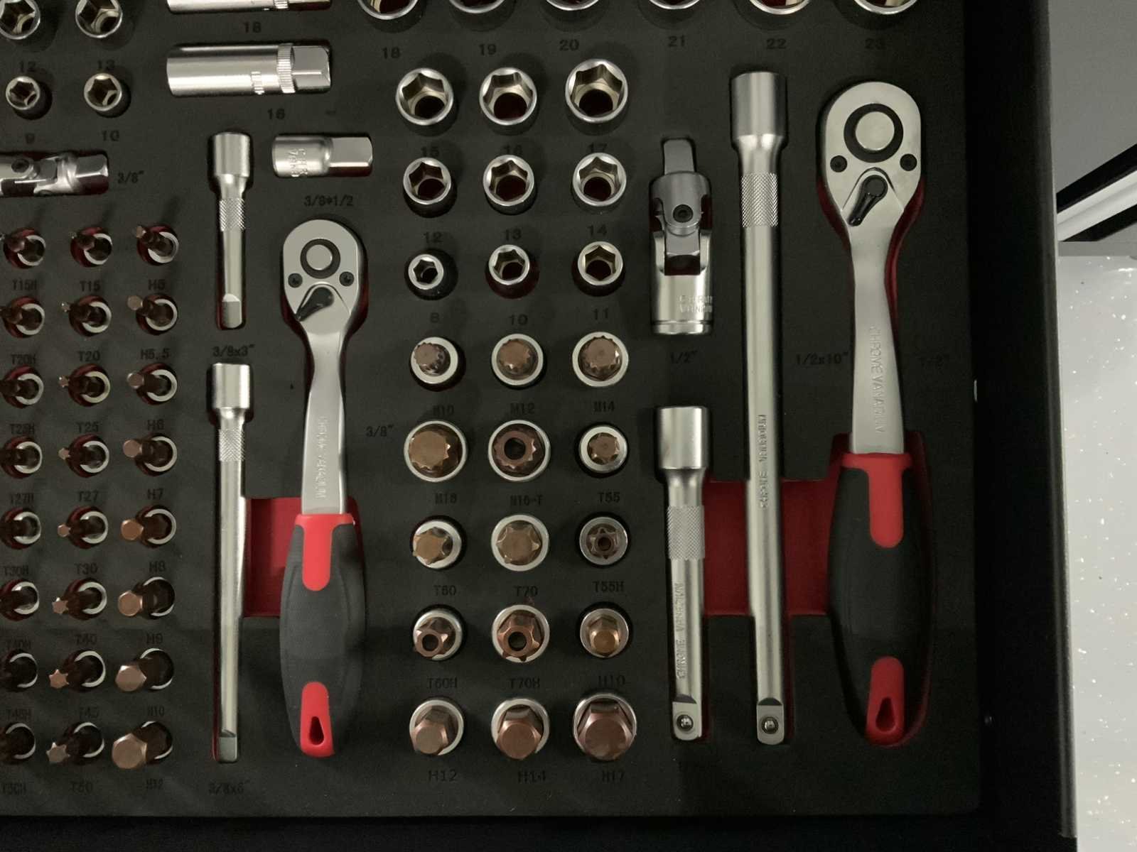 13 Laden, 9 gevuld, 327 pcs gereedschap. Kar met afneembare topbox Top box met 8 laden en boven klep Kar met 5 laden en kast met dubbele openslaande deuren Hoeken schuin afgewerkt met bumpers Stevig kunststof handvaten 2 zwenkwielen waarvan 2 geremd Hoge kwaliteit cilinder sloten Mat zwart afgewerkt met rode accenten Nee Merk: Stahlgruppe Type: XL PRO Deluxe Bouwjaar: 2025 Aantal laden: 13 Met inhoud: true