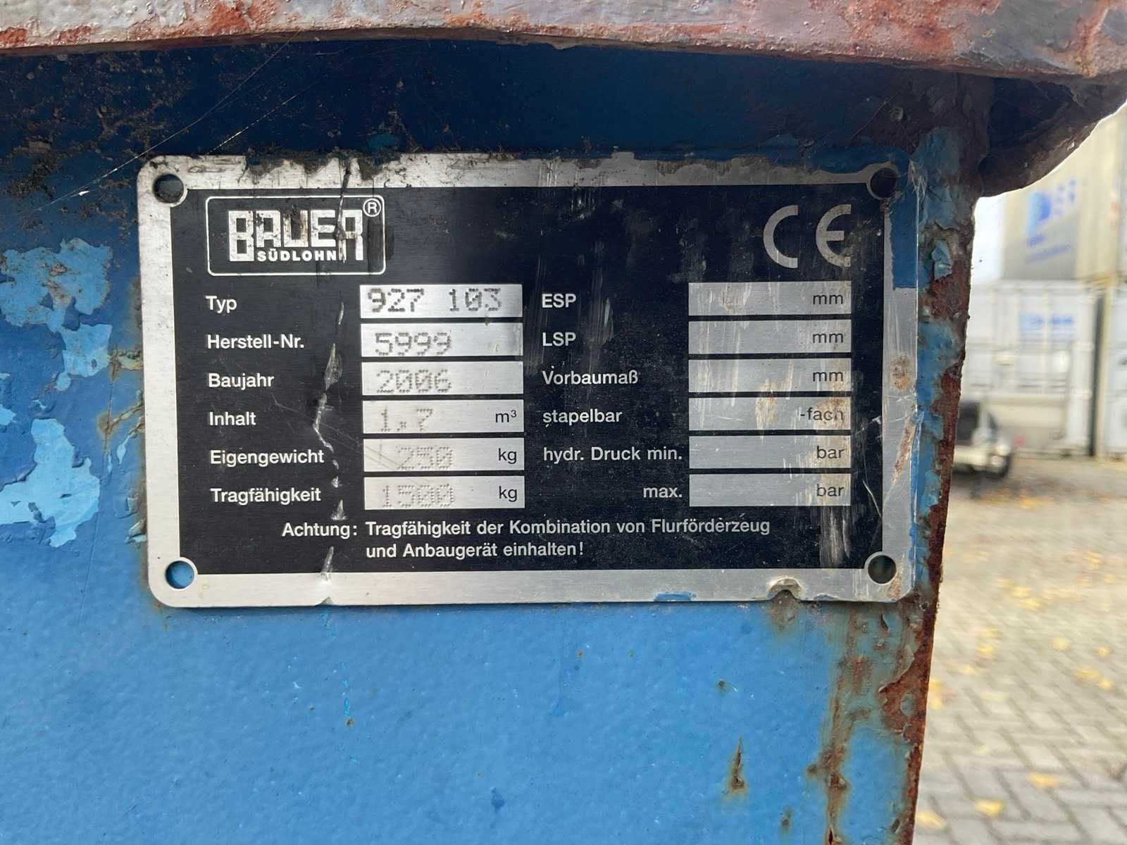 Inhoud: 1,7 m3, No Merk: Bauer Type: 927 103 Bouwjaar: 2006 Eigen gewicht: 250kg Totale afmeting L: 1700mm Totale afmeting Breedte: 1540mm Totale afmeting Hoogte: 1100mm