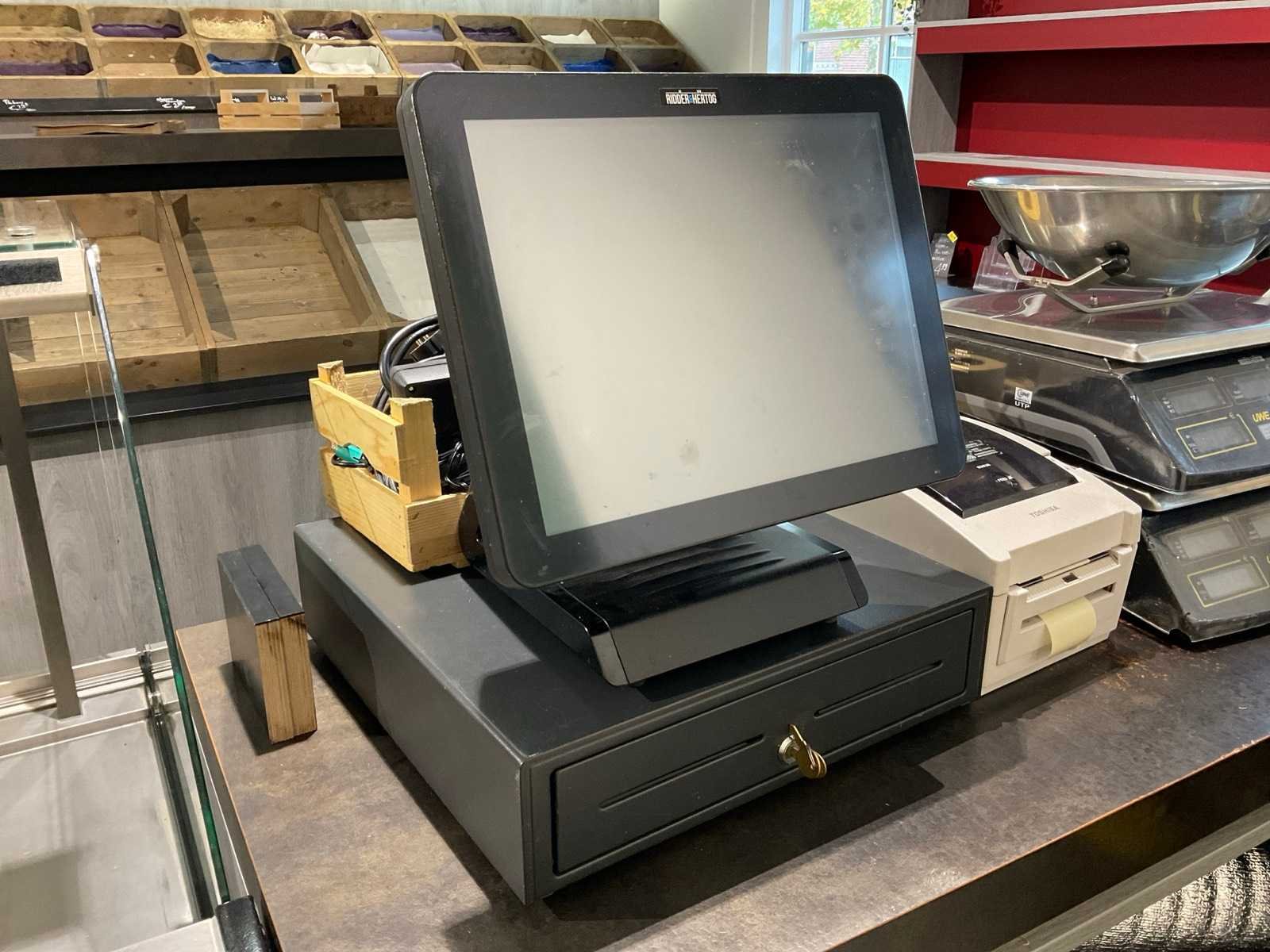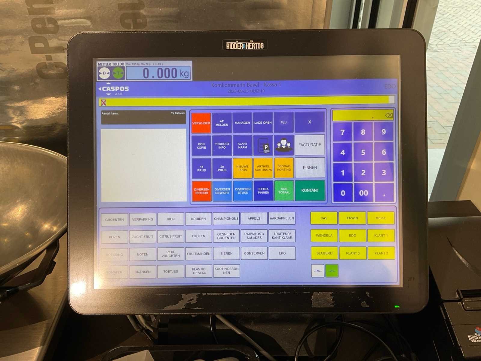 CasPos, bestaande uit 2 kassa systemen, 2 gekoppelde weegschalen (Riba Asep 15 en Mettler Toledo Ariva), 1 losse weegschaal (Riba Asep 15), bolcanner, handscanner, CCV pinautomaat (A80 + A35), Toshiba stickerprinter met reserverollen, bonnenprinter, 2x kassalade, Brother laserprinter, Brother labelprinter, dell monitor, oc (met CASMAN kassa backend software) No Merk: De Ridder & den Hertog