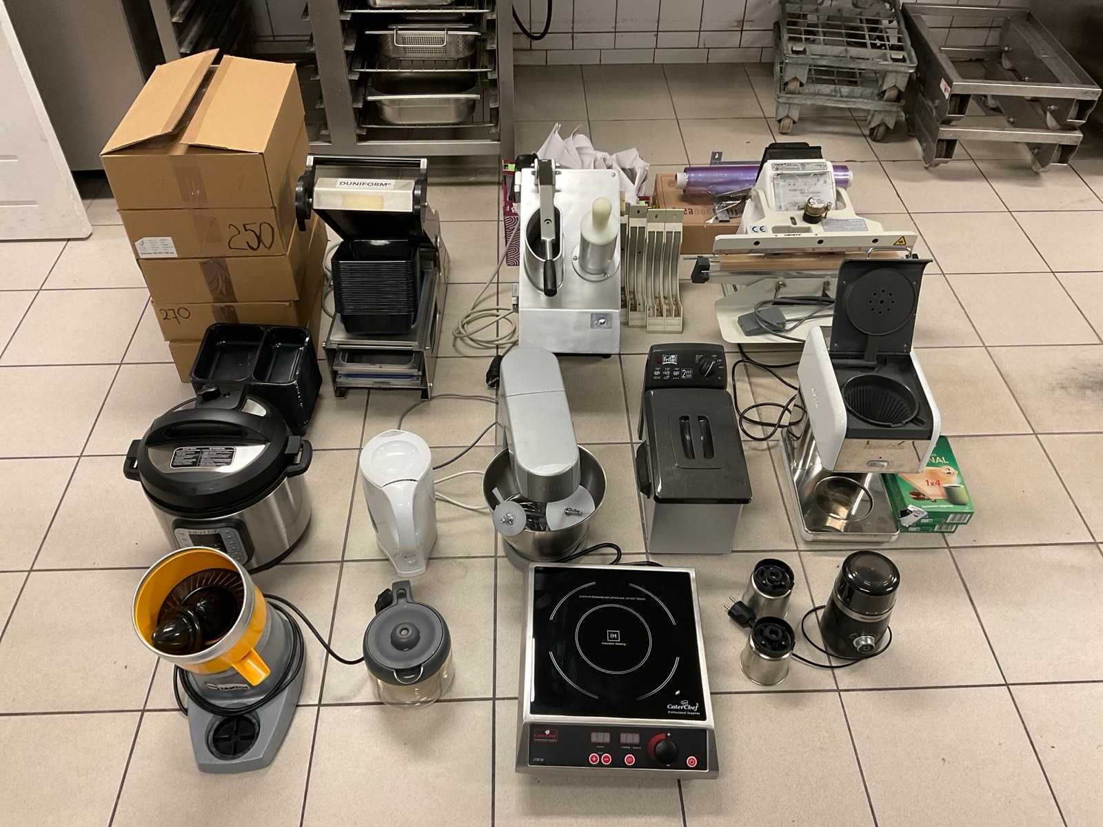 Bestaande uit: Duniform seal apparaat (anti condens zakken los erbij), snijmachine (diverse losse schijven erbij), Hanato seal apparaat, koffiezetapparaat, fritel friteuse, Kenwood mixer, waterkoker, Instant Pot citruspers, inductie kookplaat, Homtone miniblender No