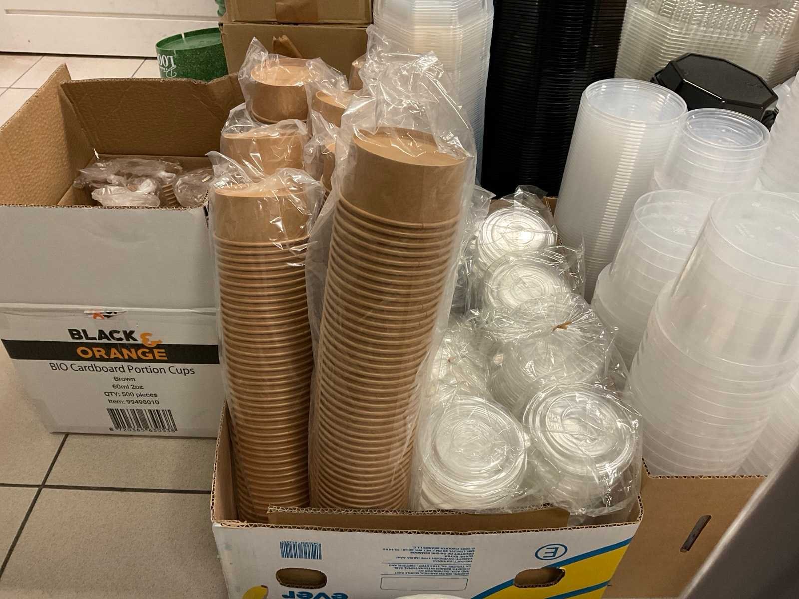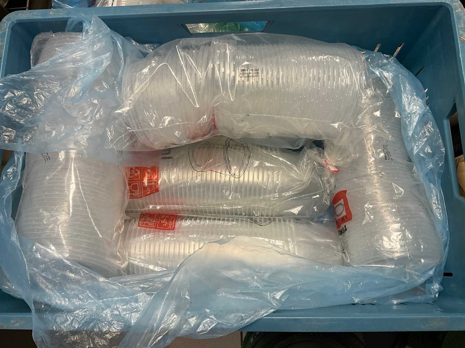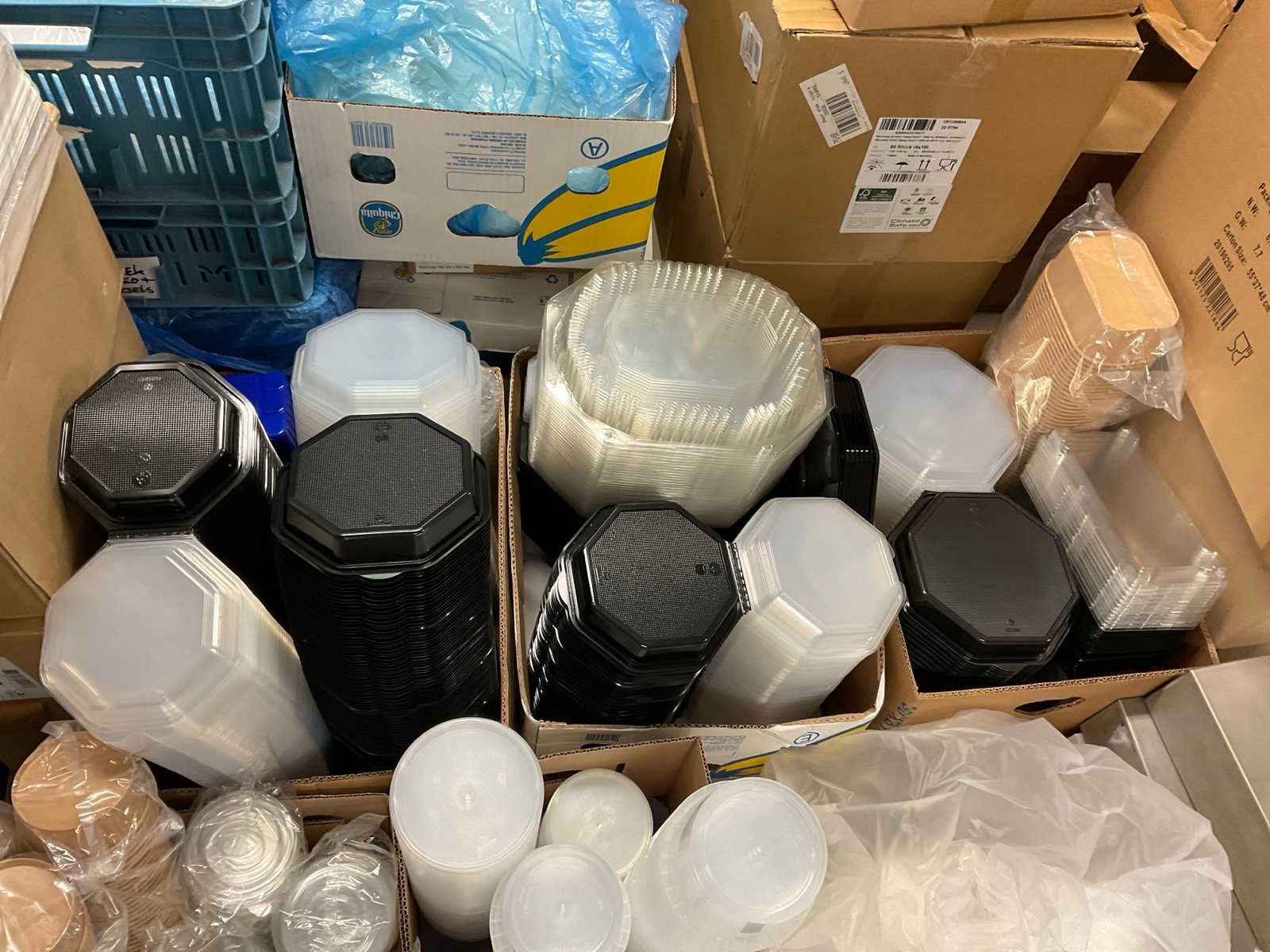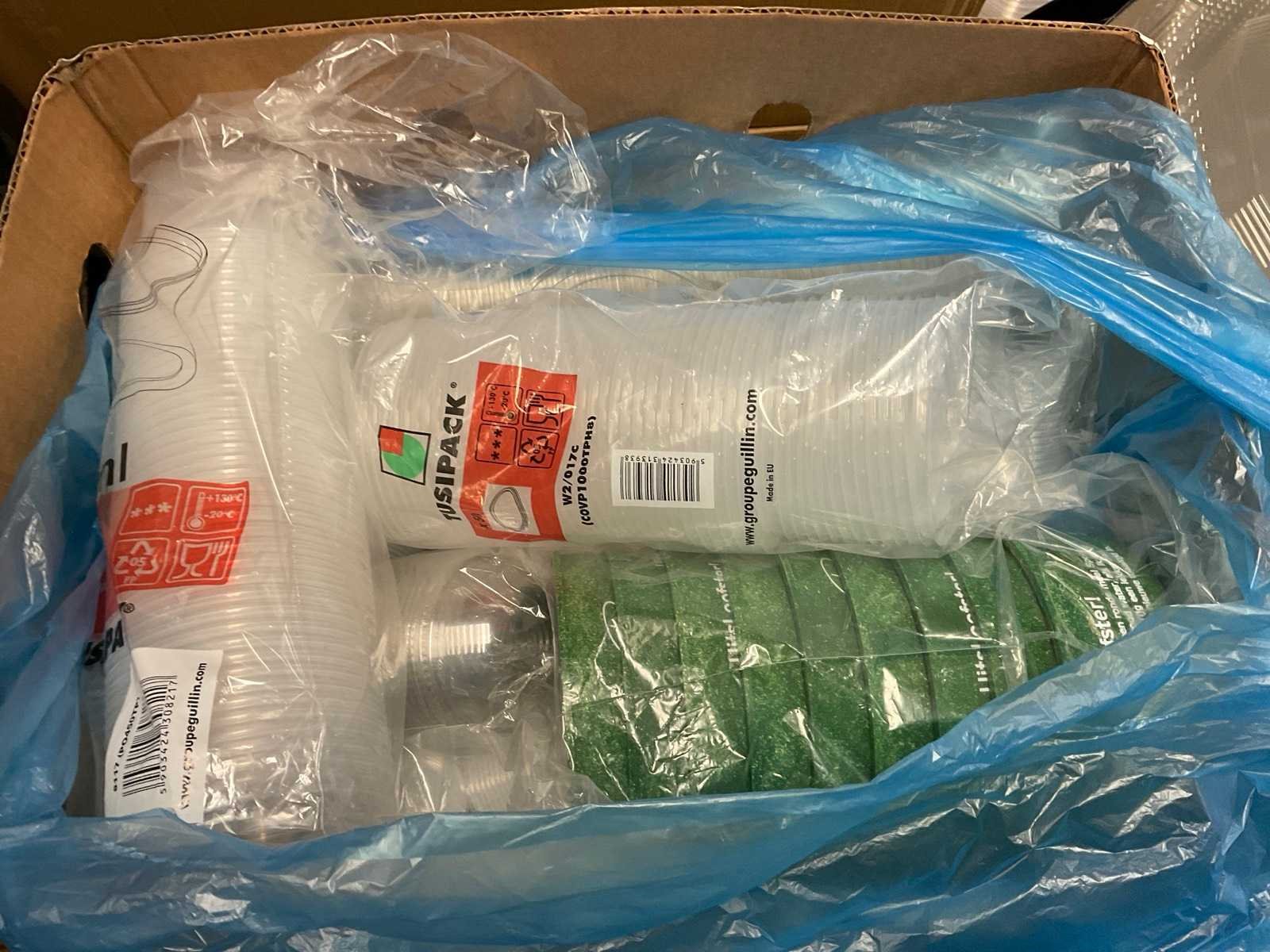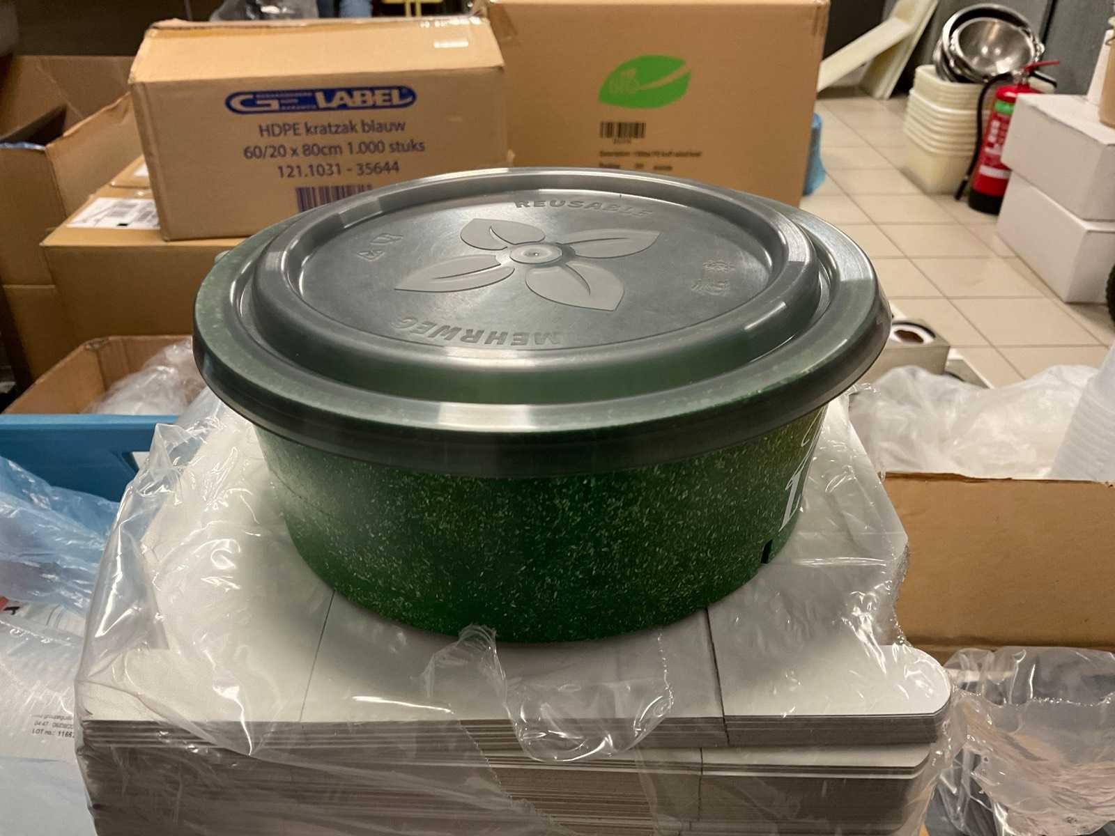 Bestaande uit onder andere: hard kunststof bakken (diameter 180mm), kunststof bakken in diverse uitvoeringen, LDPE zakken met dispensers, kraft maaltijdberpakkingen, metalen staander voor plastic zakken, No