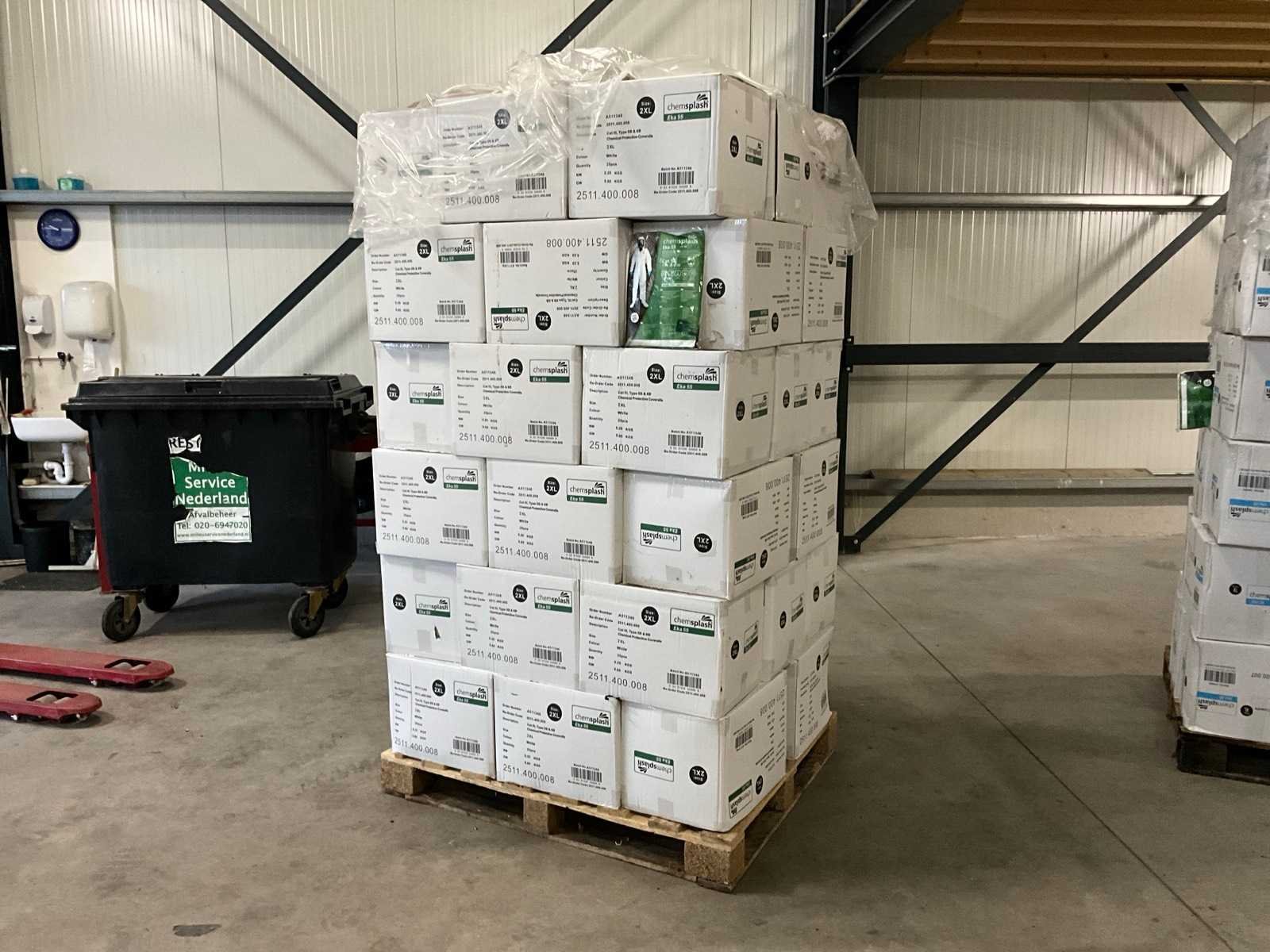 Betreft partij van 48 dozen ieder met 25 stuks; 1 pallet 1000x1200x2100mm (lxbxh) Nee Merk: Chemsplash Model: Eka 55 Cat. III Maat: 2 XL