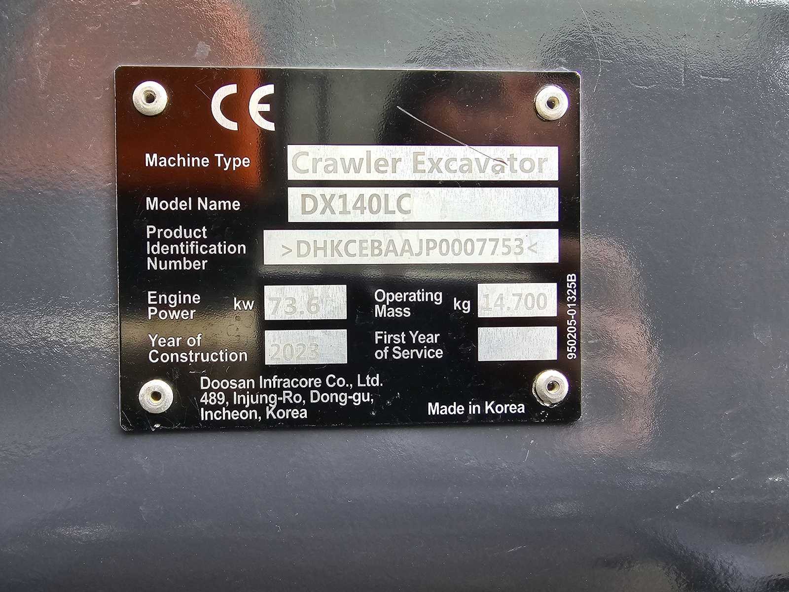 Voorzien van: CE goedkeuring; Hydraulische snelkoppeling; CW30 aansluiting; slangbreuk beveiliging; duwblad; hamerleidingen; achteruitrijcamera; informatiedisplay; werkverlichting; airconditioning. Nee Merk: Develon Type: DX140LC Bouwjaar: 2023 Serienummer: DHKCEBAAJP0007753 Merk motor: Develon Motorvermogen (kW): 73kW Aantal cilinders: 6 Brandstof: Diesel Rups breedte: 600mm Cabine: true Afgelezen urenstand: 22 Eigen gewicht: 14700kg Totale afmeting L: 8000mm Totale afmeting Breedte: 2600mm Totale afmeting Hoogte: 3200mm