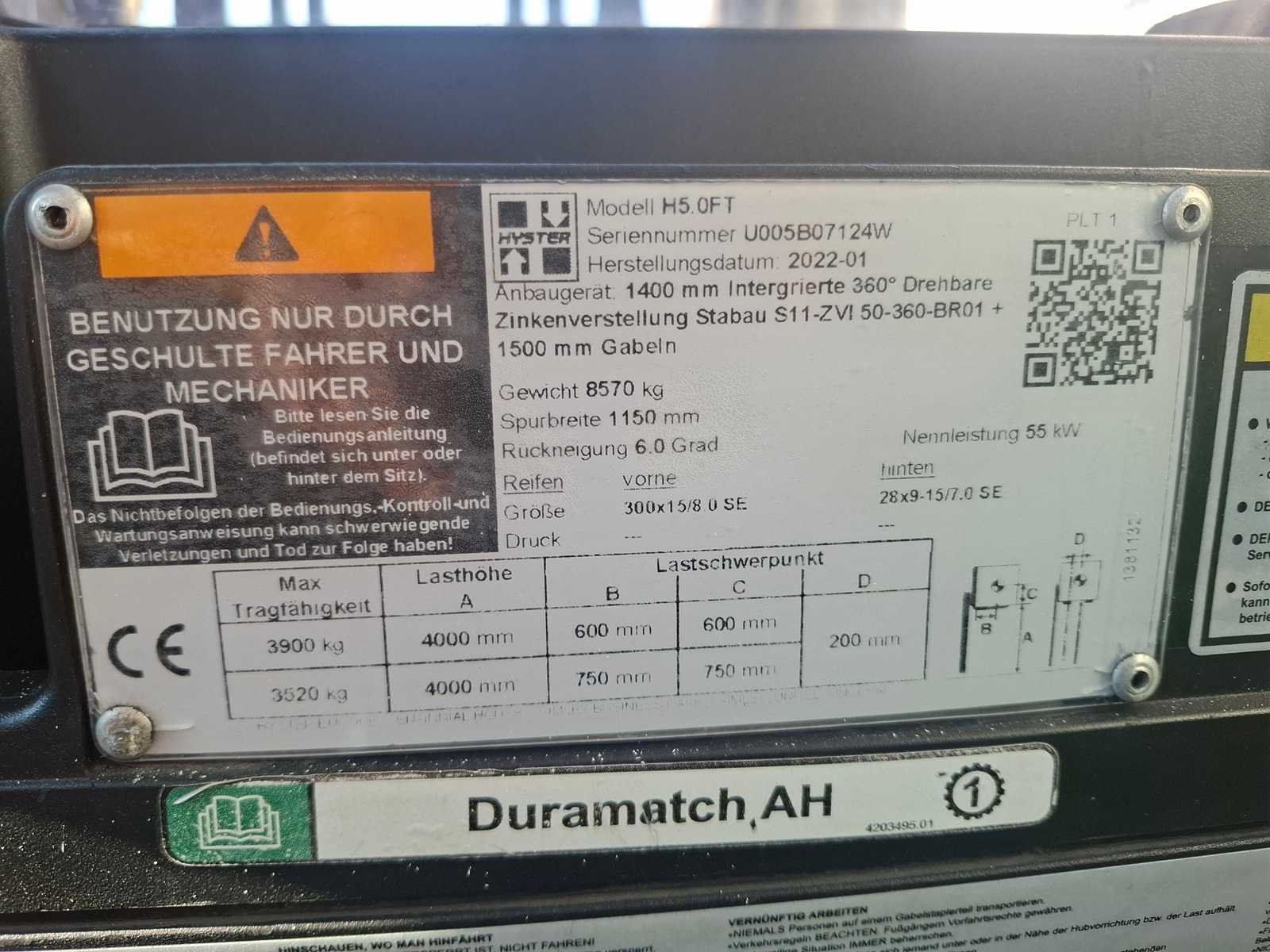 Nee Merk: Hyster Type: H5.0FT Bouwjaar: 2022 Serienummer: U005B07124W Brandstof: Diesel Aantal wielen: 4 Afgelezen urenstand: 4714 Roterend vorkenbord: true Hydraulisch verstelbare lepels: true Duplex mast: true Eigen gewicht: 8570kg Hefvermogen: 5000kg Lepellengte: 1500mm Max. hefhoogte: 3900mm Hefhoogte: 3900mm Vol rubber banden: true Minimale doorrijhoogte: 2170mm Totale afmeting L: 5200mm Totale afmeting Breedte: 1157mm Totale afmeting Hoogte: 4660mm Diesel: true