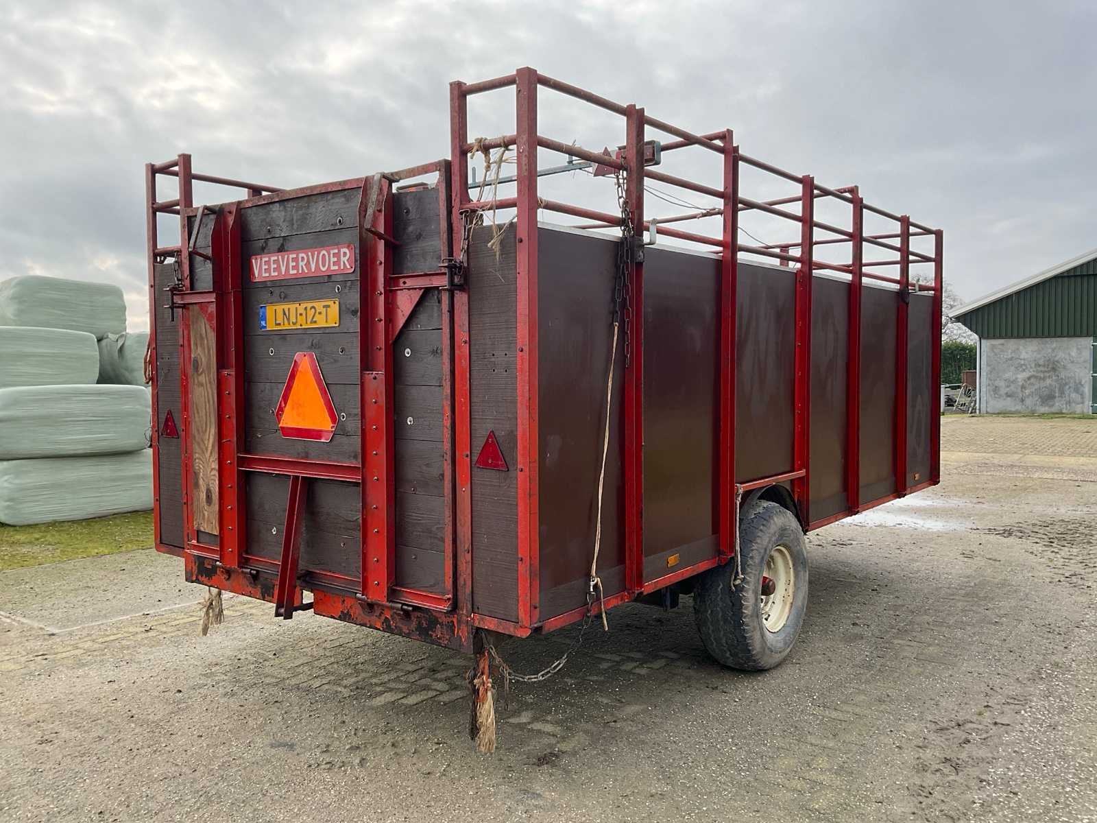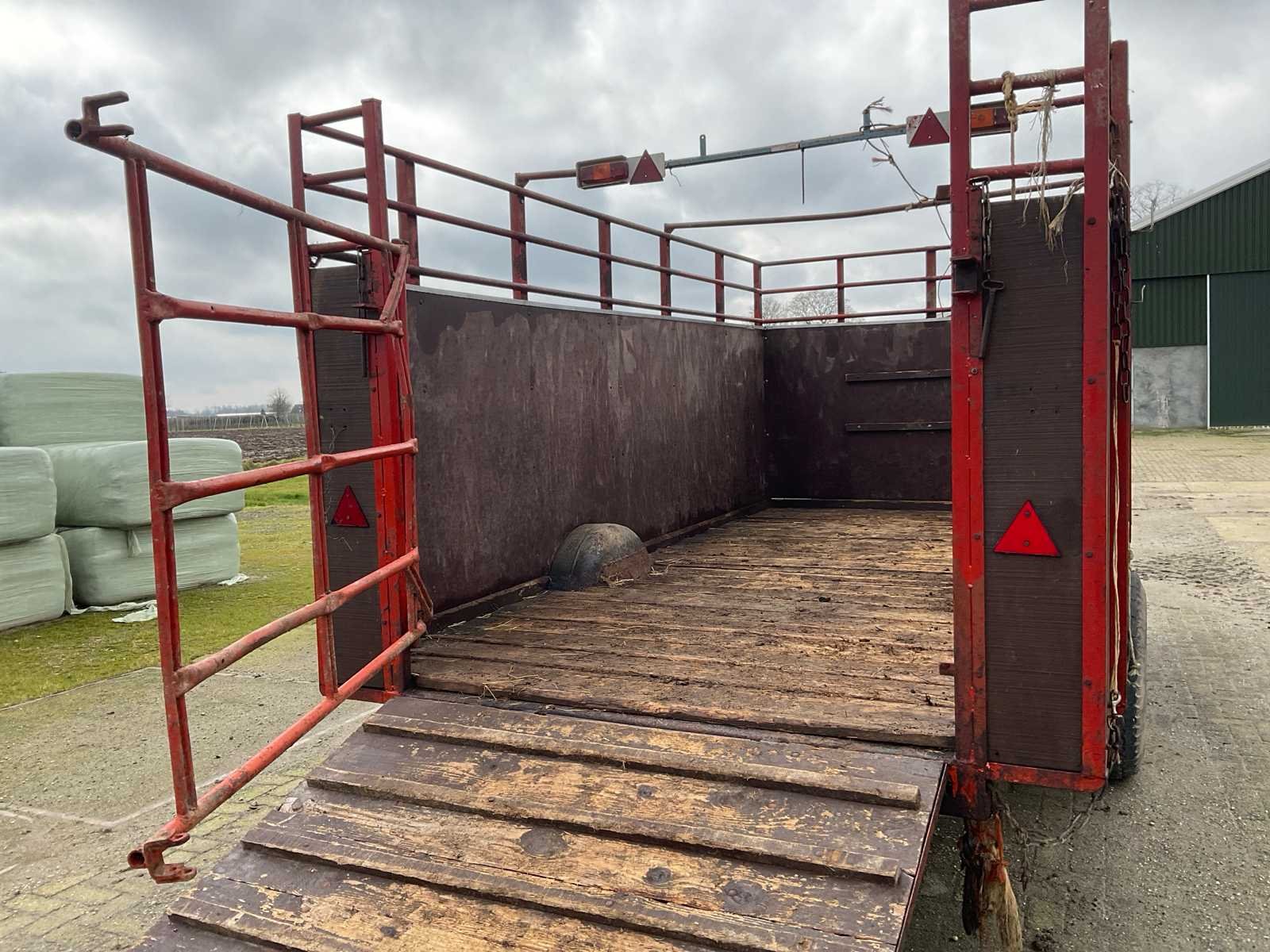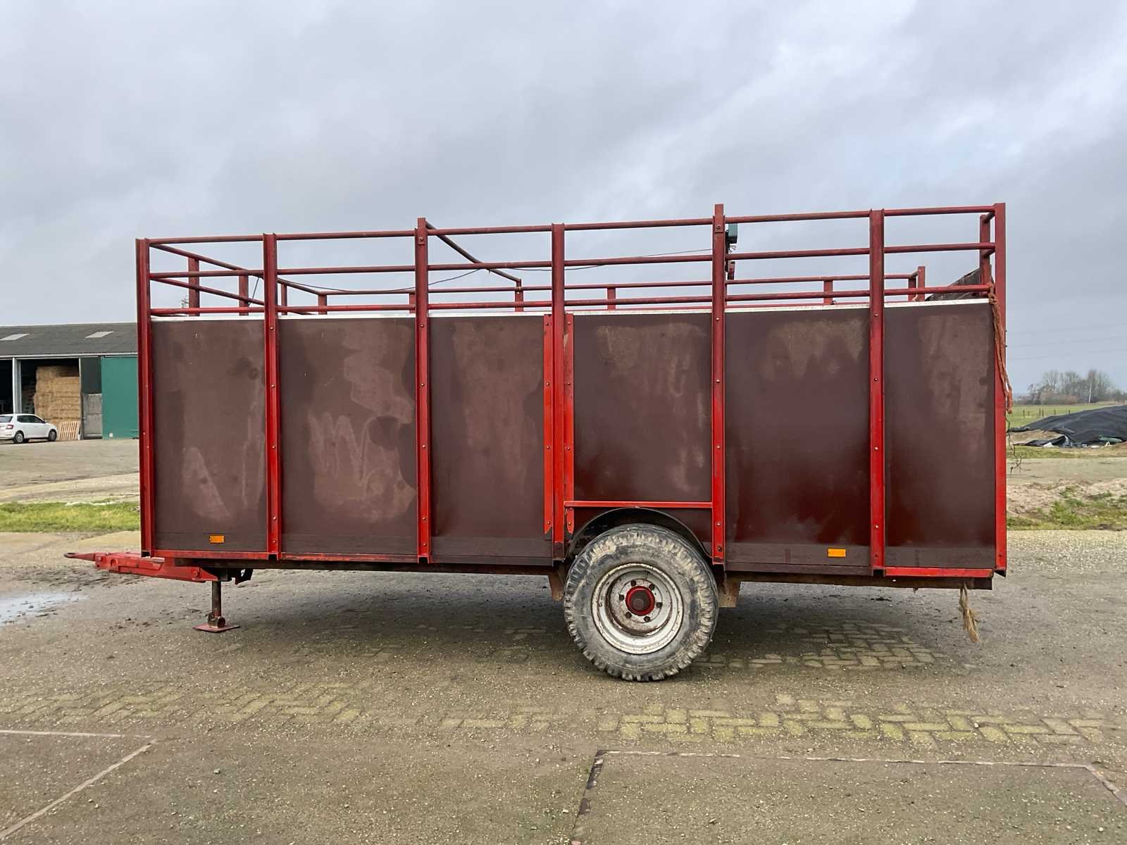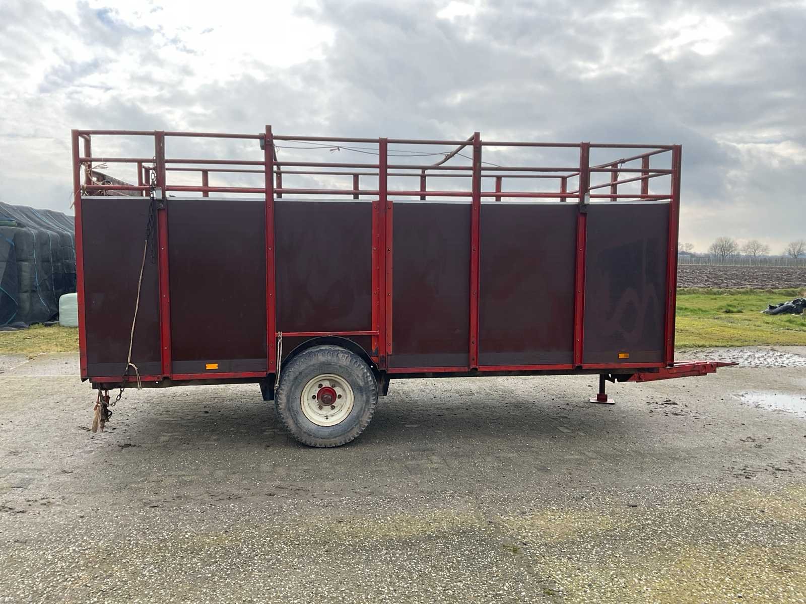 Plaats voor 6 koeien, voorzien van: trekoog aanspan, steunpoot, Vredestein 11.5/89-15.3 banden, verlichting, beugels rechts voor veehekken, Nederlandse kentekenregistratie, No Merk: Krone Type: HSB 400 Serienummer: 2166 Kenteken: LNJ-12-T Afm. binnenzijde l.: 4750mm Afm. binnenzijde b: 2350mm Afm. binnenzijde h: 1480mm Totale afmeting L: 6350mm Totale afmeting Breedte: 2400mm Totale afmeting Hoogte: 2480mm