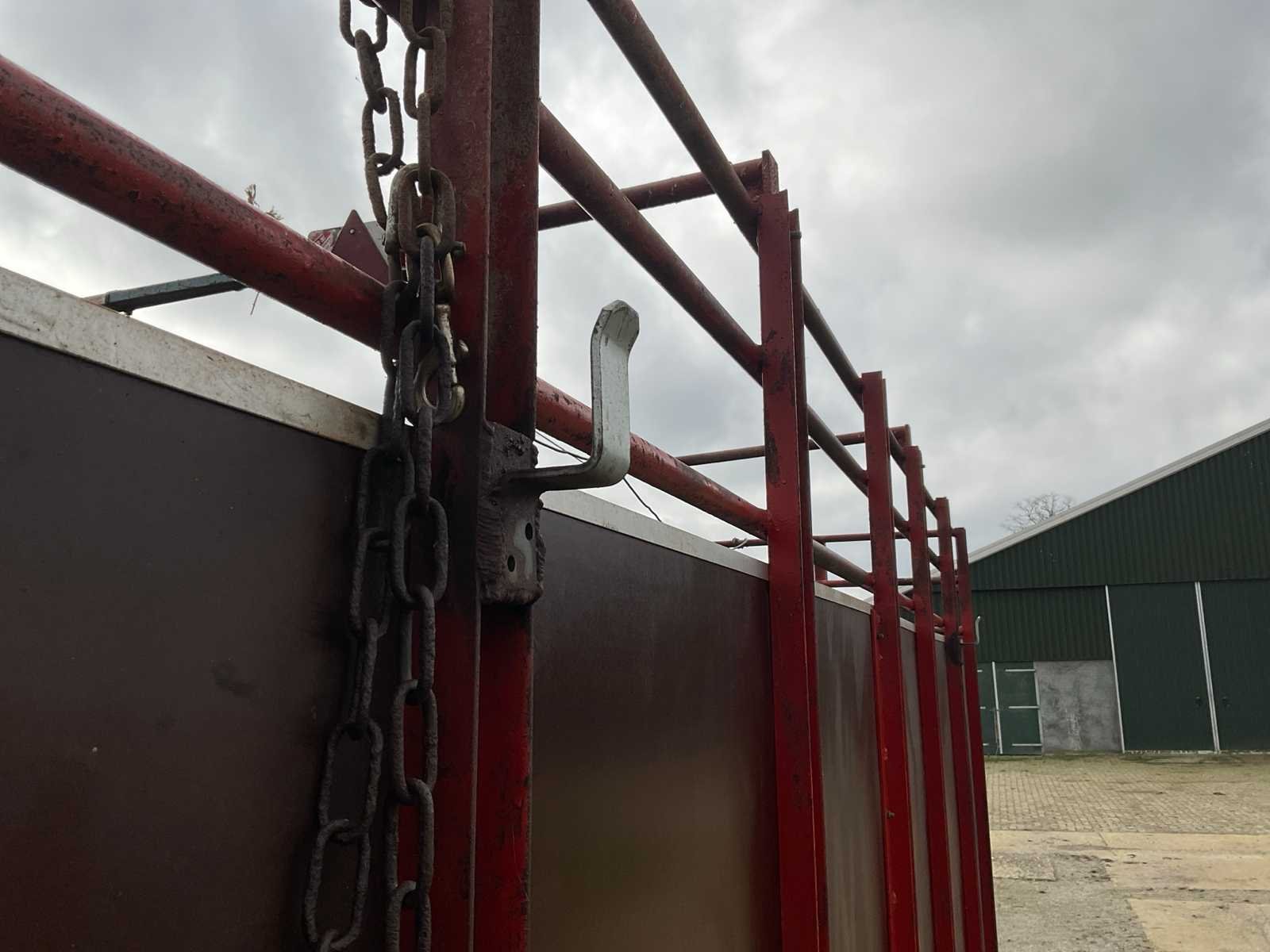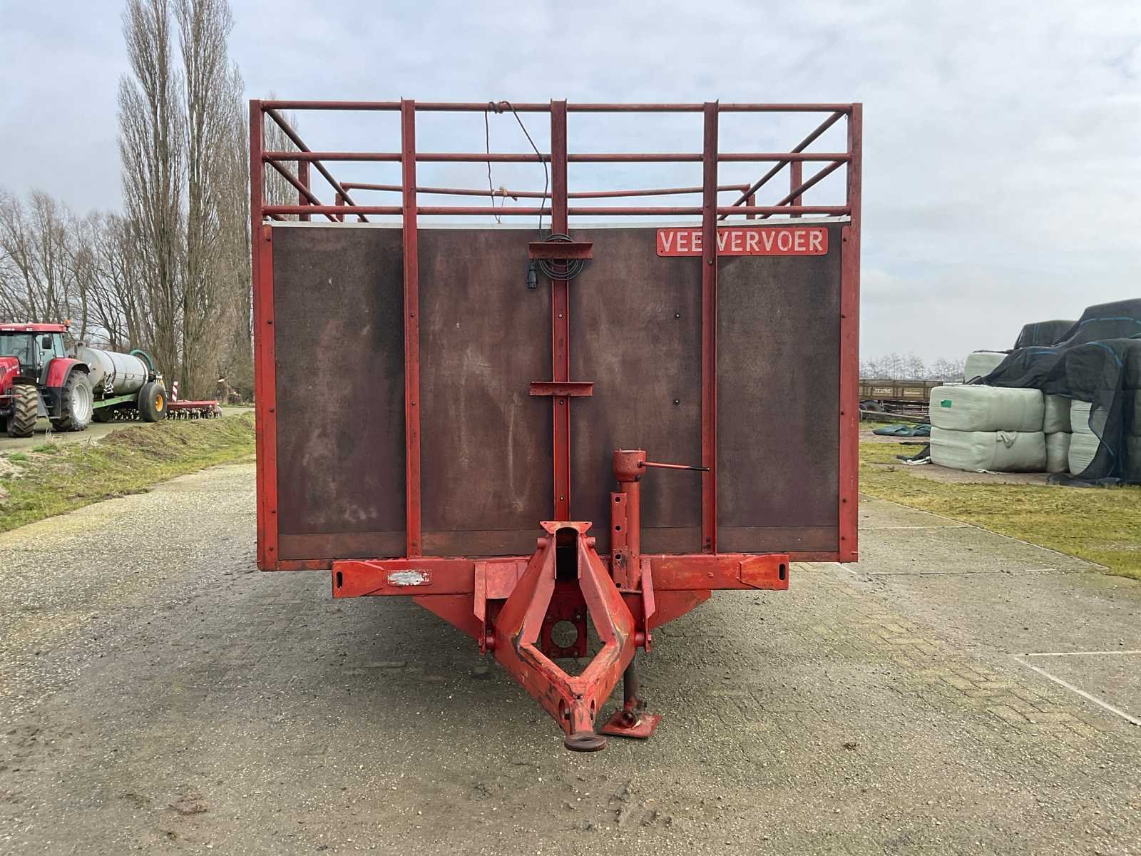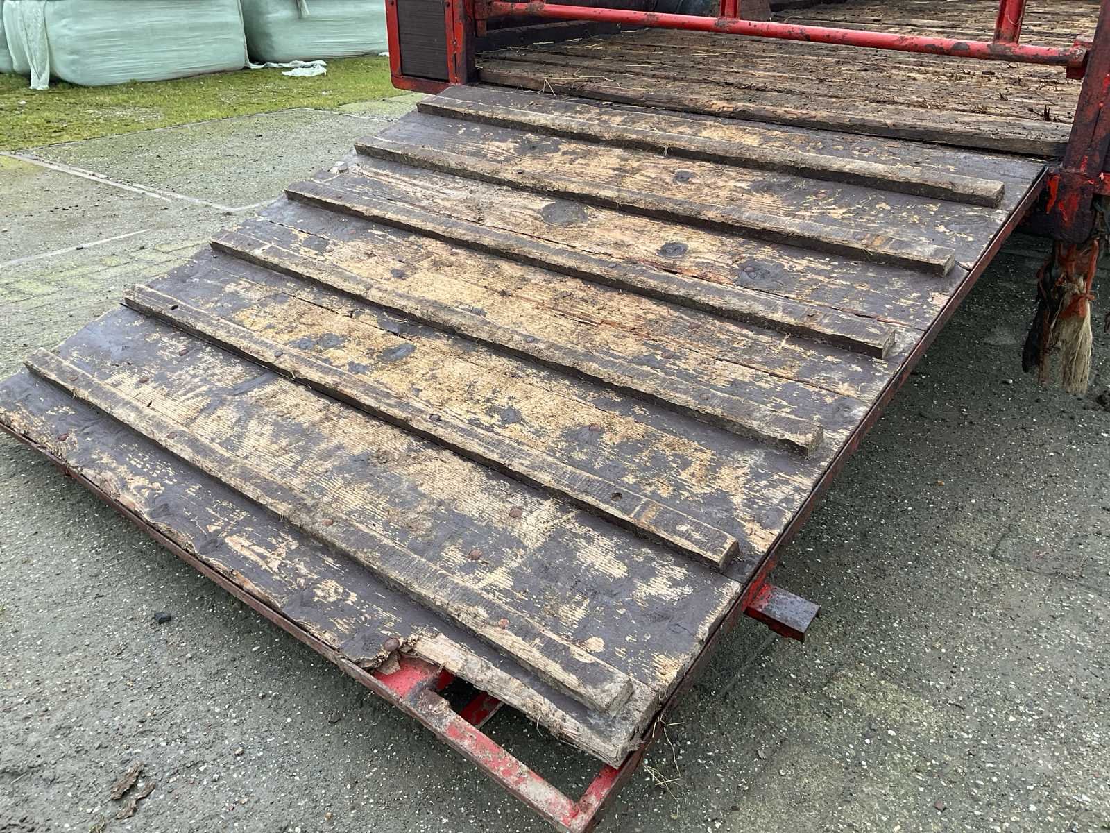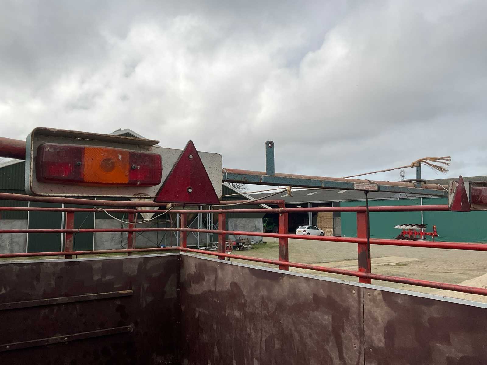Plaats voor 6 koeien, voorzien van: trekoog aanspan, steunpoot, Vredestein 11.5/89-15.3 banden, verlichting, beugels rechts voor veehekken, Nederlandse kentekenregistratie, No Merk: Krone Type: HSB 400 Serienummer: 2166 Kenteken: LNJ-12-T Afm. binnenzijde l.: 4750mm Afm. binnenzijde b: 2350mm Afm. binnenzijde h: 1480mm Totale afmeting L: 6350mm Totale afmeting Breedte: 2400mm Totale afmeting Hoogte: 2480mm