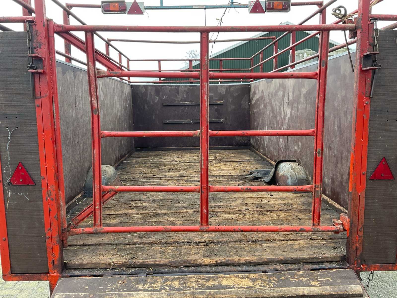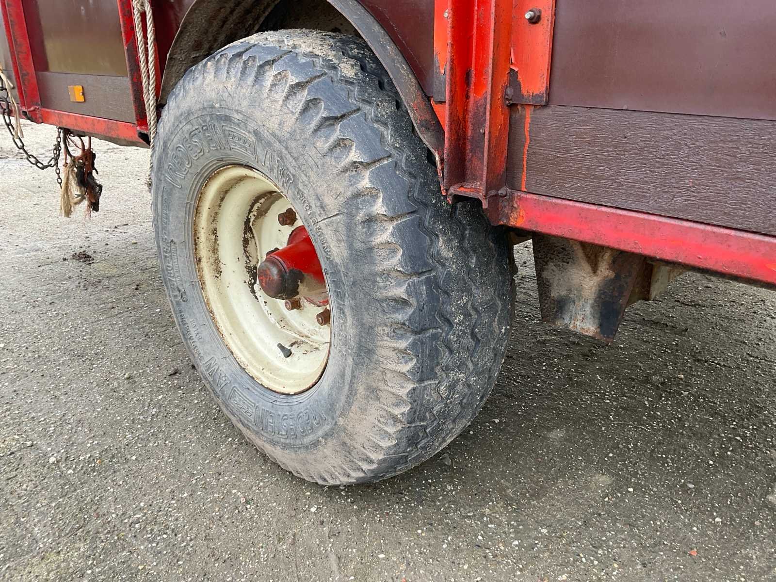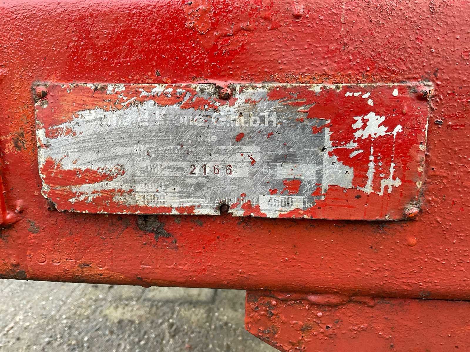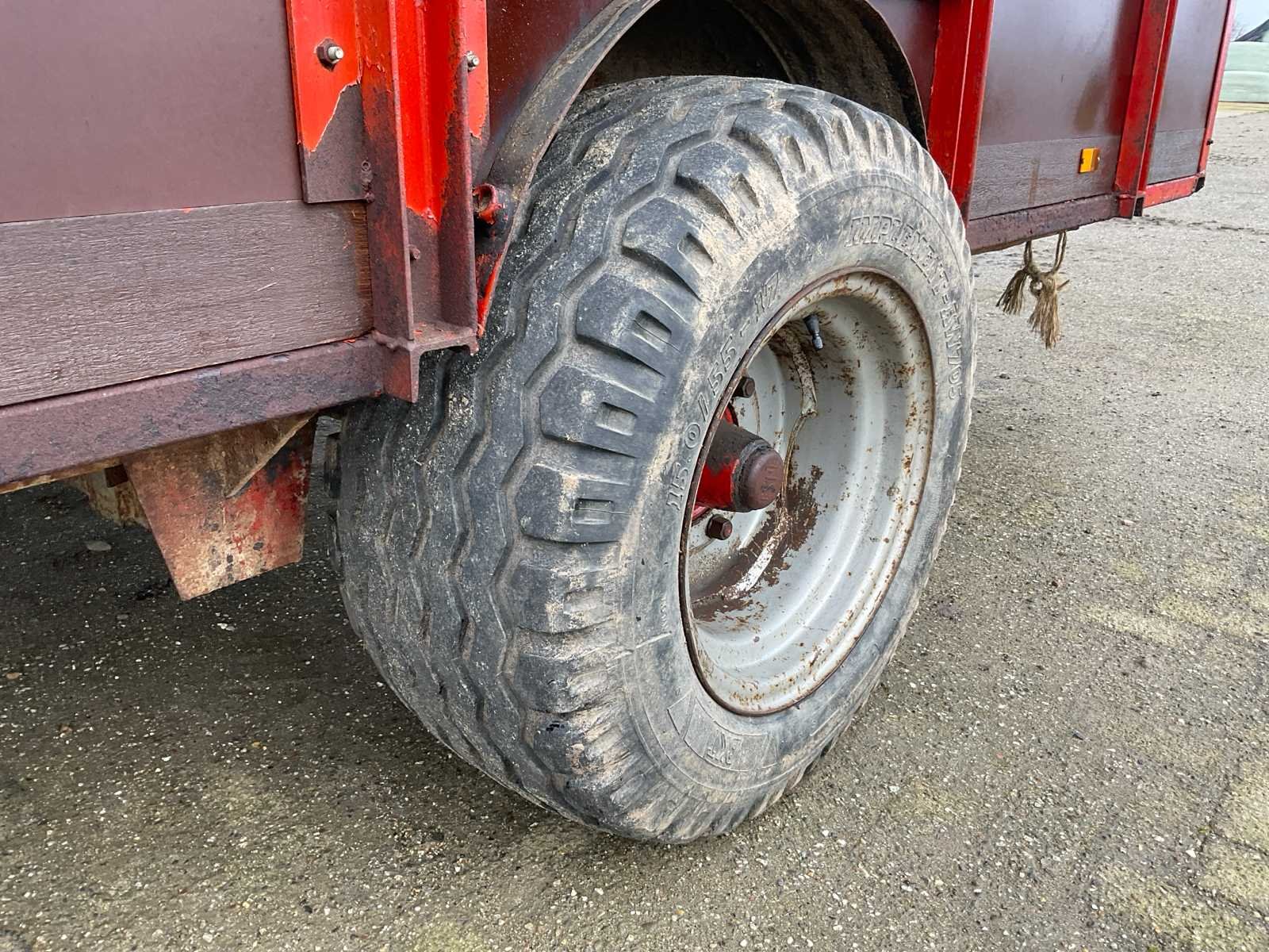 Plaats voor 6 koeien, voorzien van: trekoog aanspan, steunpoot, Vredestein 11.5/89-15.3 banden, verlichting, beugels rechts voor veehekken, Nederlandse kentekenregistratie, No Merk: Krone Type: HSB 400 Serienummer: 2166 Kenteken: LNJ-12-T Afm. binnenzijde l.: 4750mm Afm. binnenzijde b: 2350mm Afm. binnenzijde h: 1480mm Totale afmeting L: 6350mm Totale afmeting Breedte: 2400mm Totale afmeting Hoogte: 2480mm
