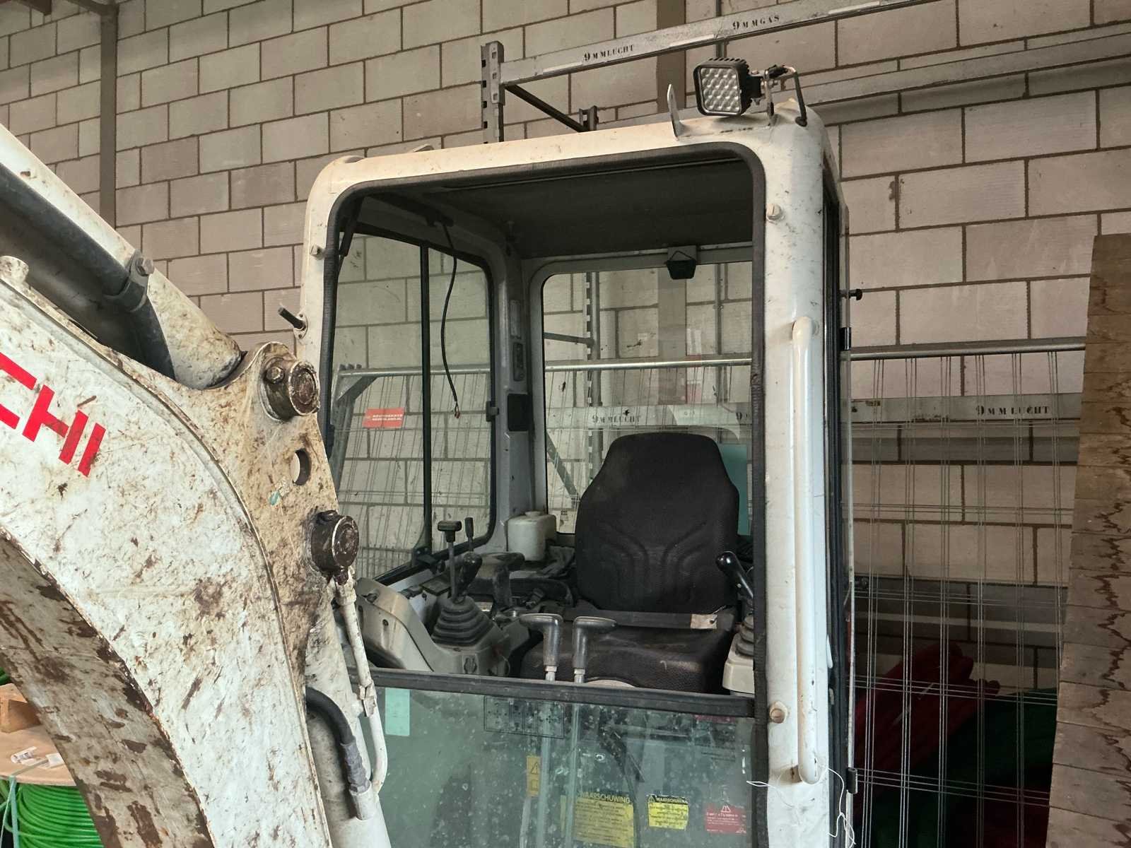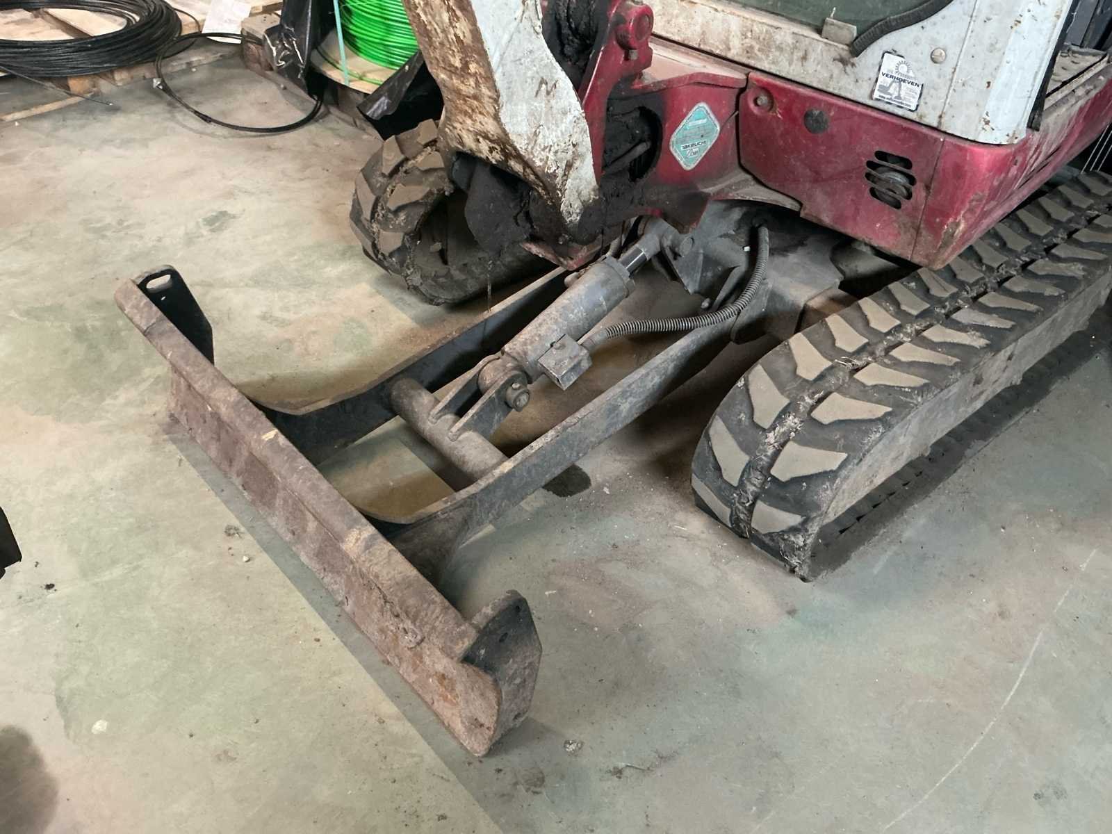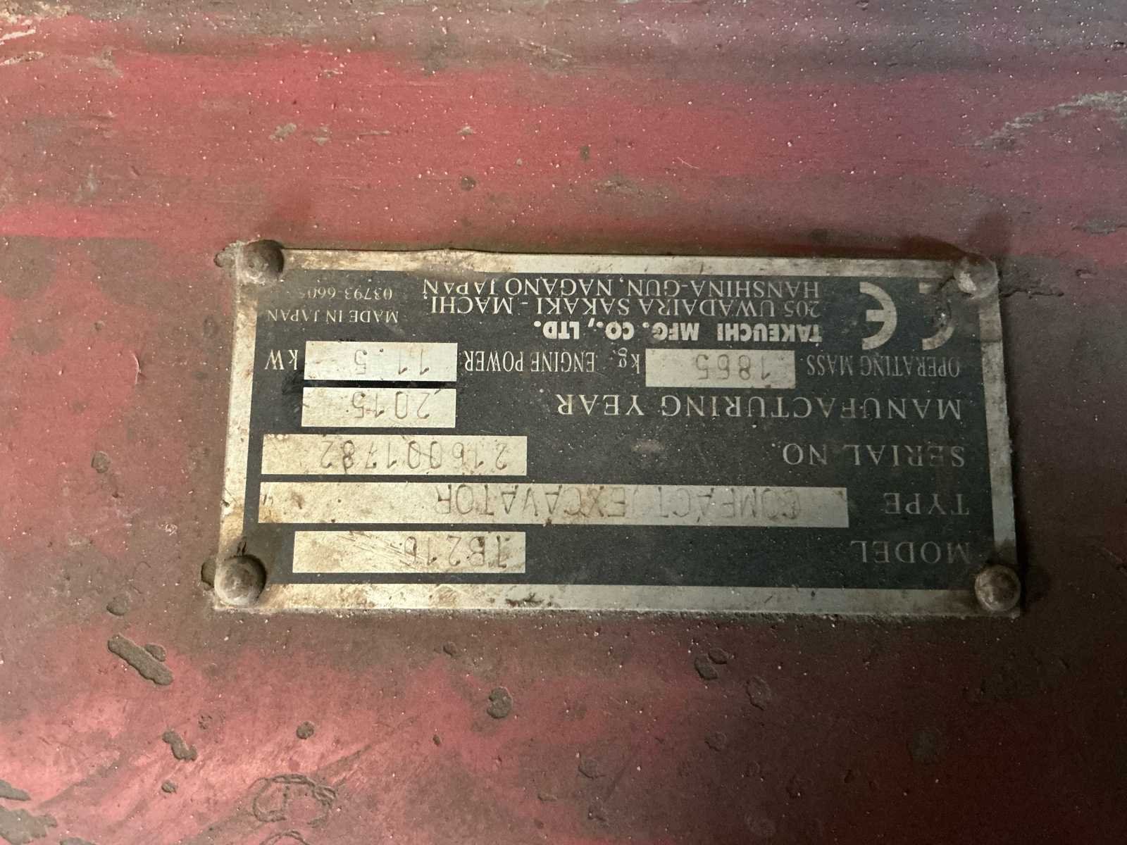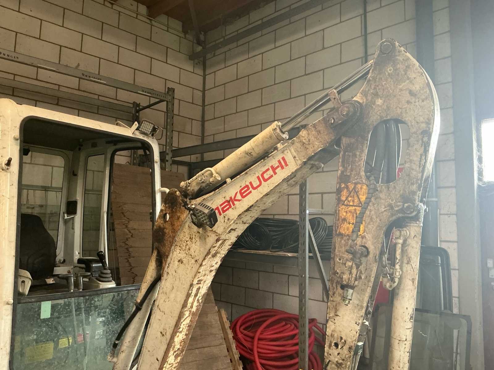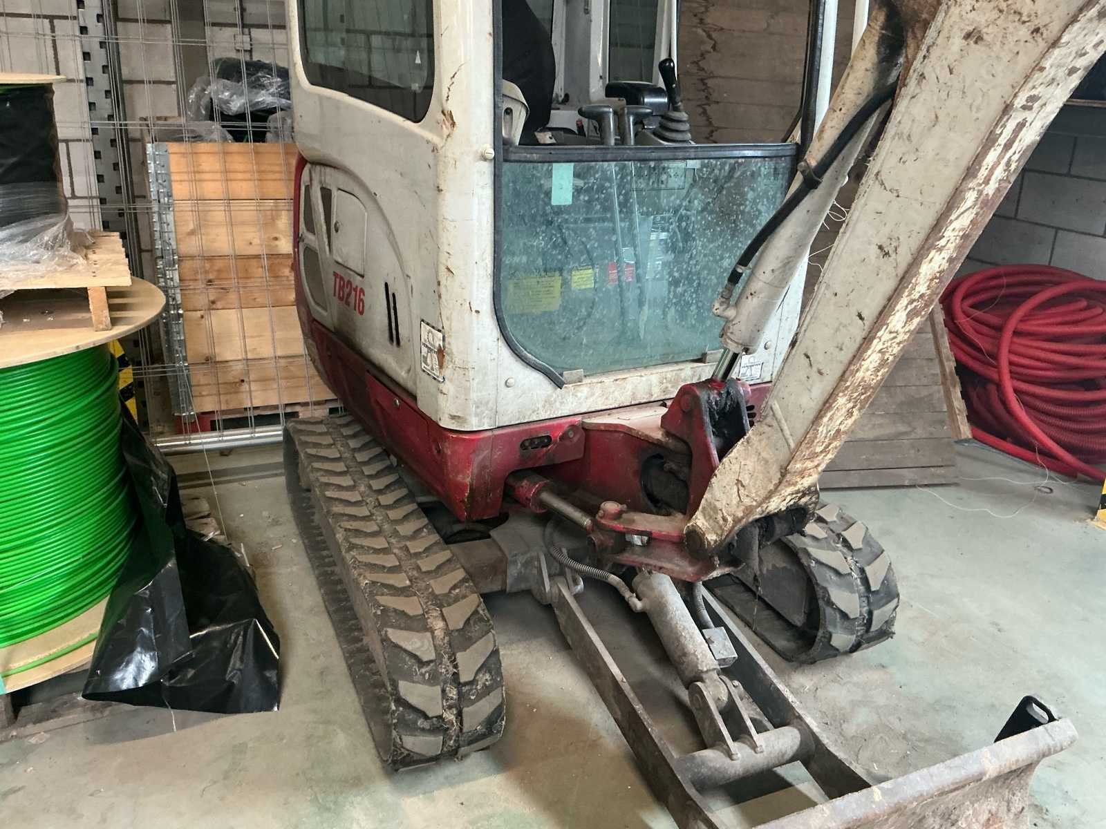 Snelheid: Max 4,2 km/uur. Motor inhoud: 854 cc. Uitbreekkracht bak: 14kN. Bandenbreedte is verstelbaar van 980-1300mm. Accu is leeg, hij doet het wel. Let op: er zit speling in de draaikrans en de giek. Voorruit en het deurtje moeten opnieuw gemonteerd worden. Nee Merk: Takeuchi Type: TB216 Bouwjaar: 2015 Merk motor: Yanmar Motorvermogen (kW): 15kW Aantal cilinders: 3 Brandstof: Diesel Bedrijfsgewicht: 1820kg Gieklengte: 4000mm Max. graafdiepte: 2390mm Inclusief graafbak: Nee Rups breedte: 230mm Afgelezen urenstand: 5436 Totale afmeting Breedte: 1300mm Totale afmeting Hoogte: 2360mm