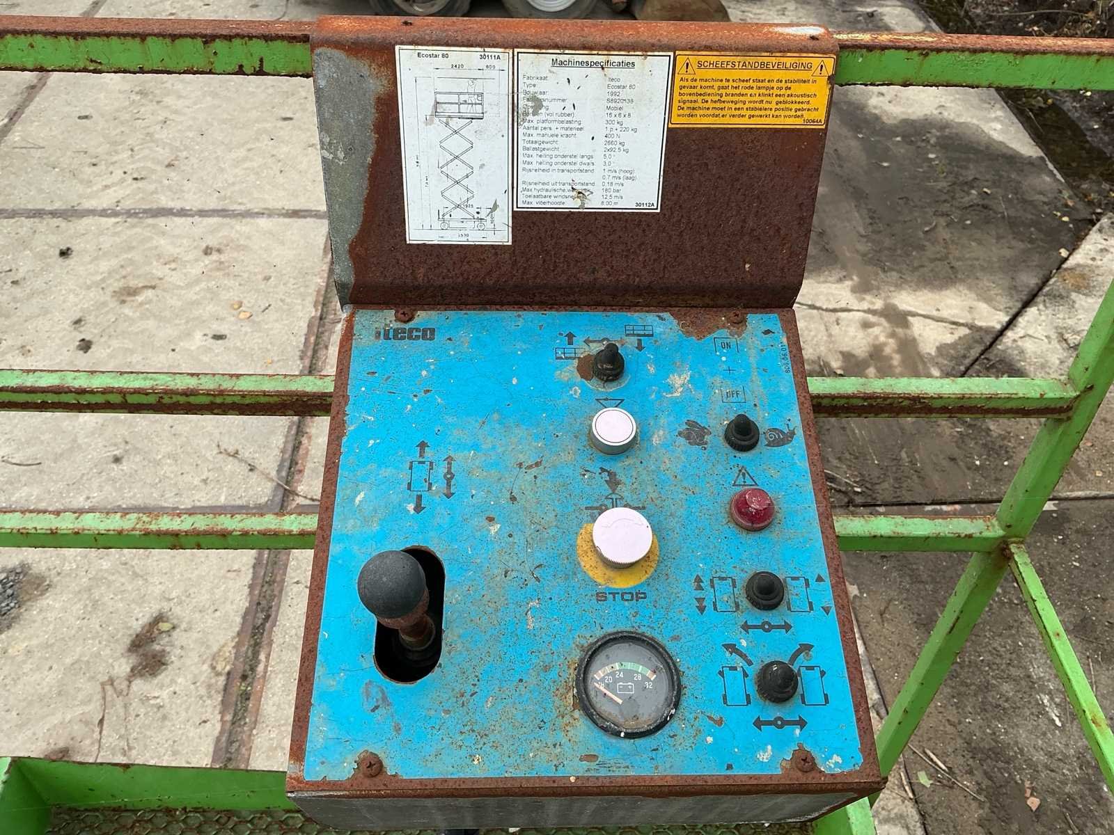 Voorzien van: uitschuifbaar platform, geen accu’s, werking onbekend. Nee Merk: Iteco Type: Ecostar 80 Bouwjaar: 1992 Serienummer: S8920138 Elektrisch: true Schaarhoogwerker: true Werkhoogte: 7900mm Plateau afm. l: 1600mm Plateau afm. b: 720mm Platform capaciteit: 300kg Eigen gewicht: 2660kg Totale afmeting L: 2010mm Totale afmeting Breedte: 1000mm Totale afmeting Hoogte: 1700mm