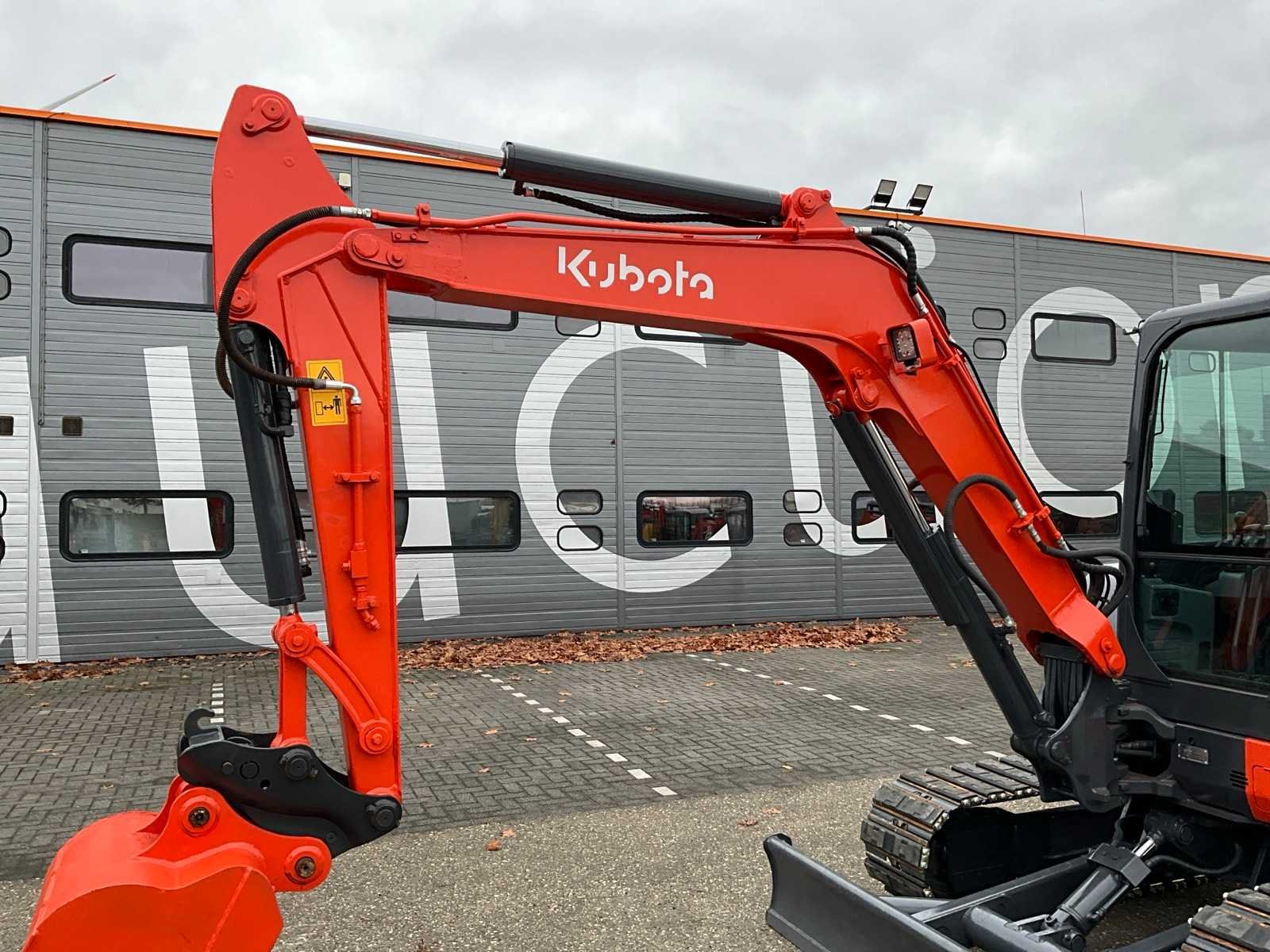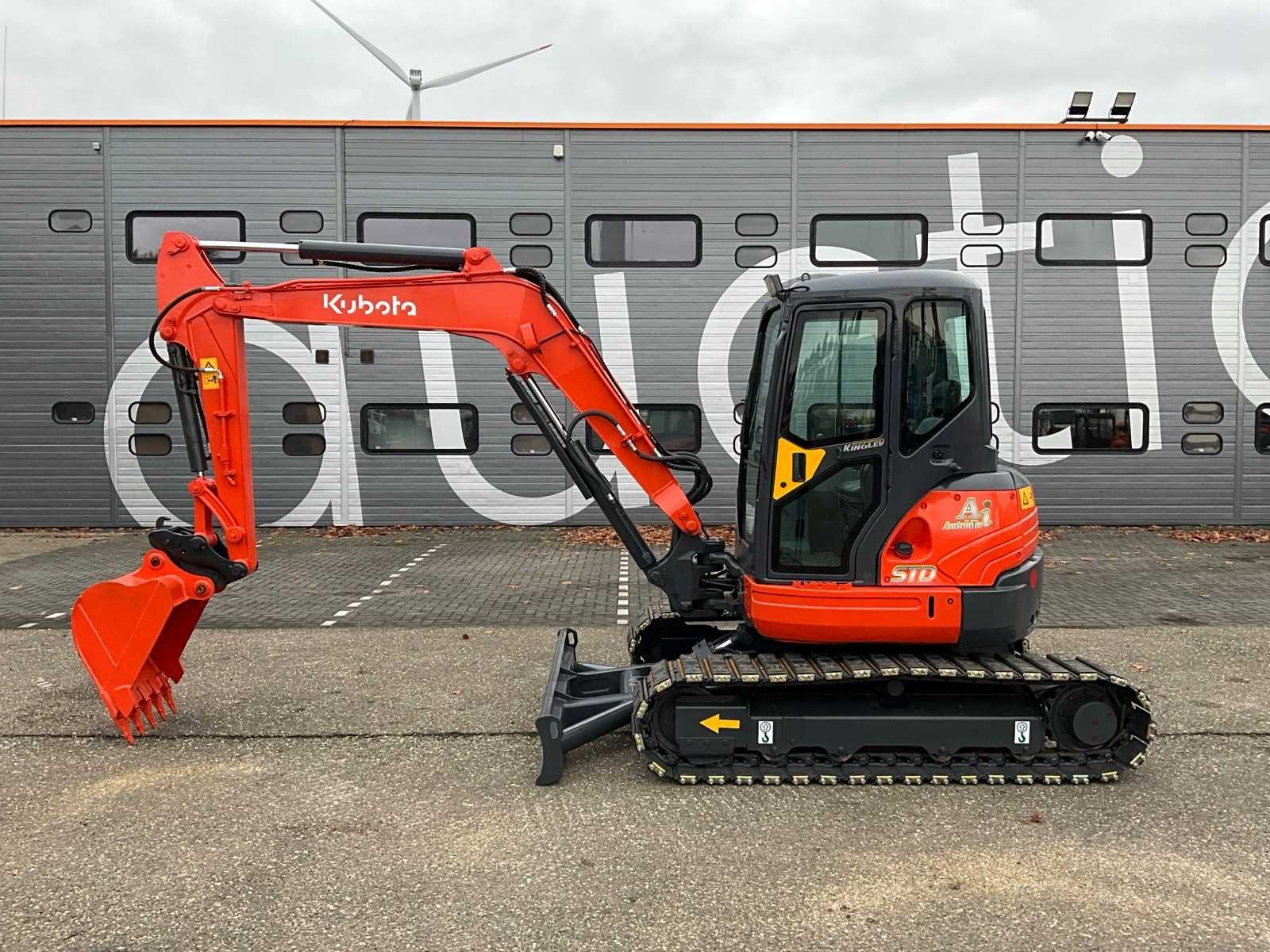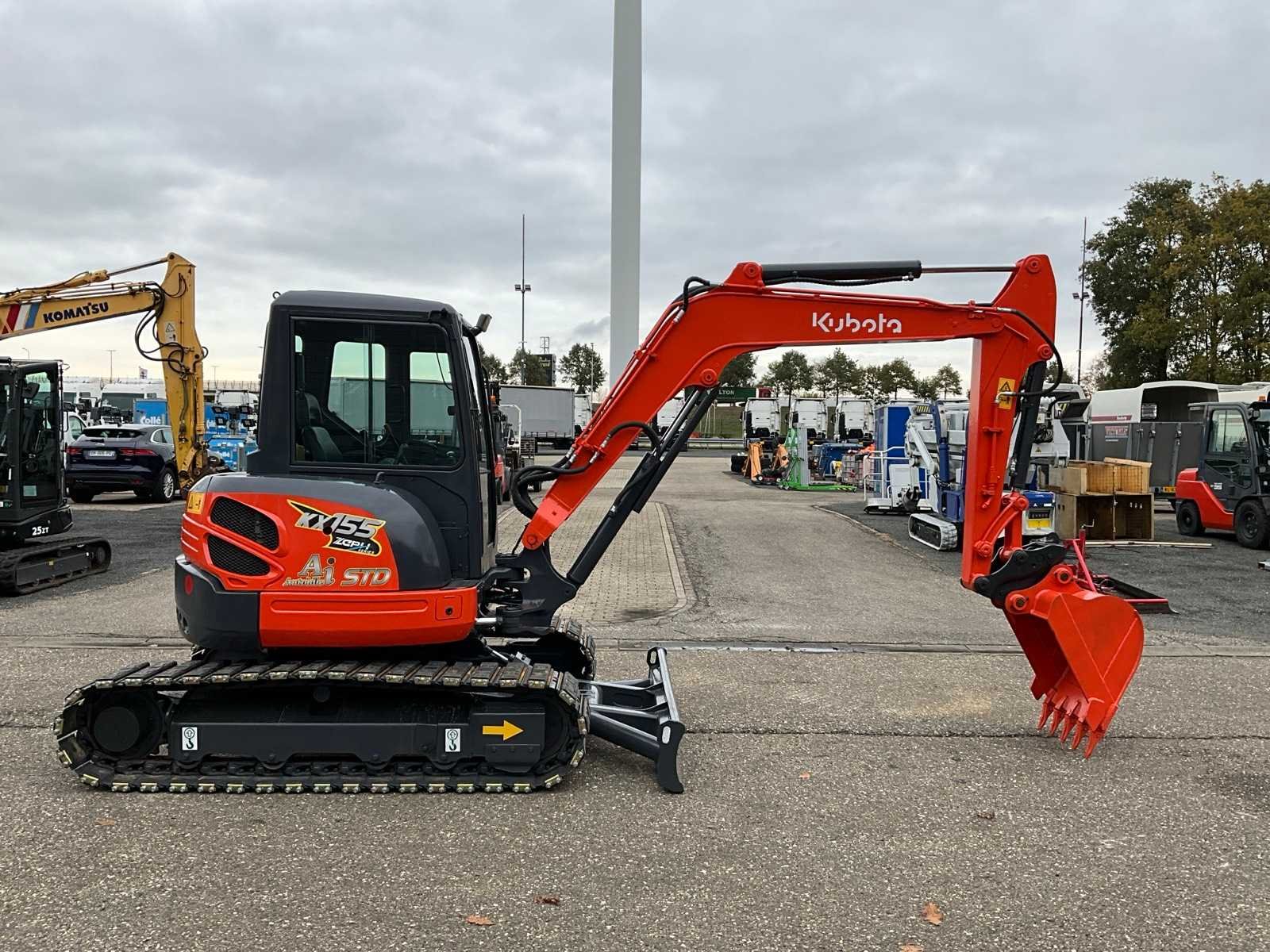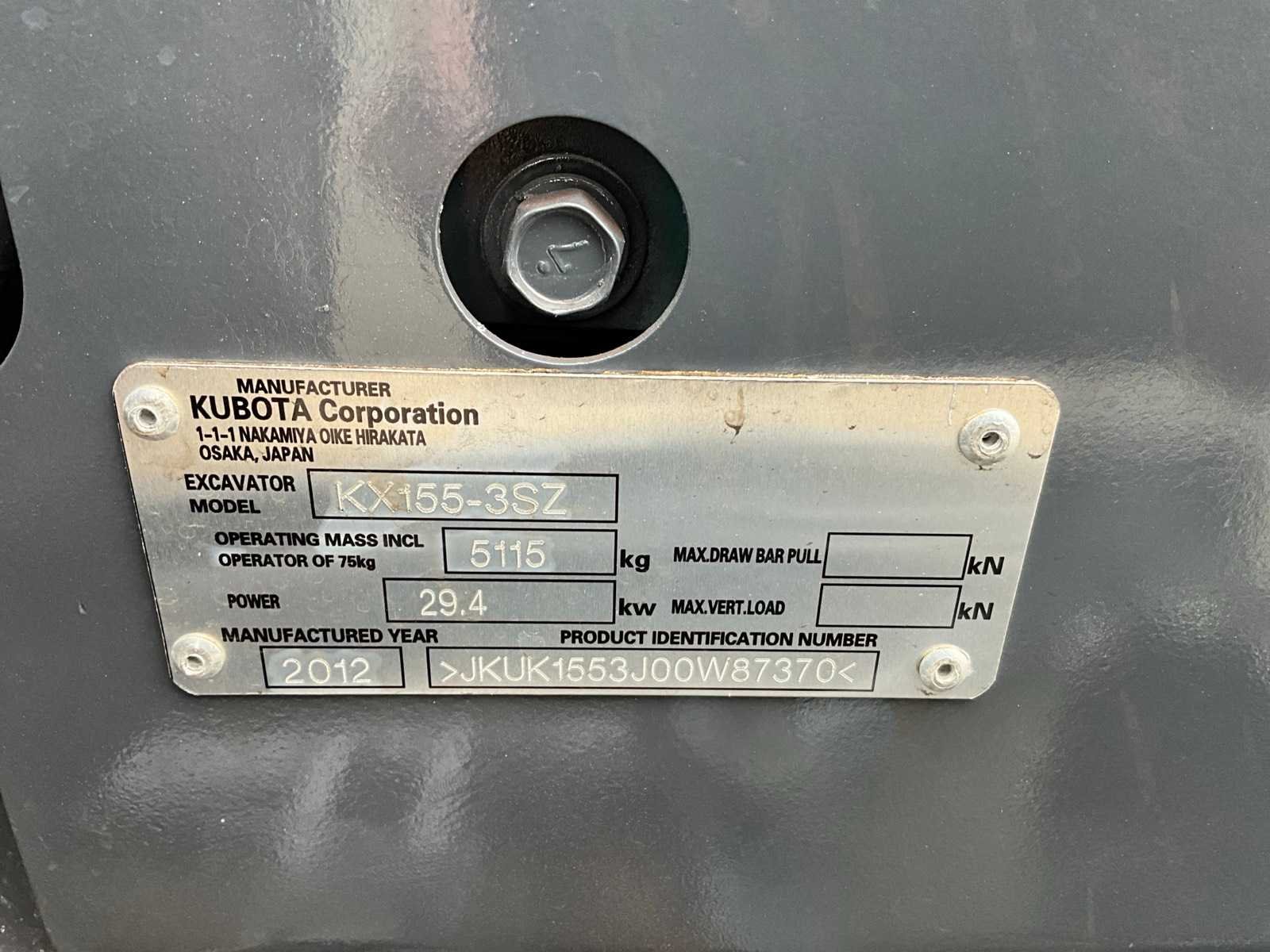 Mechanische snelwissel, dieplepel met tanden 700mm, extra hydraulische functie, zwenkgiek, schuifblad, stalen rupsen met rubber pads, Nee Merk: Kubota Type: KX155-3SZ Bouwjaar: 2012 Serienummer: 87370 Merk motor: Kubota Motorvermogen (kW): 30kW Aantal cilinders: 4 Brandstof: Diesel Bedrijfsgewicht: 5115kg Met graafbak: true Graafbak afm. b: 700mm Rups breedte: 400mm Cabine: true Afgelezen urenstand: 3720 Totale afmeting L: 5800mm Totale afmeting Breedte: 2000mm Totale afmeting Hoogte: 2600mm